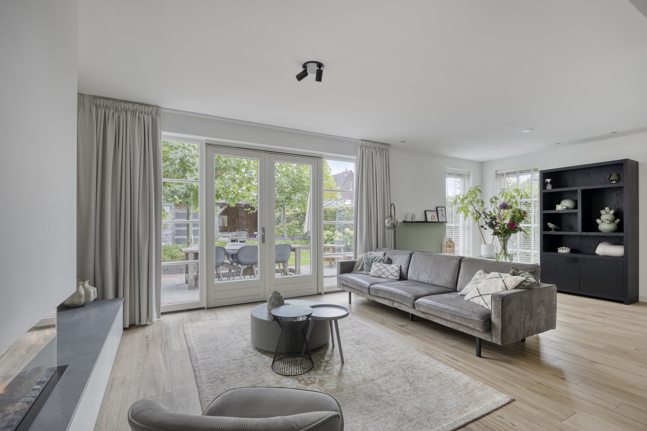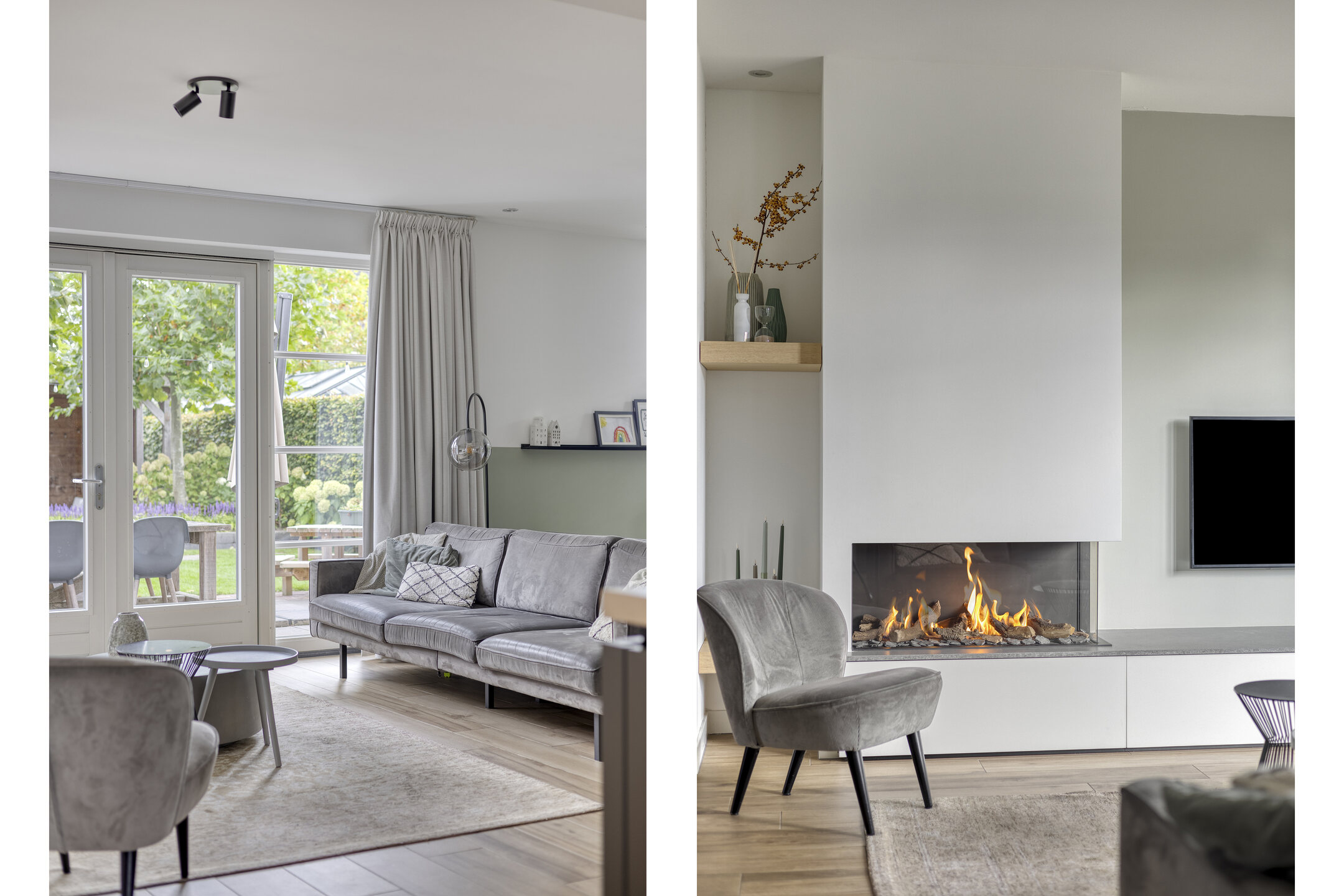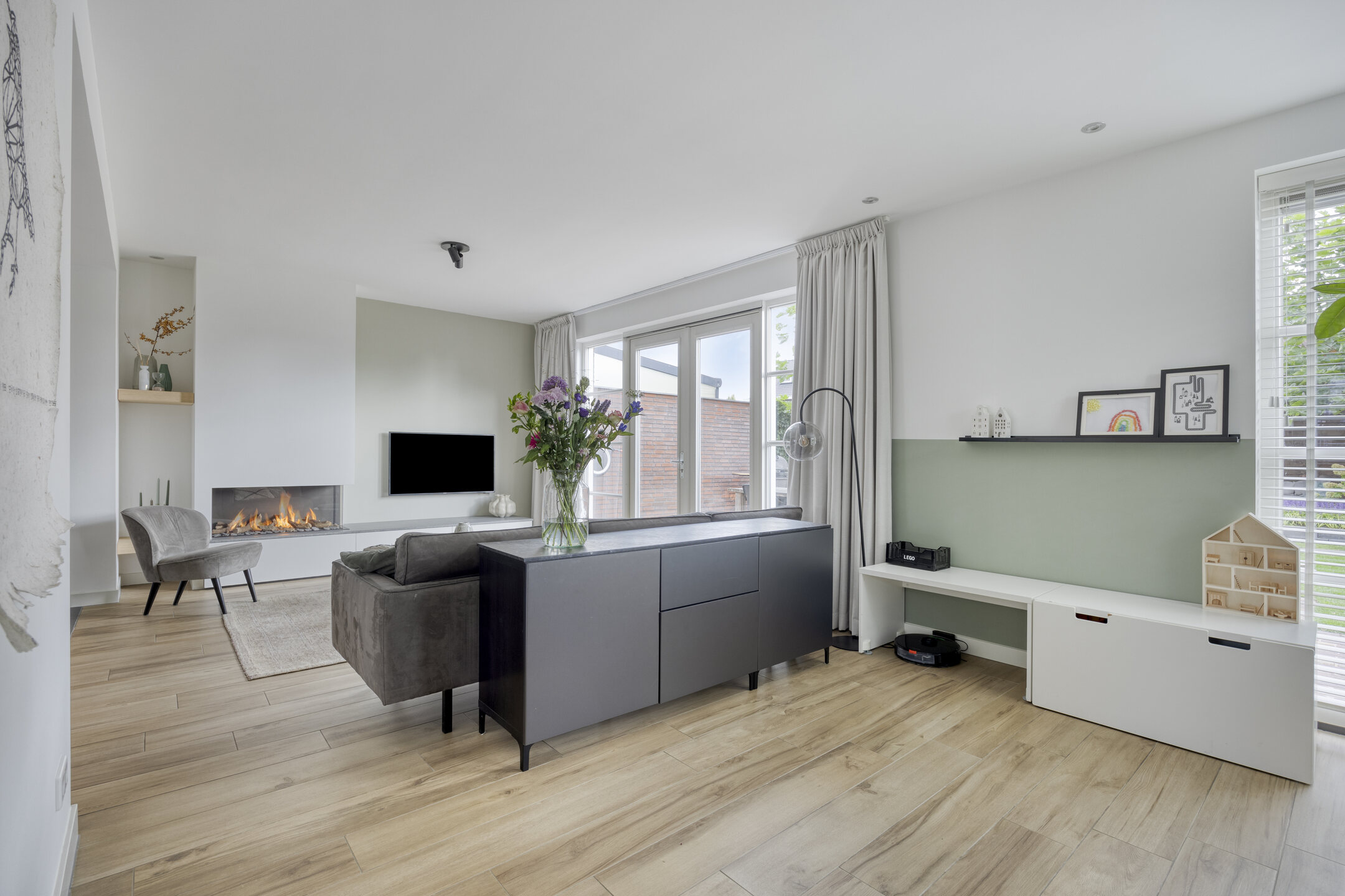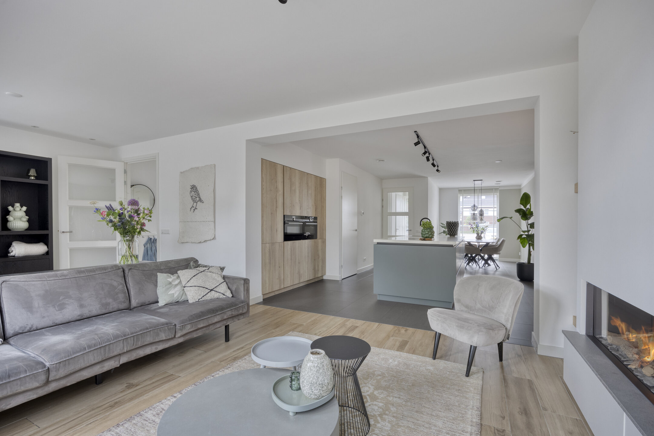 Begane grond: hal met meterkast, toiletruimte met wandcloset en fonteintje. De royaal uitgebouwde woonkamer is opgedeeld in een eetkamer met centraal gelegen keuken en aan de achterzijde een zeer royale zitkamer, voorzien van een gashaard en openslaande tuindeuren. De open keuken is zeer luxe ingericht in 20... en voorzien van o.a. een kookeiland. In de aangebouwde bijkeuken bevinden zich de aansluitingen t.b.v. het witgoed.
