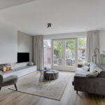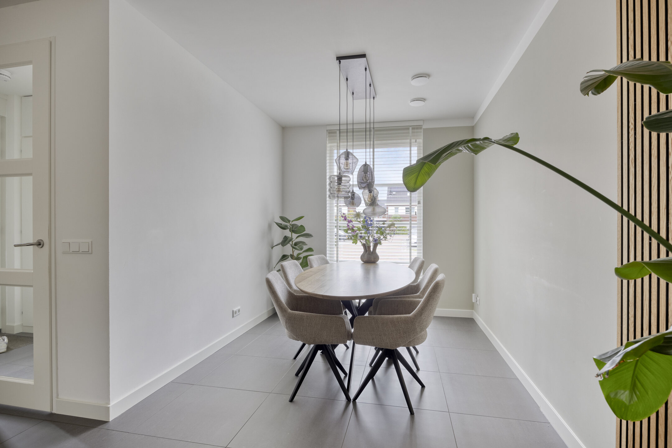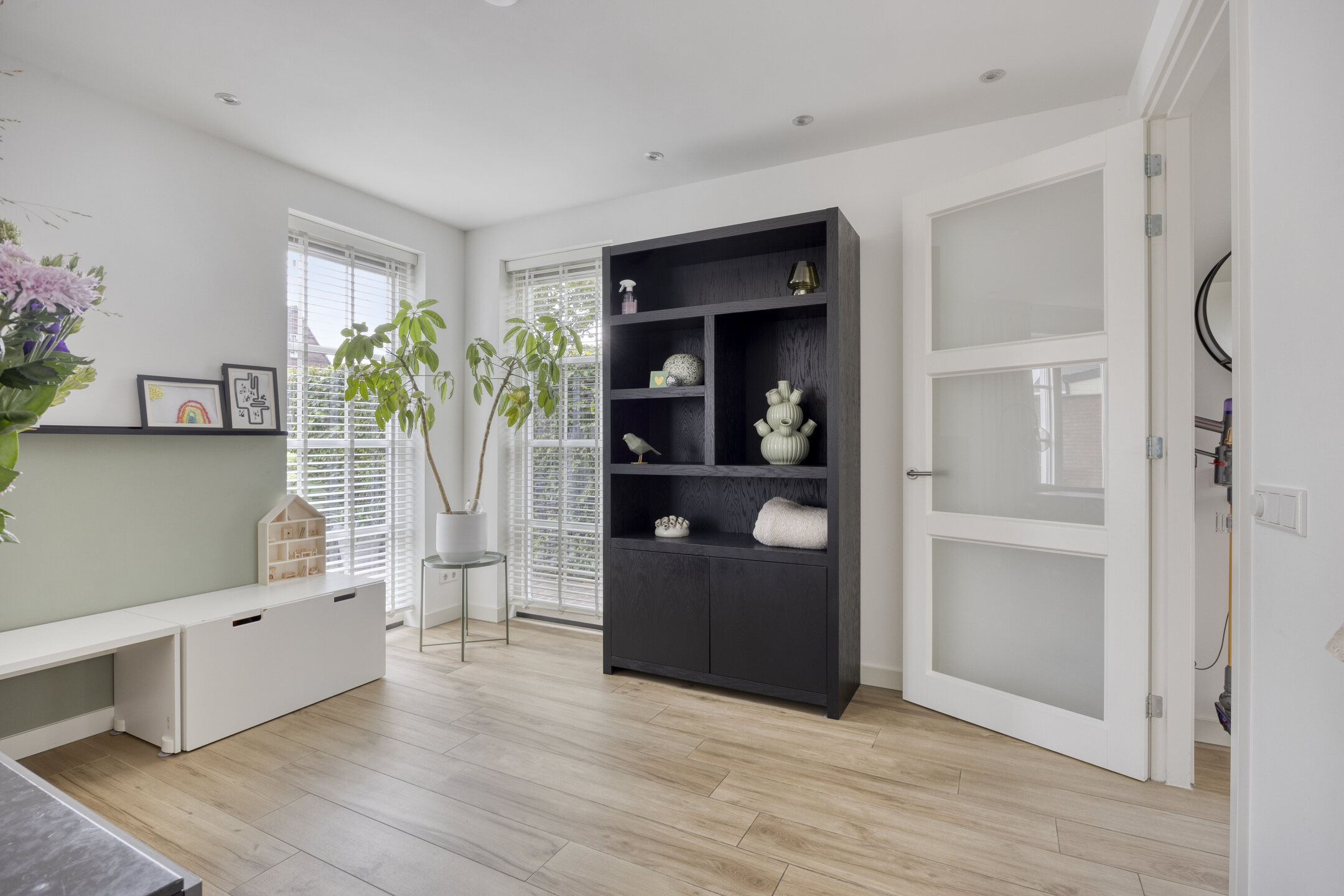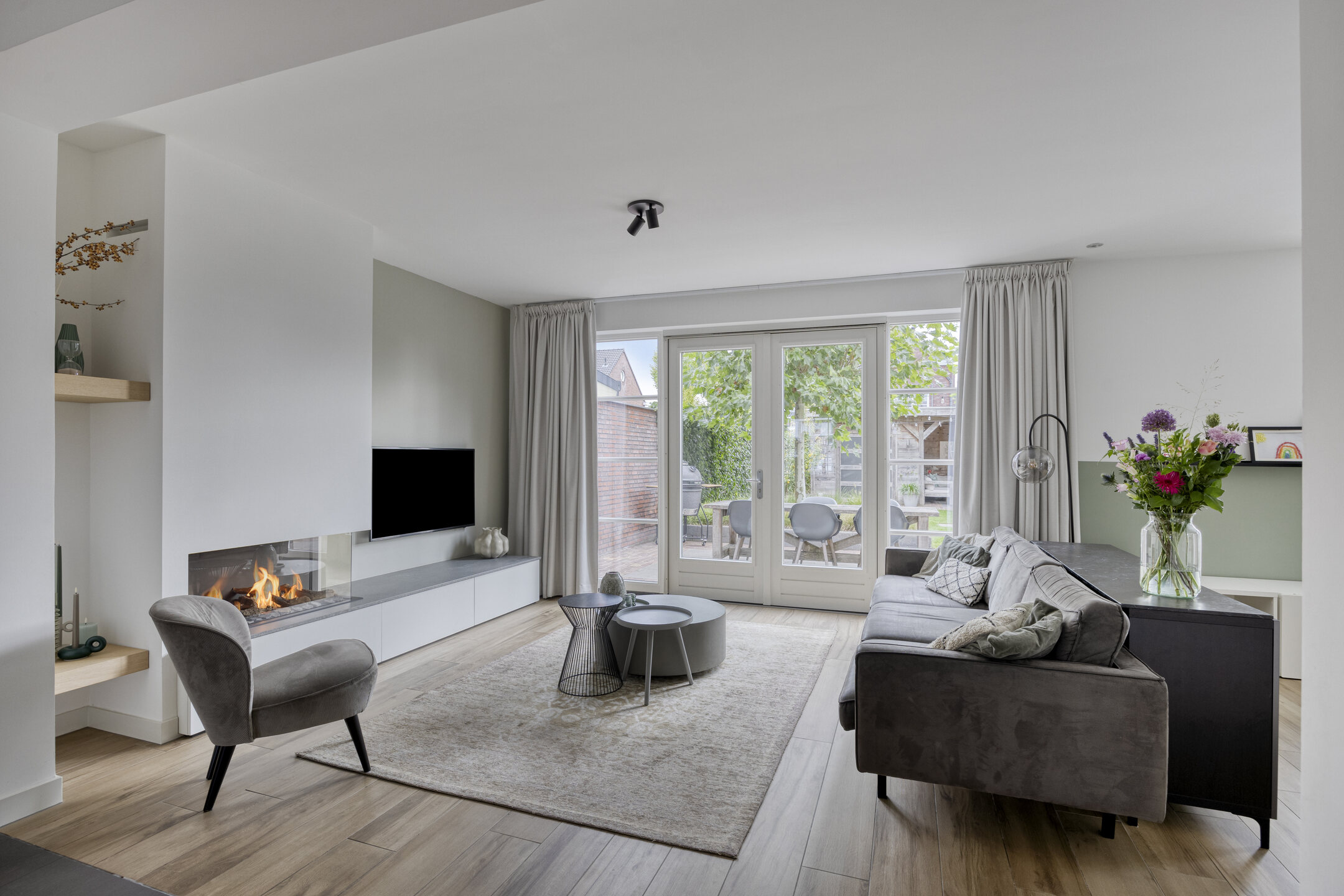 Begane grond: hal met meterkast, toiletruimte met wandcloset en fonteintje. De royaal uitgebouwde woonkamer is opgedeeld in een eetkamer met centraal gelegen keuken en aan de achterzijde een zeer royale zitkamer, voorzien van een gashaard en openslaande tuindeuren. De open keuken is zeer luxe ingericht in 20... en voorzien van o.a. een kookeiland. In de aangebouwde bijkeuken bevinden zich de aansluitingen t.b.v. het witgoed.