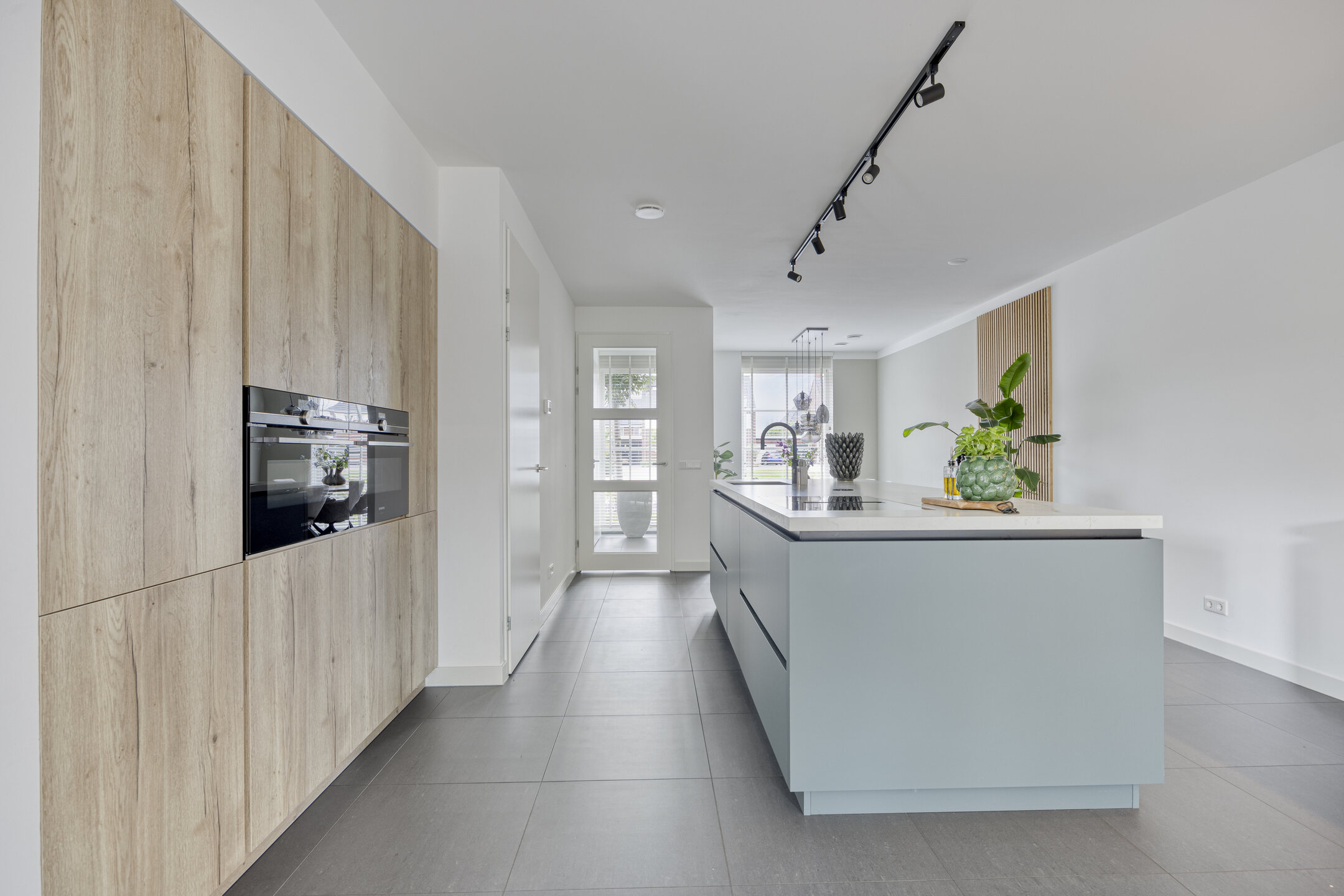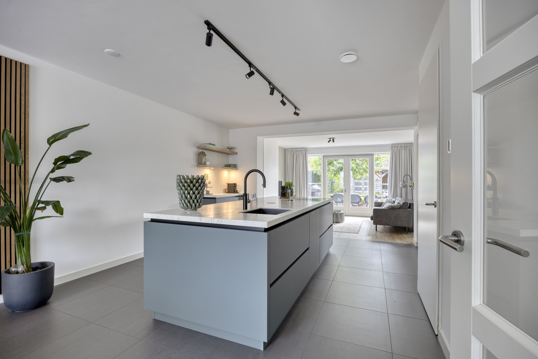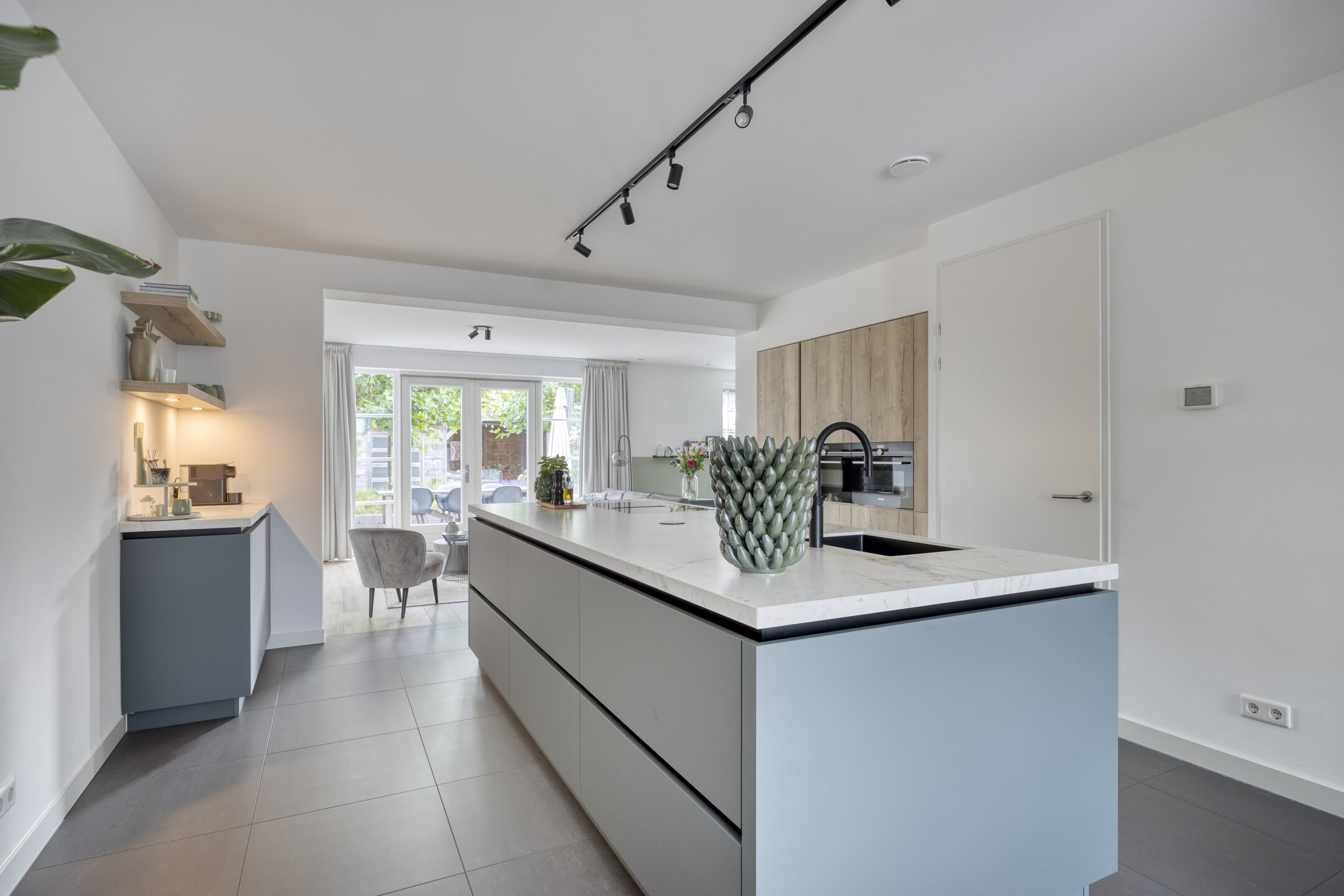 De luxe keukenopstelling is in 2022 compleet vernieuwd en luxe ingericht met o.a. een kookeiland met een inductiekookplaat met geïntegreerde afzuiging, oven, combimagnetron, vaatwasser en Quooker.