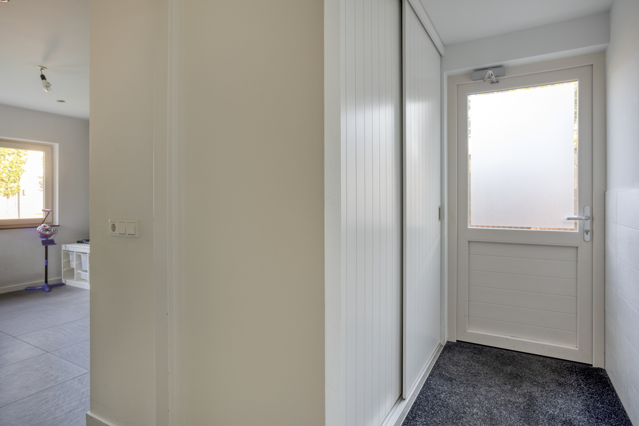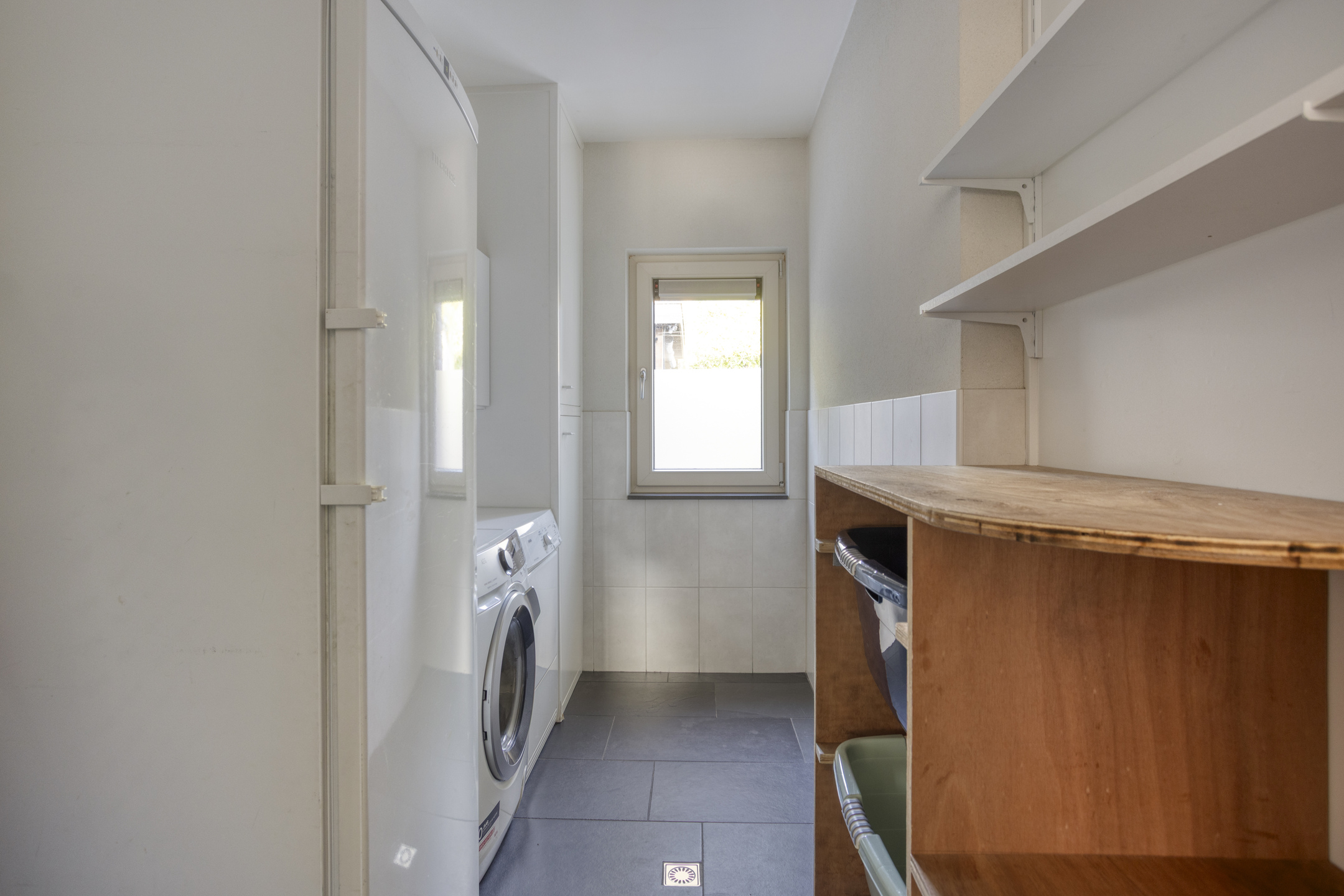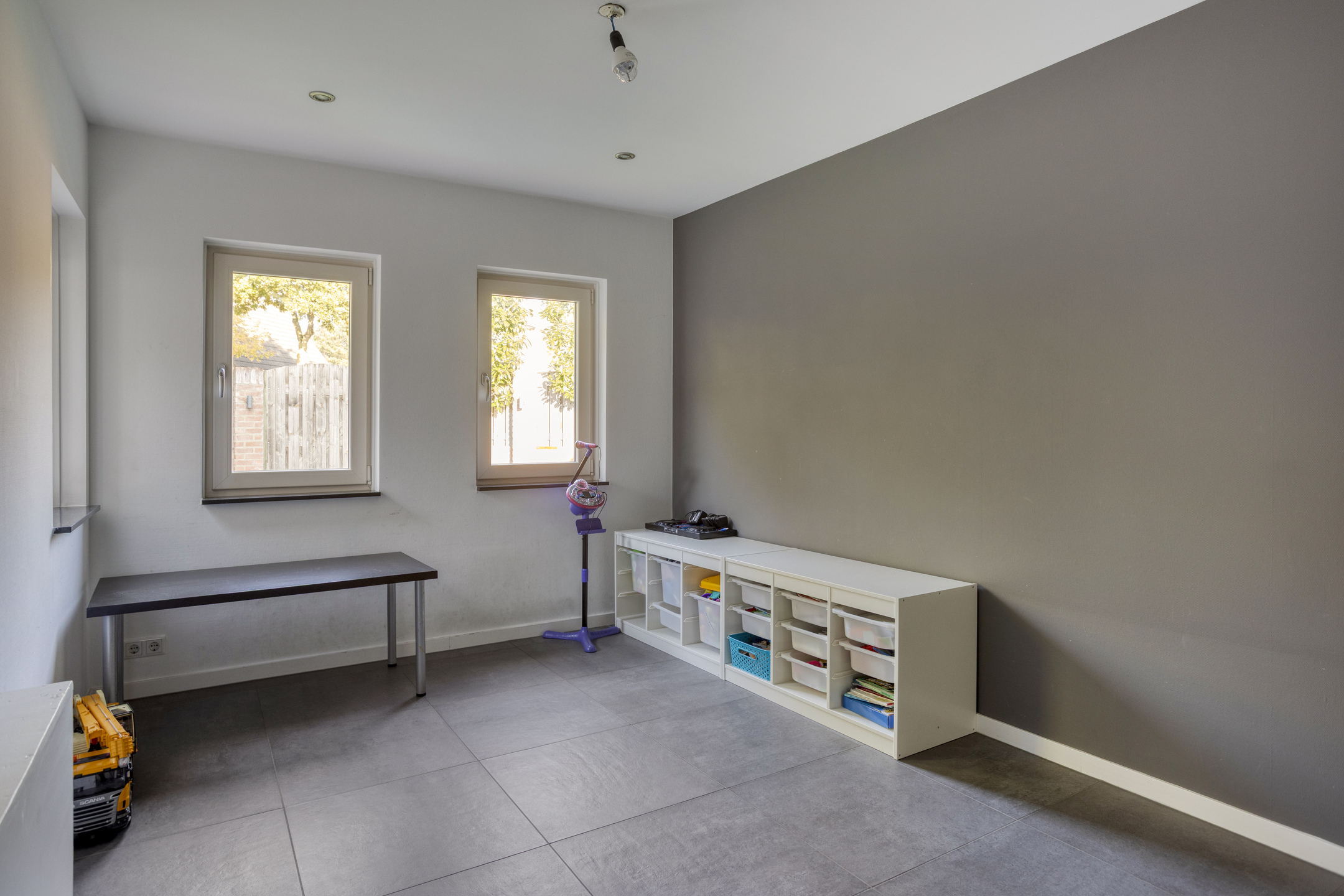 Begane grond: hal met meterkast en toiletruimte voorzien van zwevend toilet en fonteintje, ruime woonkamer met verrassende indeling door een moderne keuken in het midden van de ruimte, aan de achterzijde bevindt zich nog een eetgedeelte, praktische bijkeuken met de witgoedaansluitingen en cv-opstelling. Portaal met toegang tot de inpandige garage en kamer die o.a. ingericht kan worden als kantoorruimte, slaapkamer of speelruimte.