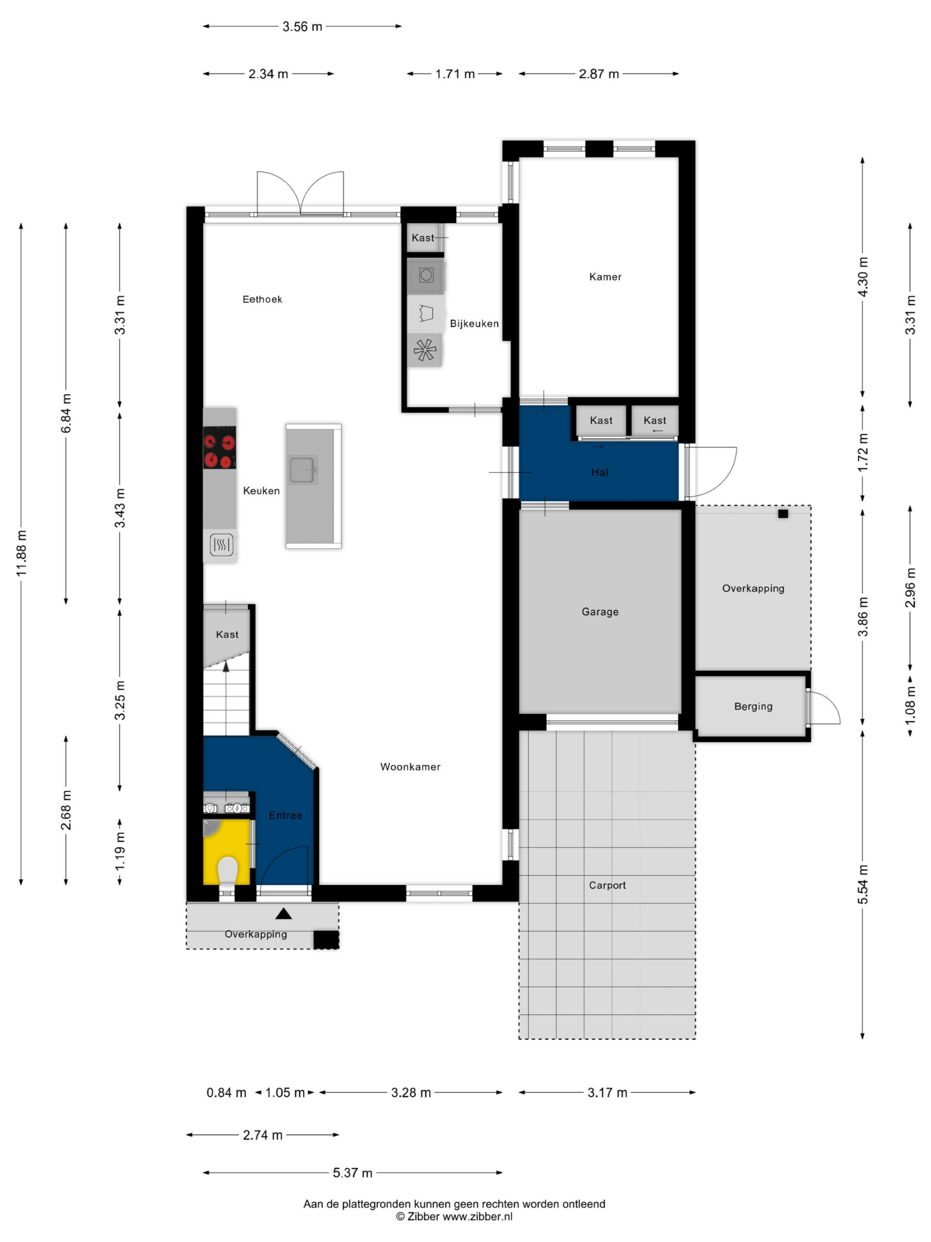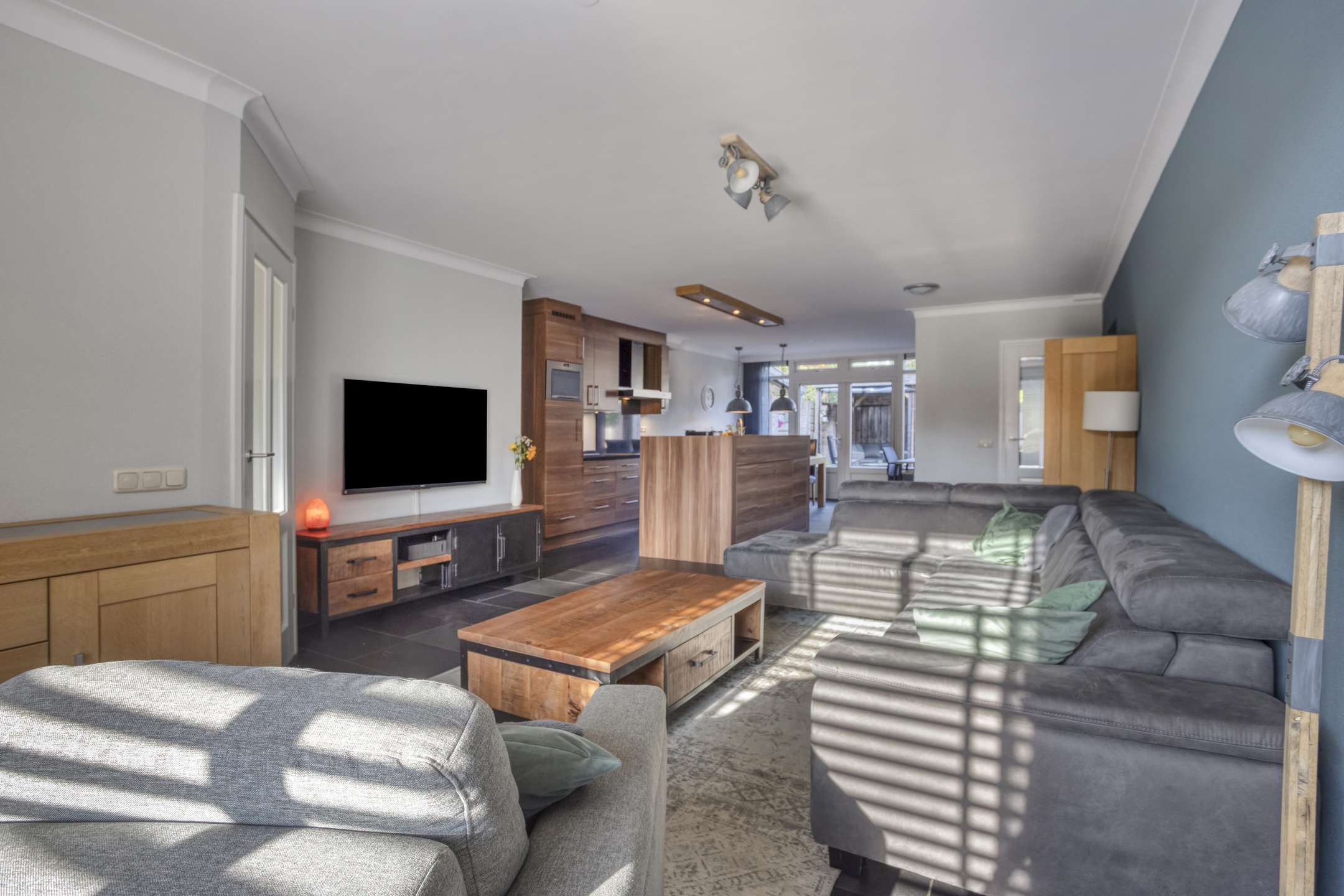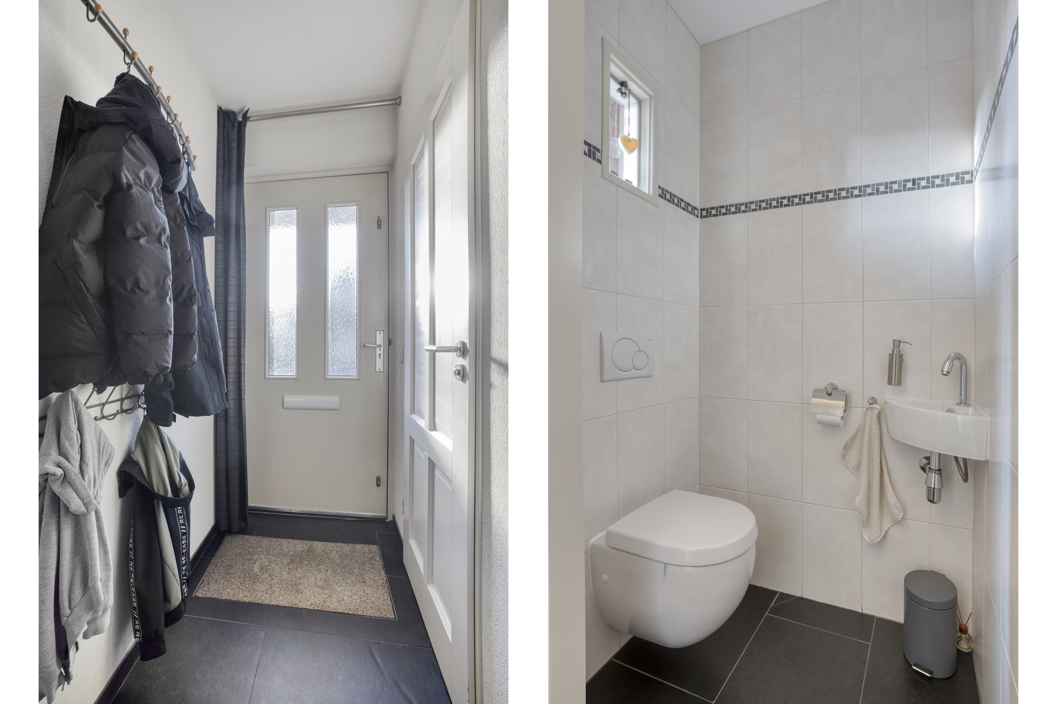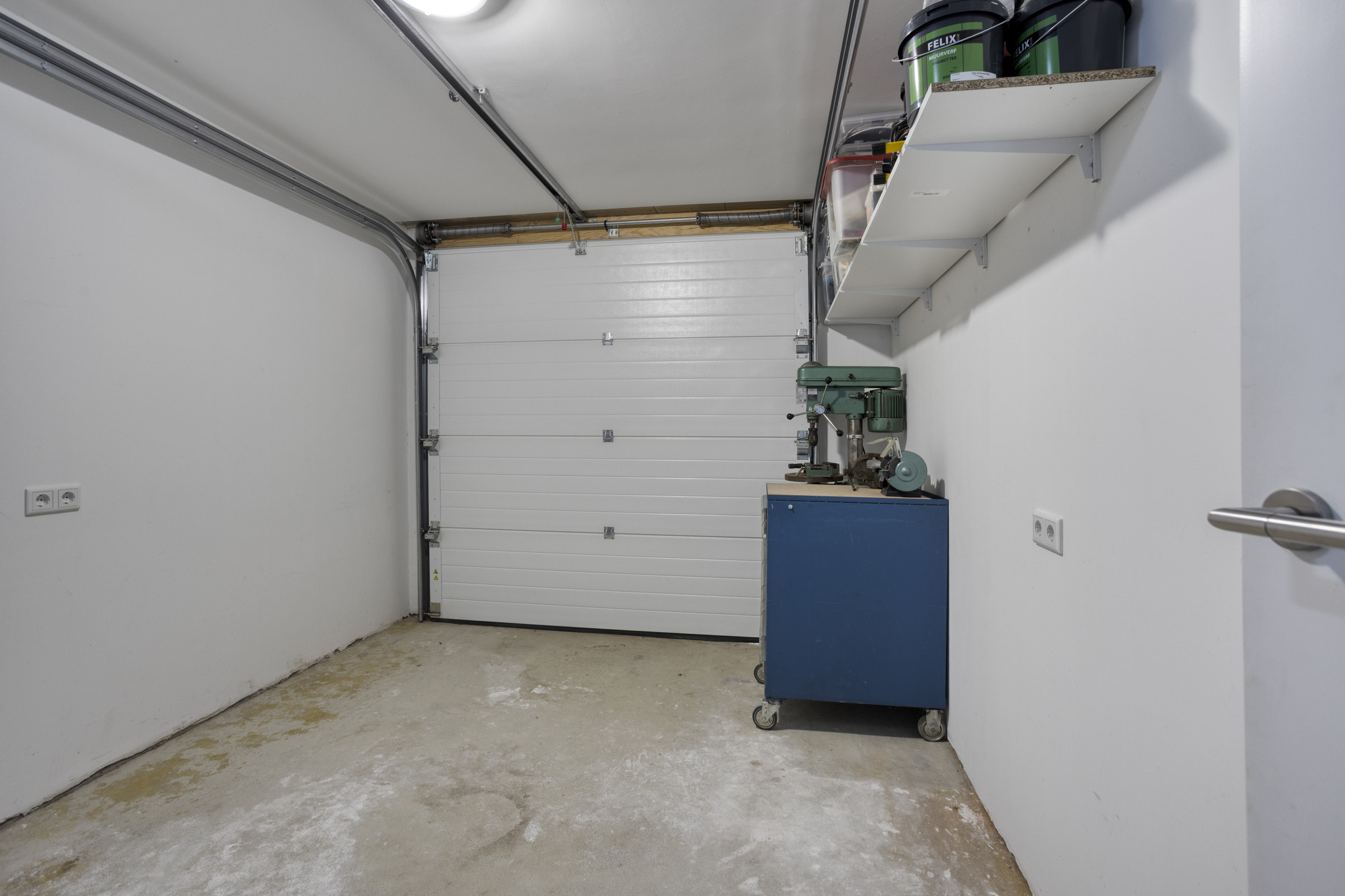 Begane grond: hal met meterkast en toiletruimte voorzien van zwevend toilet en fonteintje, ruime woonkamer met verrassende indeling door een moderne keuken in het midden van de ruimte, aan de achterzijde bevindt zich nog een eetgedeelte, praktische bijkeuken met de witgoedaansluitingen en cv-opstelling. Portaal met toegang tot de inpandige garage en kamer die o.a. ingericht kan worden als kantoorruimte, slaapkamer of speelruimte.