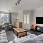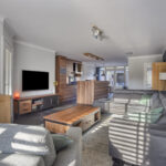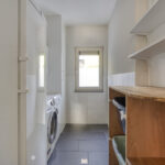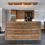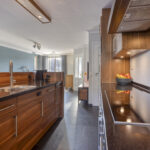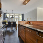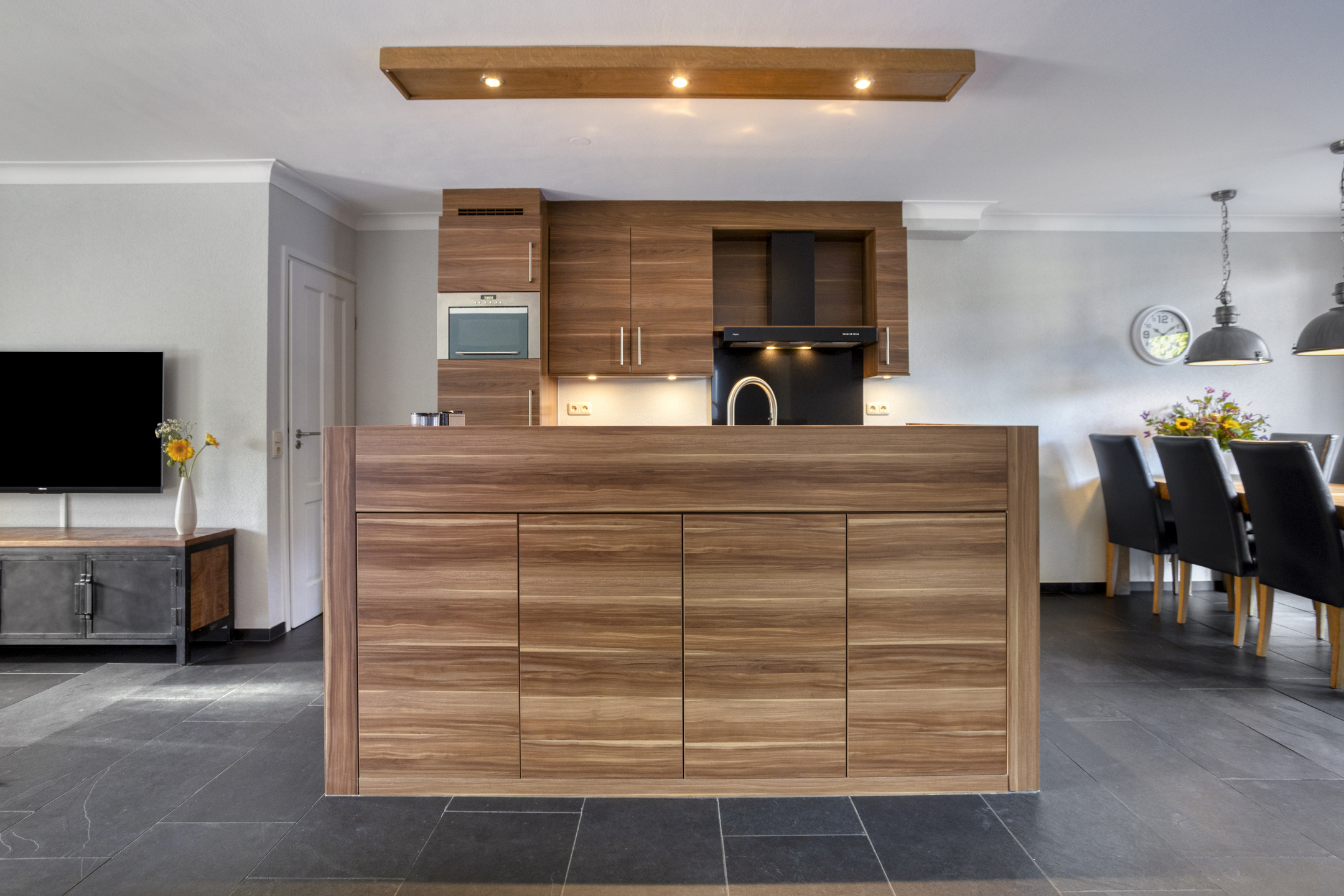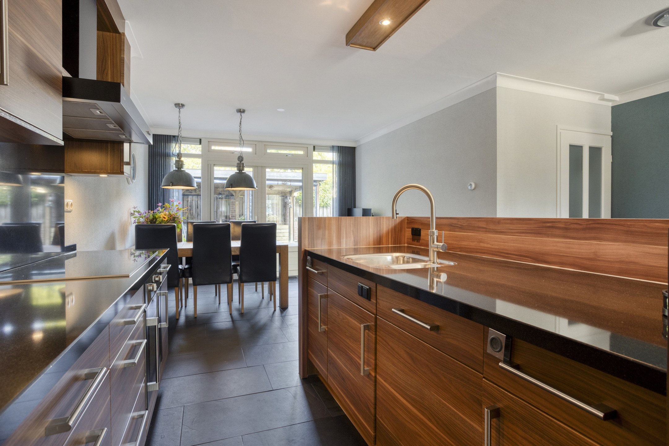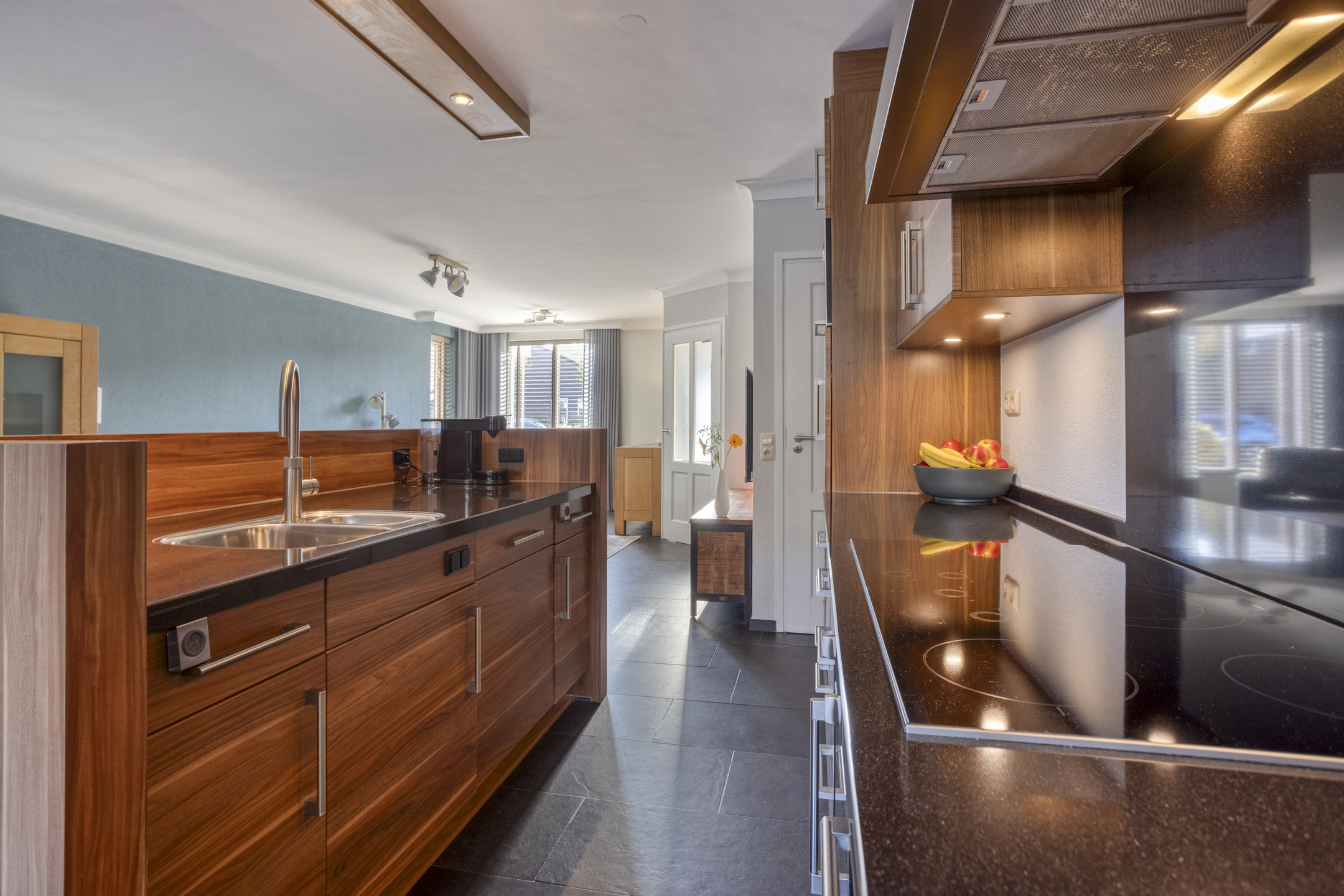 De keukenopstelling is voorzien van een oven, magnetron, koelkast, inductiekookplaat met afzuiging, vaatwasser en een Quooker.