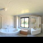 1e verdieping: overloop met een vaste kast, 3 slaapkamers, badkamer voorzien van een ligbad, douche, wandcloset en wastafel met meubel.