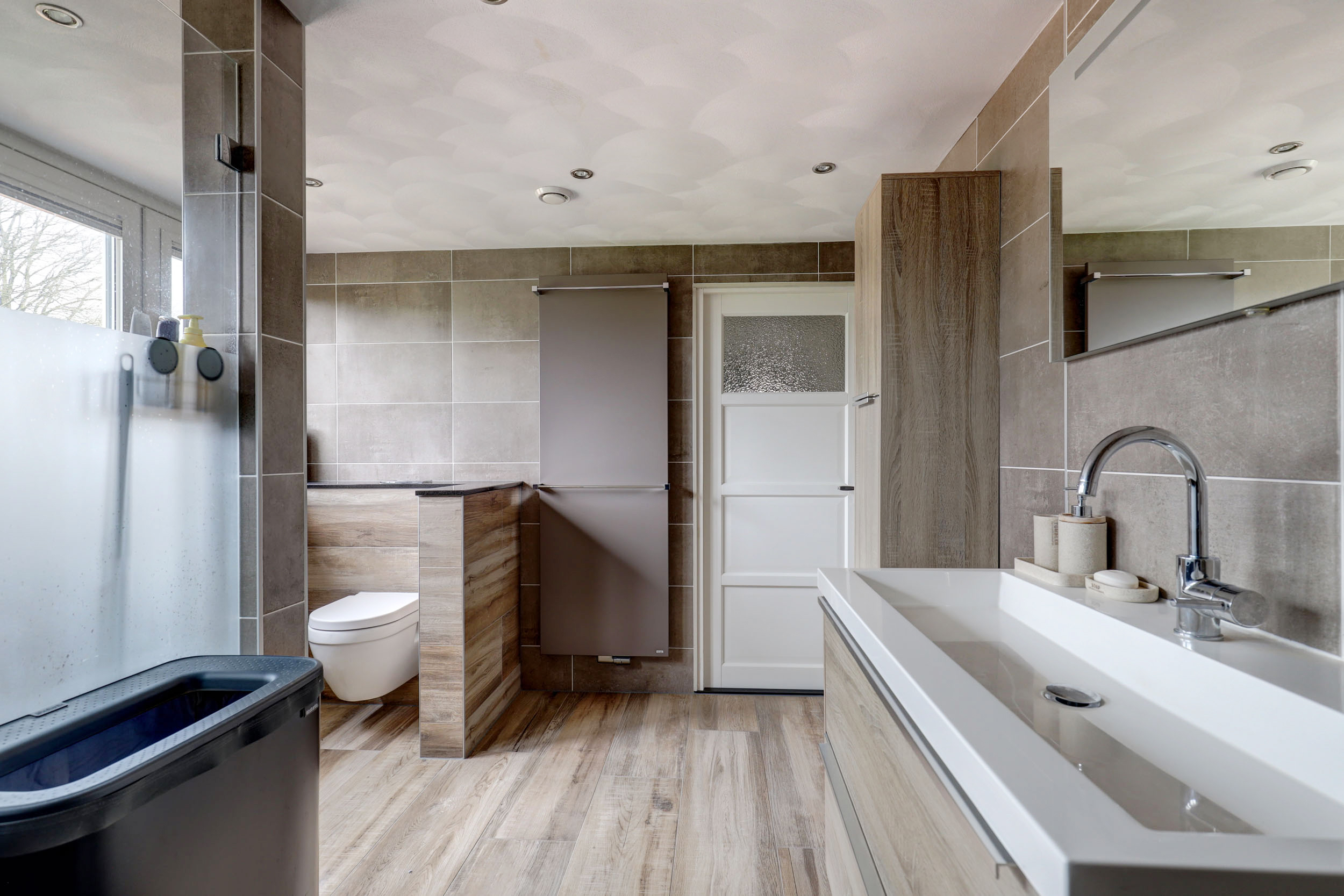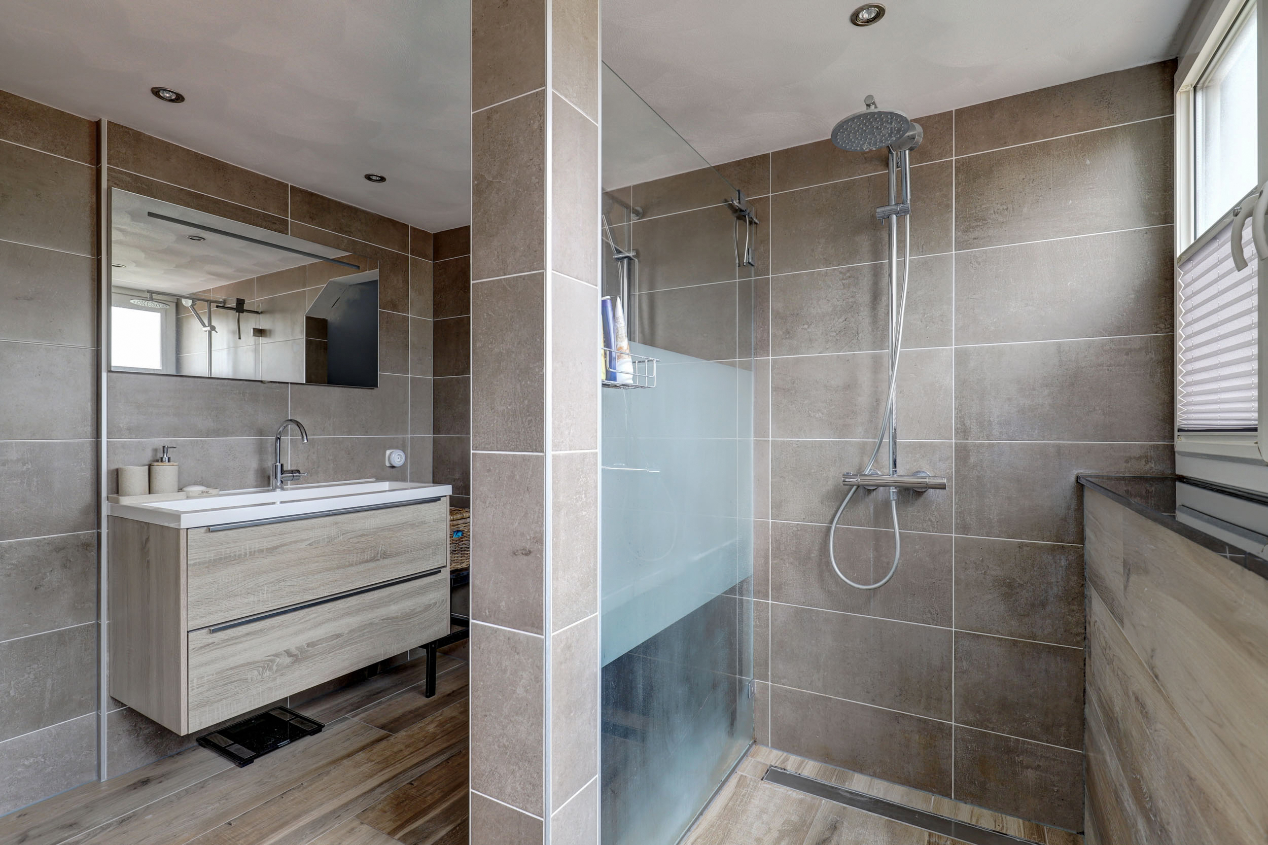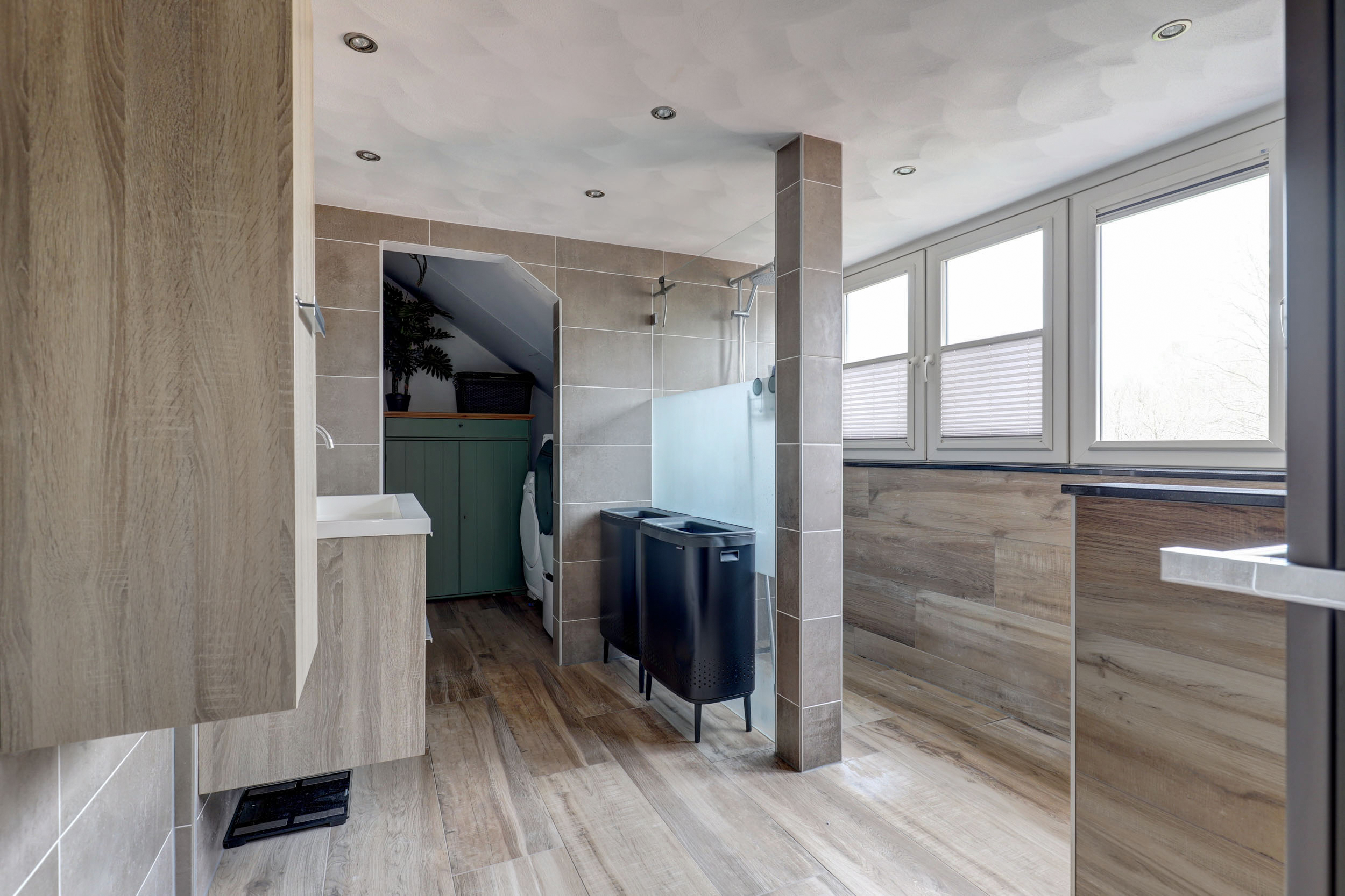 1e verdieping: overloop, 3 slaapkamers, in 2019 vernieuwde badkamer voorzien van inloopdouche, toilet, dubbele wastafel, geïntegreerde wasruimte met witgoedaansluitingen en de cv-opstelling.