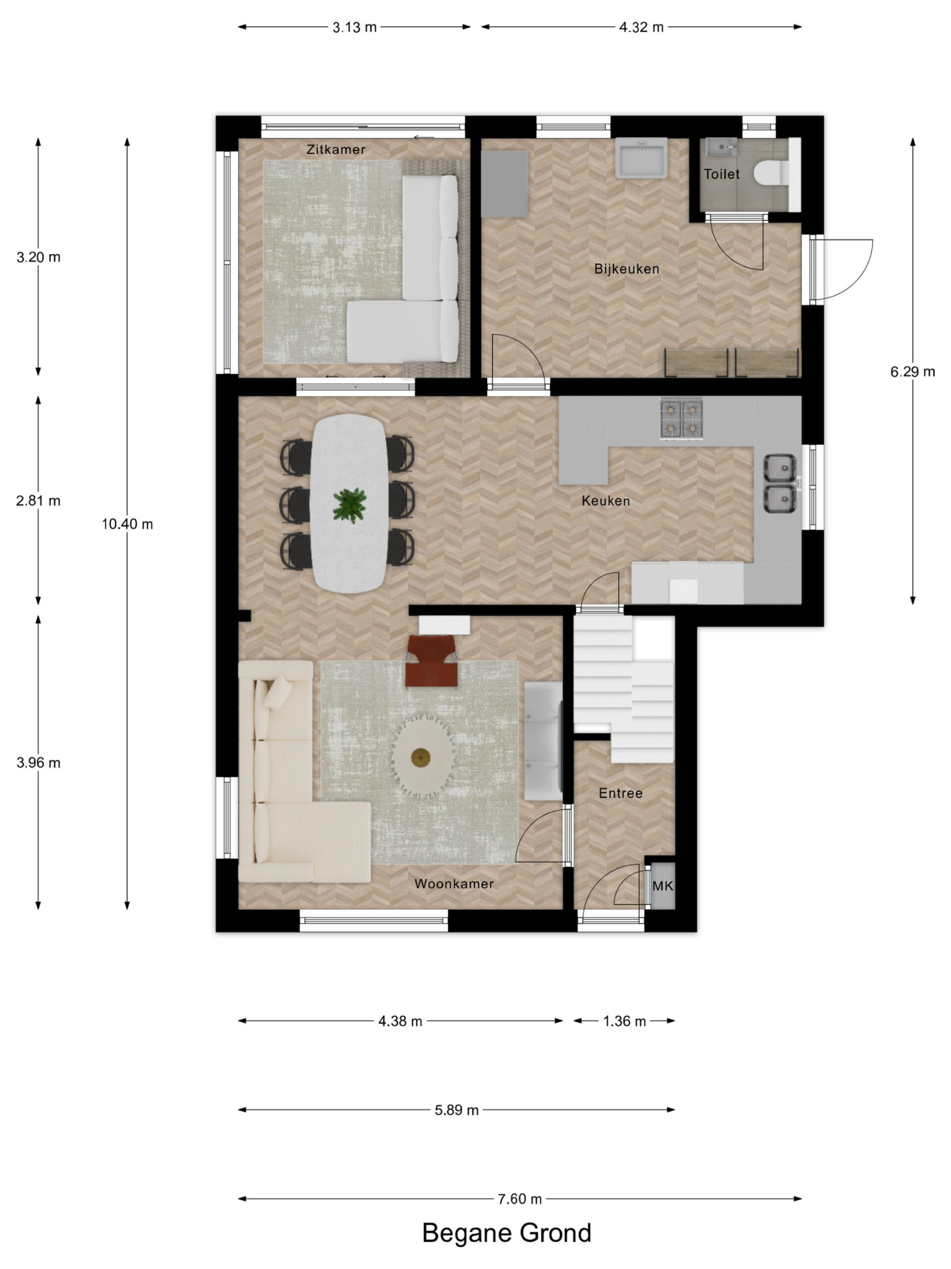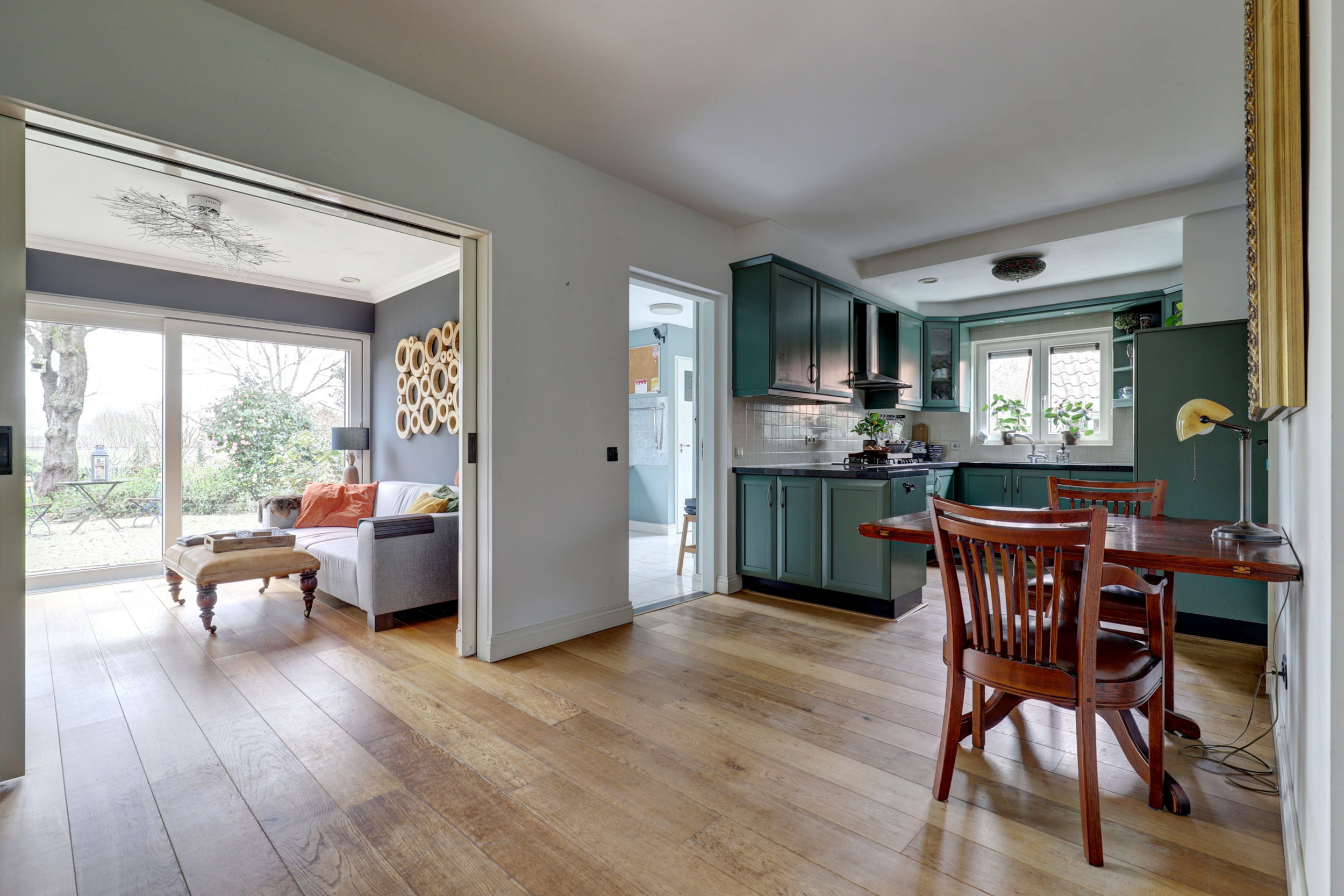 Begane grond: entree/ hal, meterkast, sfeervolle woonkamer met een eikenhouten vloer, eetkamer met schuifpui naar de tuin, open keuken voorzien van inbouwapparatuur en toegang tot de praktische kelder met voorraadruimte, ruime bijkeuken met toiletruimte.