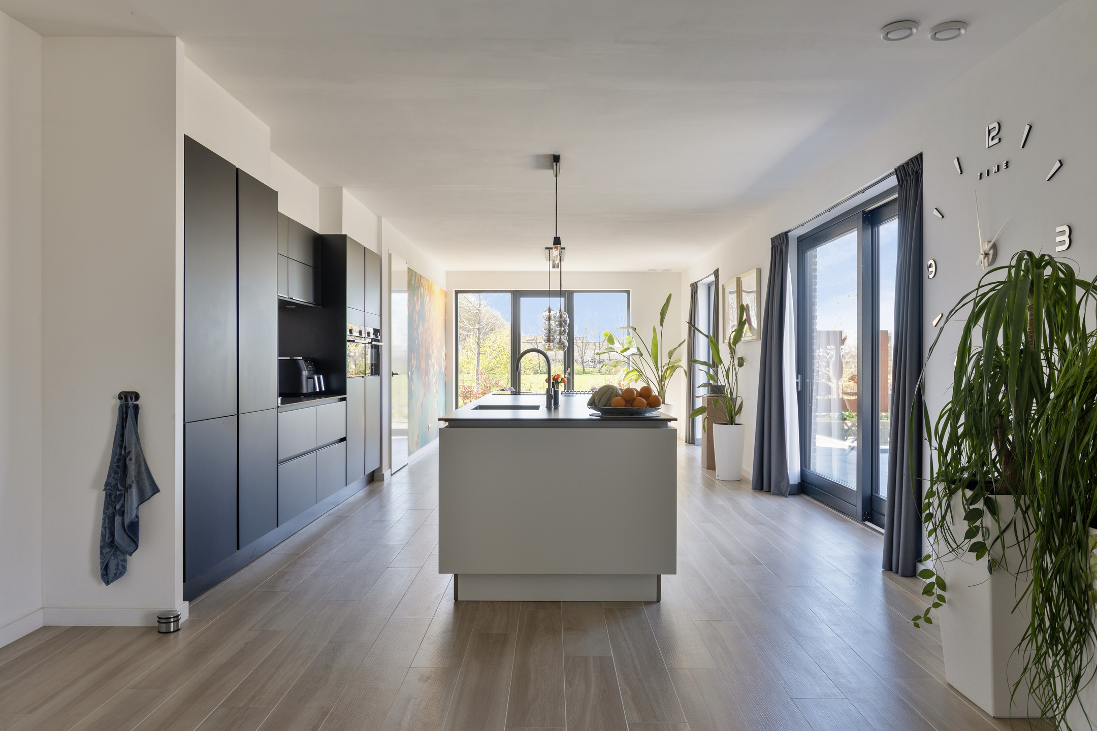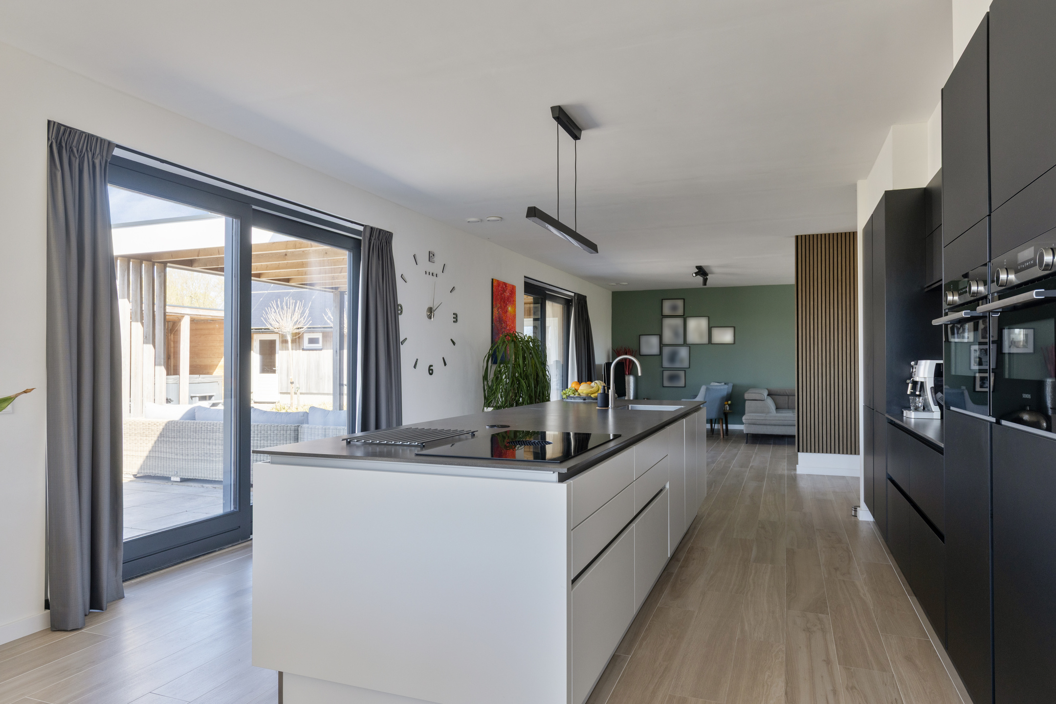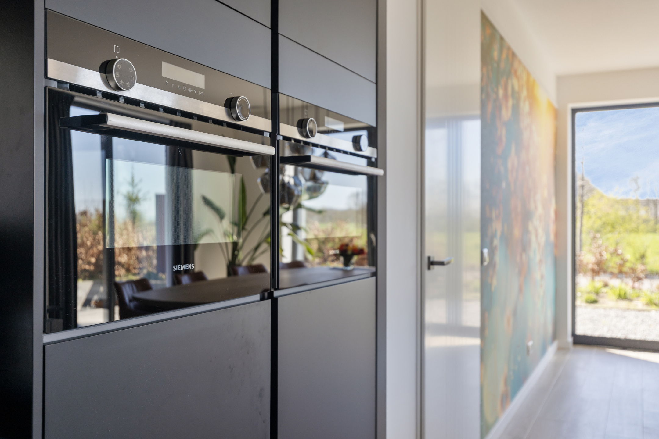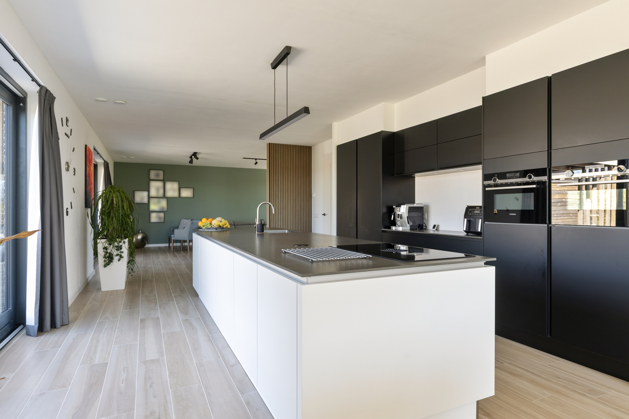 De keukenopstelling is voorzien van een inductiekookplaat met geïntegreerde afzuiging, 2 combiovens, vaatwasser, koelkast en aparte vrieskast.
