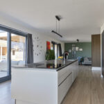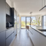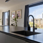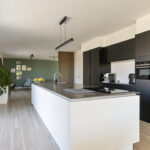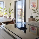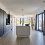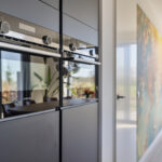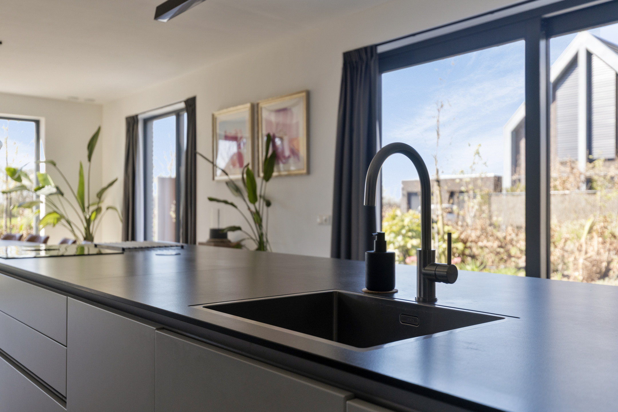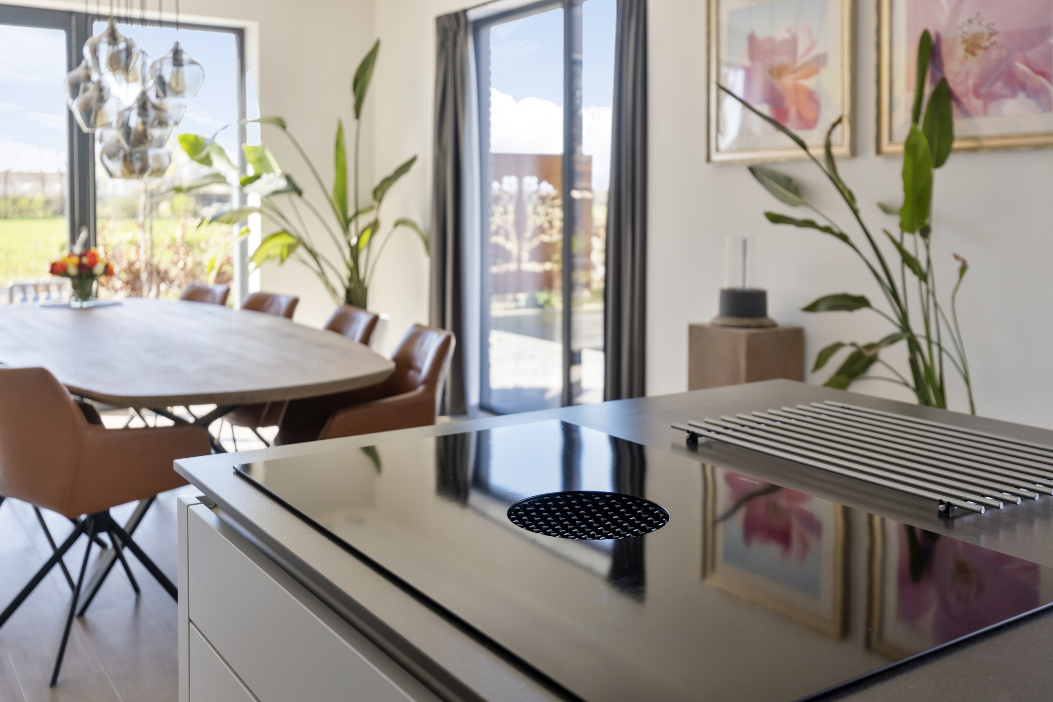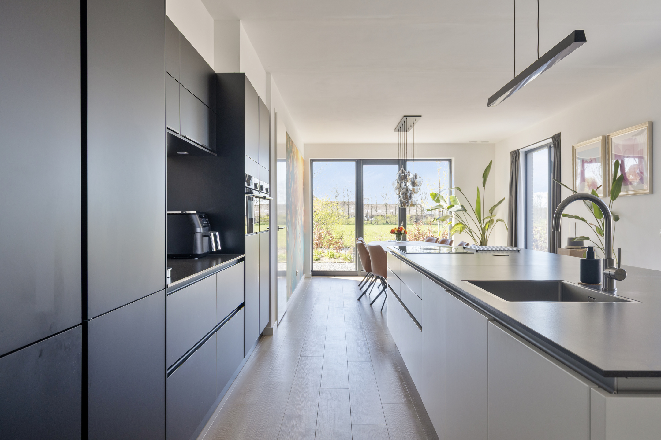 De keukenopstelling is voorzien van een inductiekookplaat met geïntegreerde afzuiging, 2 combiovens, vaatwasser, koelkast en aparte vrieskast.