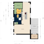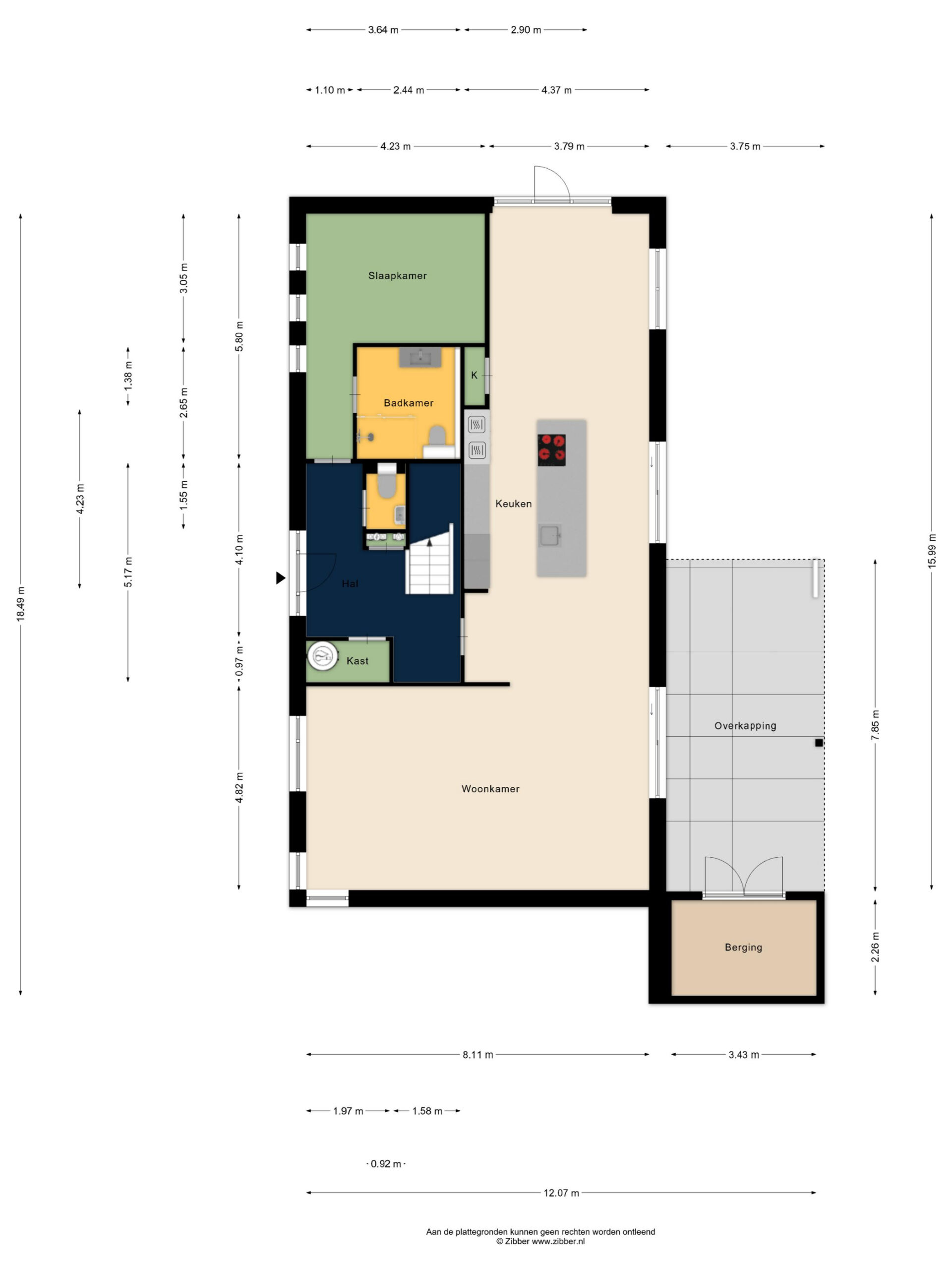Begane grond: hal/ entree met meterkast en toilet ingericht met wandcloset en fonteintje. Een aan de voorzijde van de woning gesitueerde slaapkamer met badkamer voorzien van een wastafel, inloopdouche en wandtoilet. Een zeer ruim opgezette woonkamer met centraal gelegen riante keuken voorzien van een kookeiland en luxe en complete inrichting. Vanuit zowel de woonkamer, als woonkeuken is er middels een schuifpui toegang tot de fraai aangelegde achtertuin.