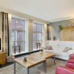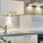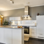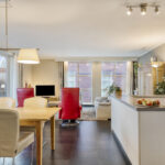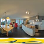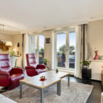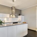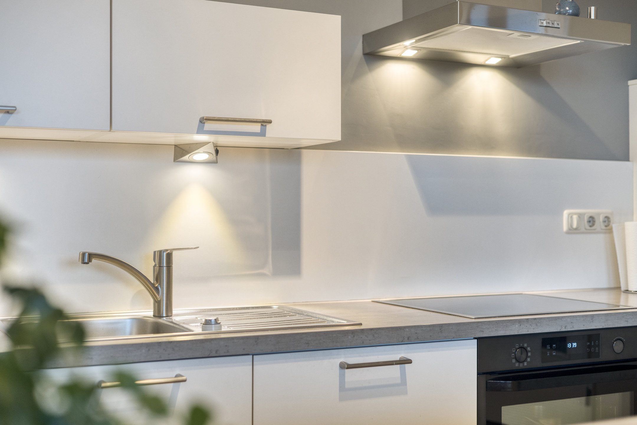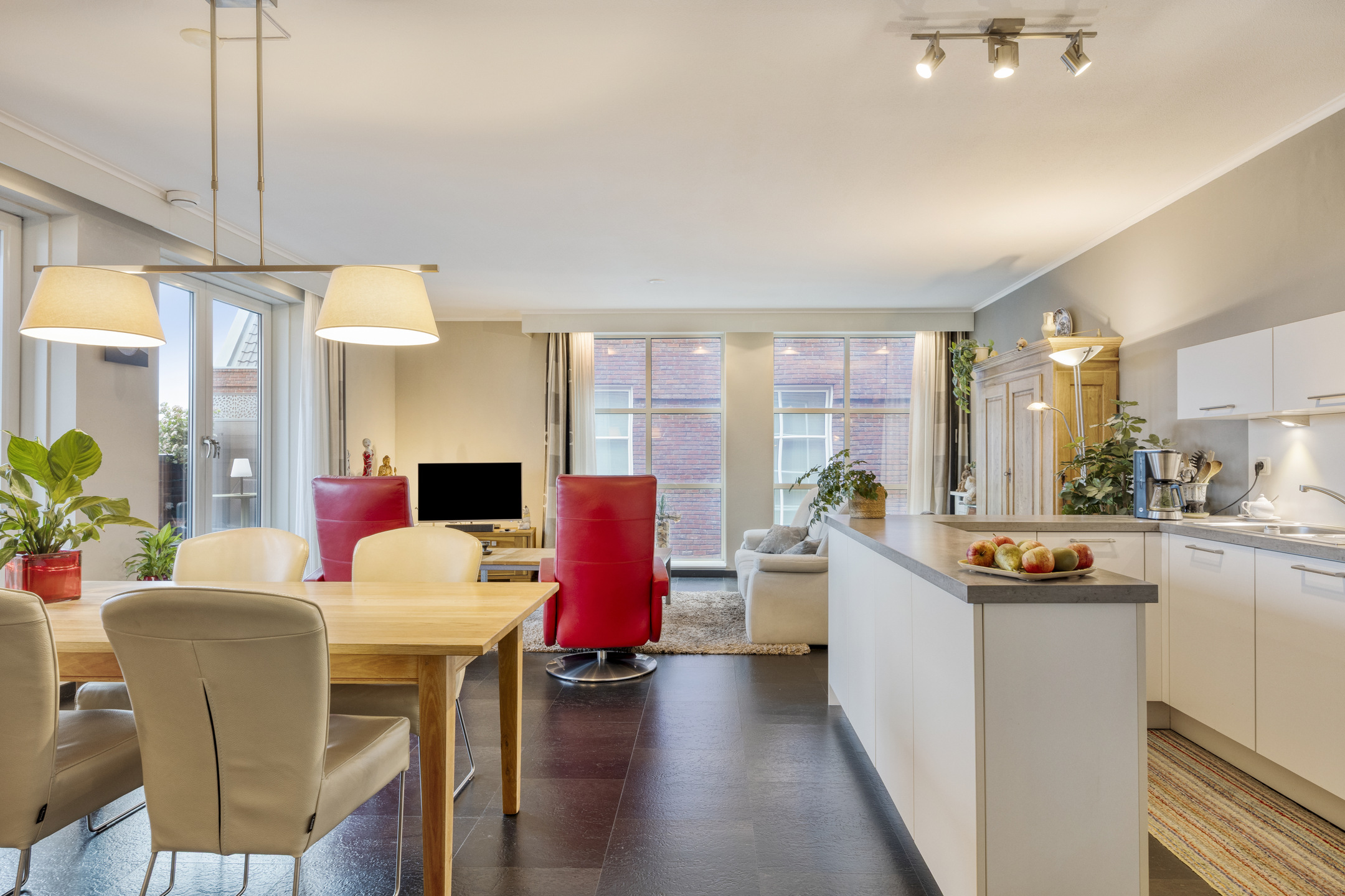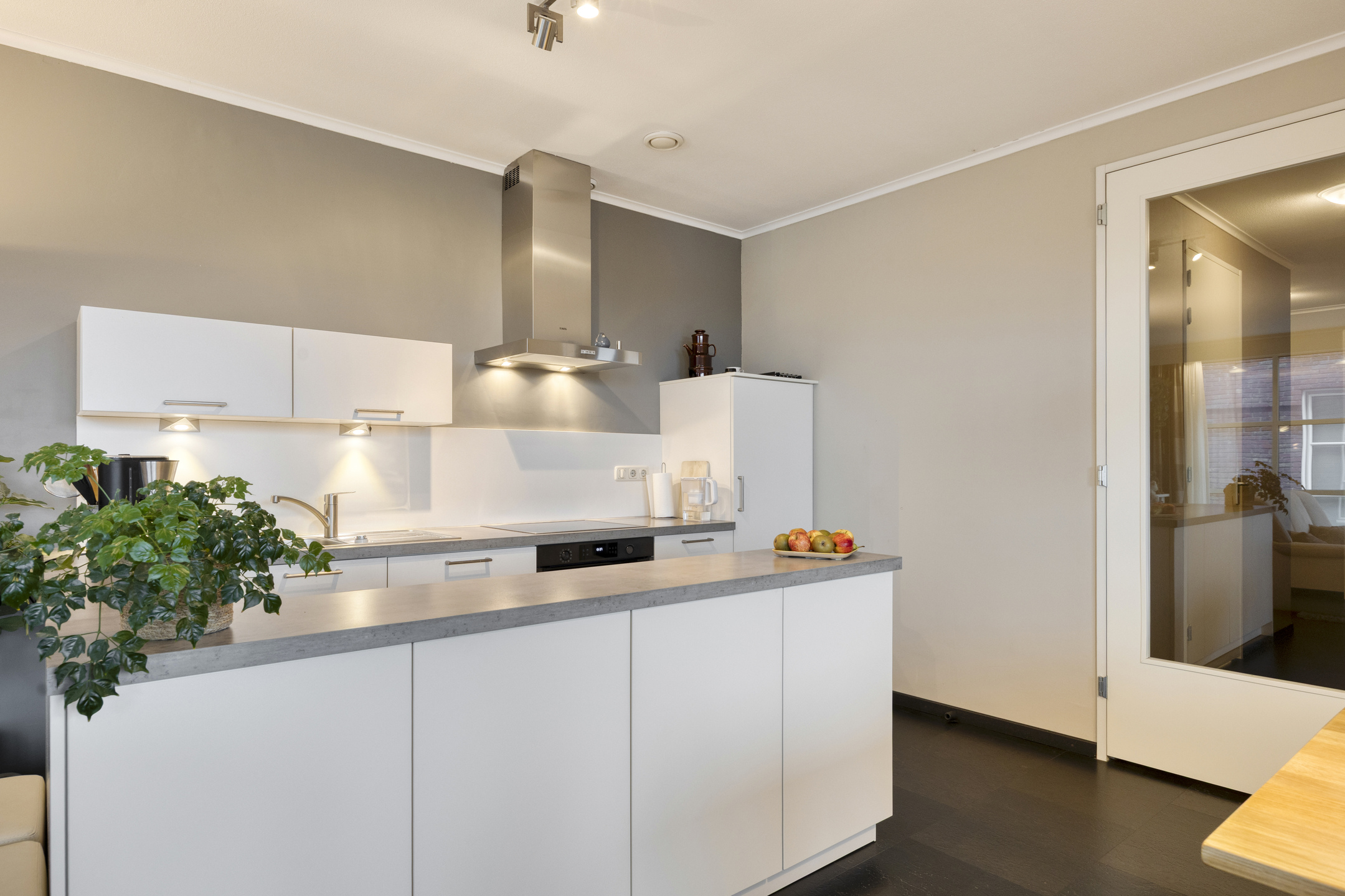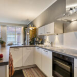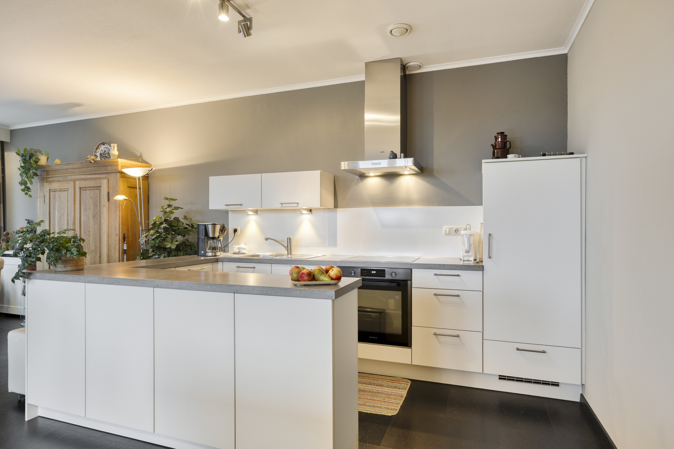 De keukenopstelling is voorzien van een moderne en luxe inrichting met inductiekookplaat, afzuigkap, oven, vaatwasser en koelkast.