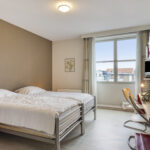 De hal, woonkamer en slaapkamer zijn voorzien van een kurkvloer, de logeerkamer van een laminaatvloer.