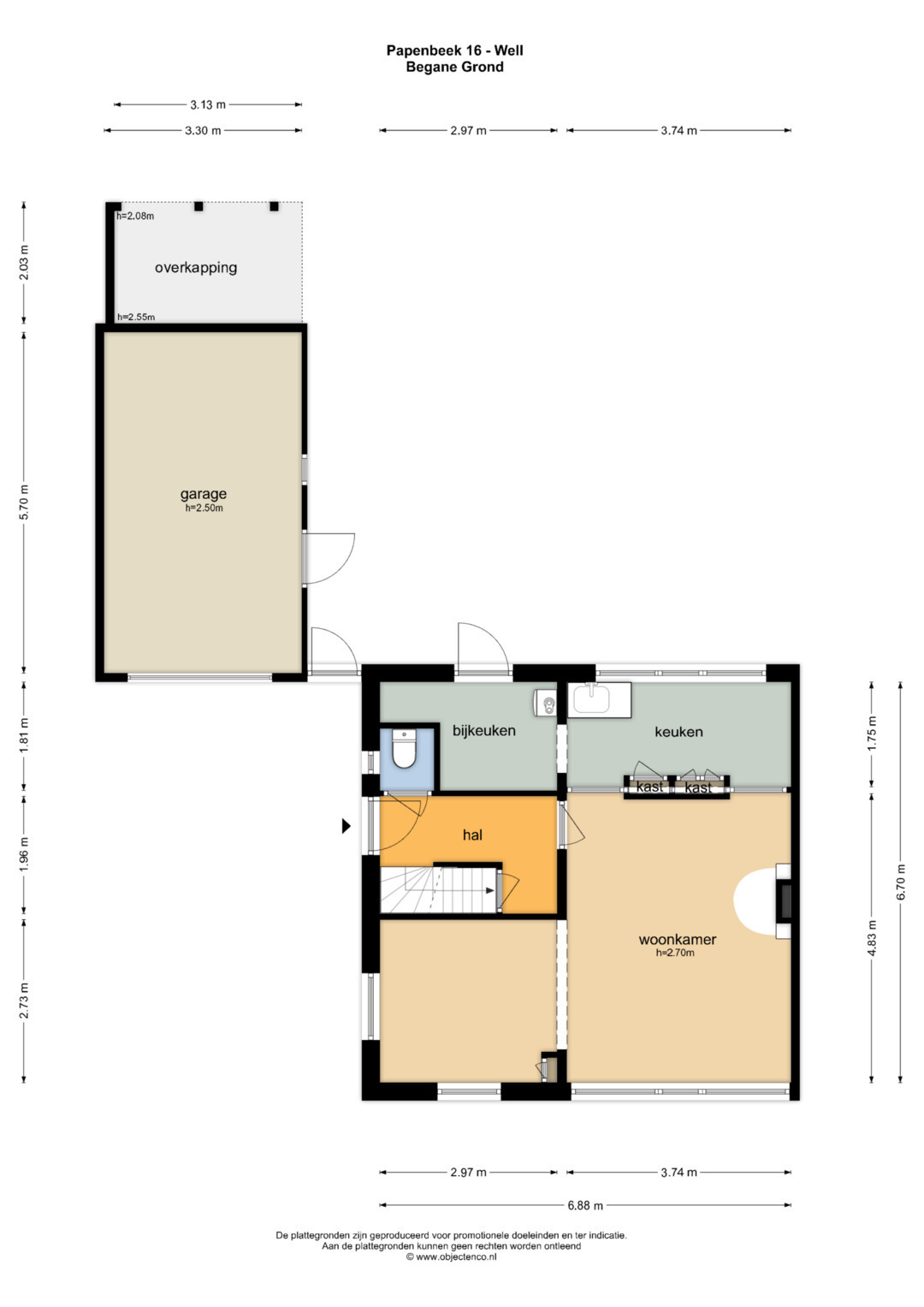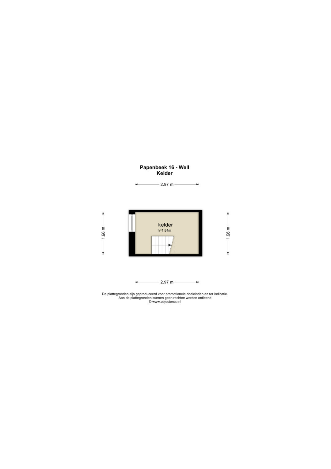Begane grond: hal met toegang tot de provisiekelder, toilet, woonkamer met een schouw, keuken met een eenvoudige keukenopstelling, bijkeuken.
