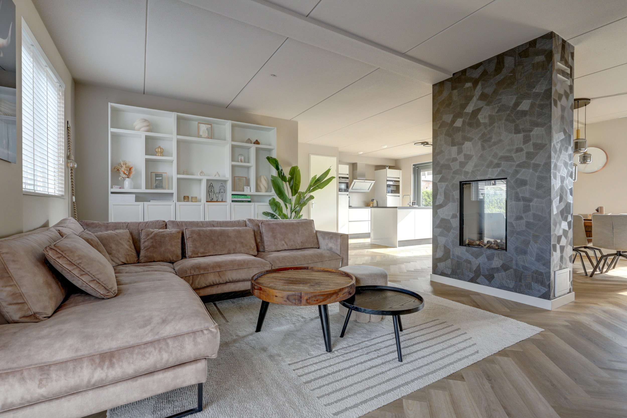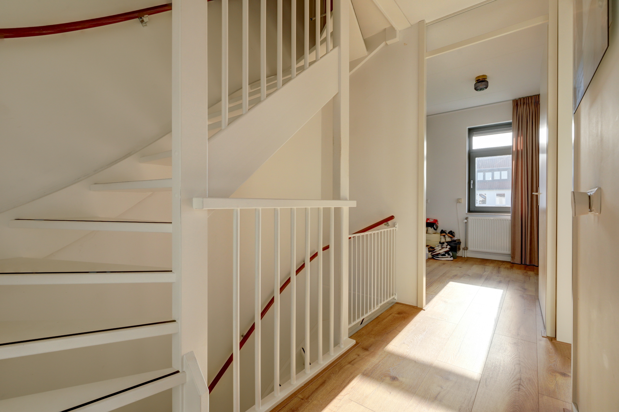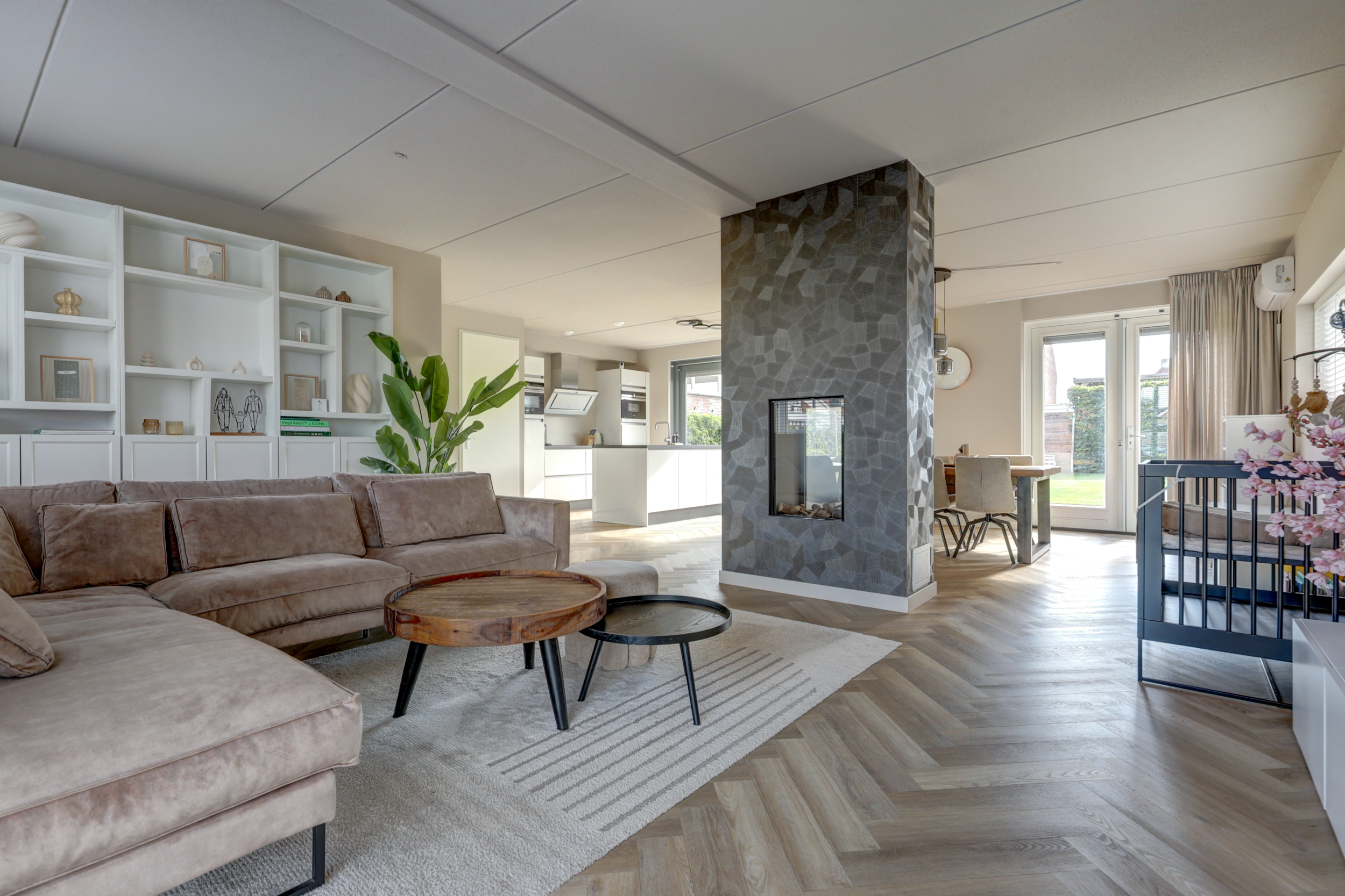 Begane grond: hal met toiletruimte, voorzien van wandcloset en fonteintje en cv-kast. Een zeer verrassend ruime woonkamer met sfeervolle gashaard, open keuken voorzien van een spoeleiland en alle benodigde inbouwapparatuur. De begane grond biedt veel lichtinval door de vele raampartijen aan zowel de voor- als achterzijde. Aan de achterzijde is er een brede schuifpui en er zijn openslaande deuren naar de achtertuin.