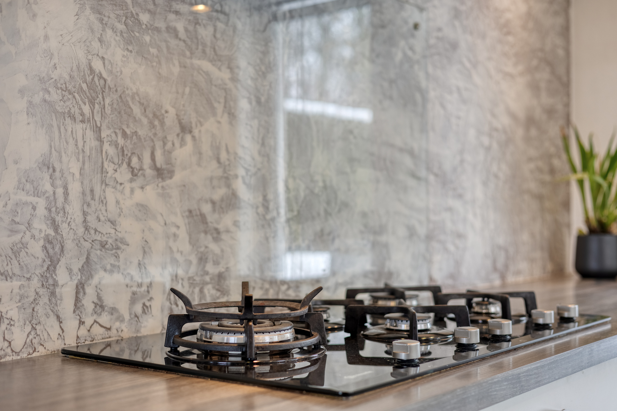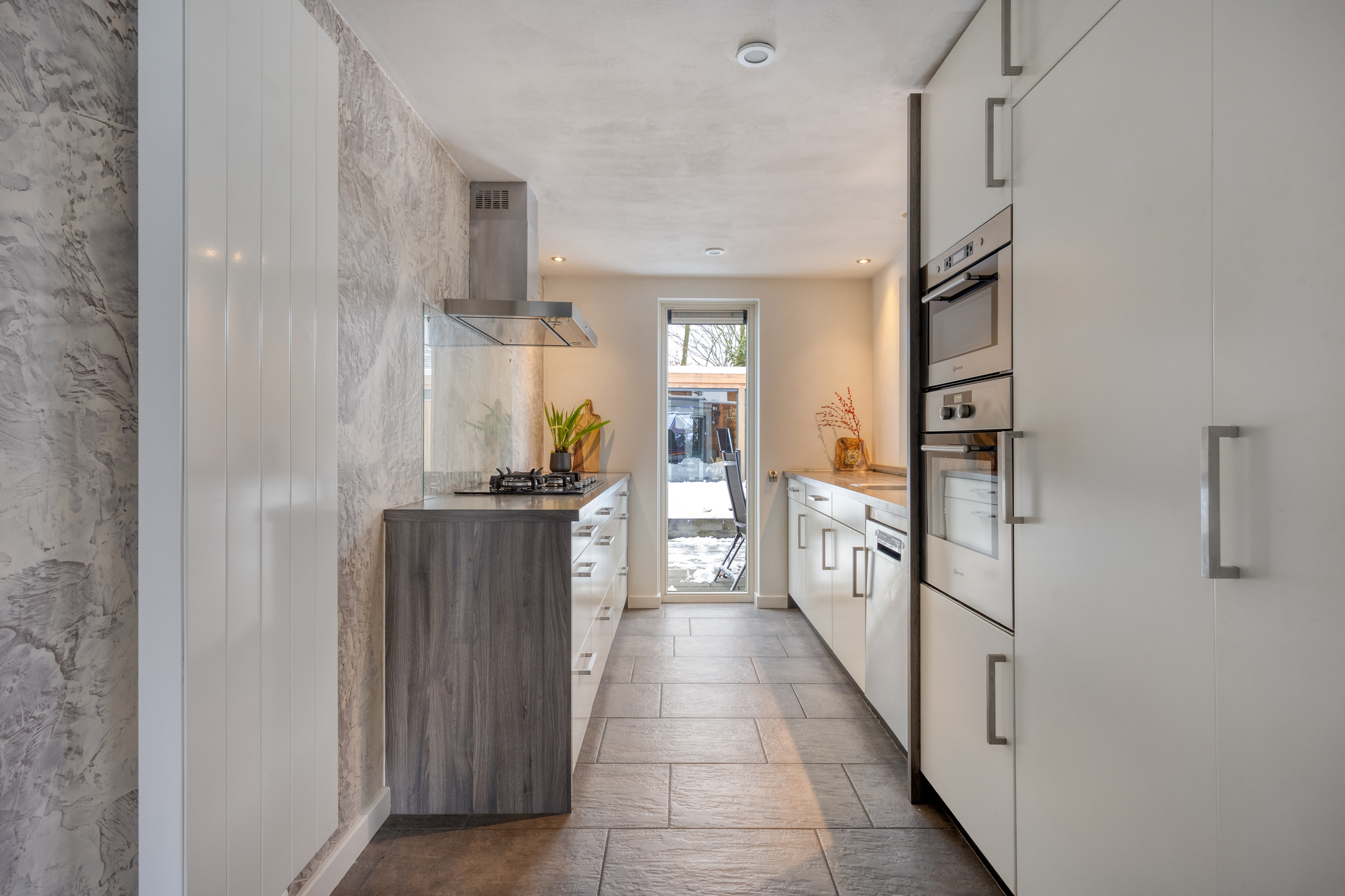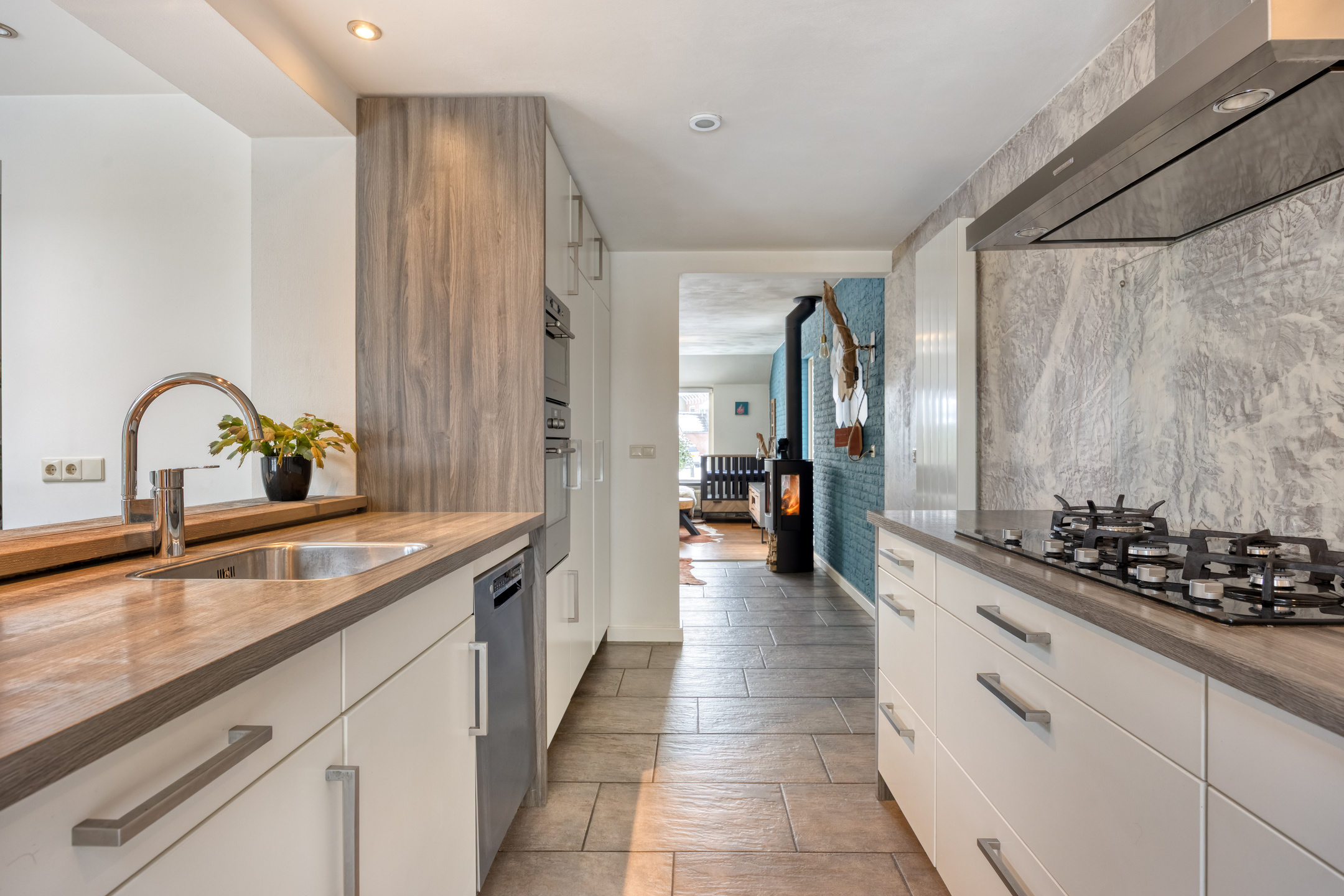 De keukenopstelling is voorzien van een 5-pits gaskookplaat, afzuigkap, oven, magnetron, koelkast en vaatwasser.