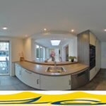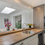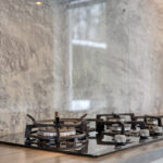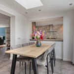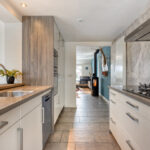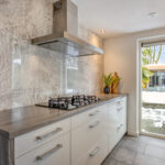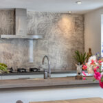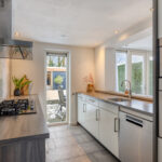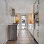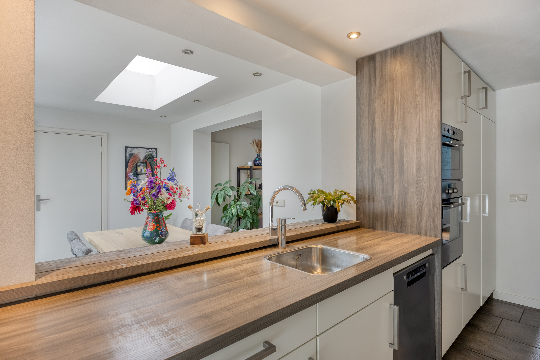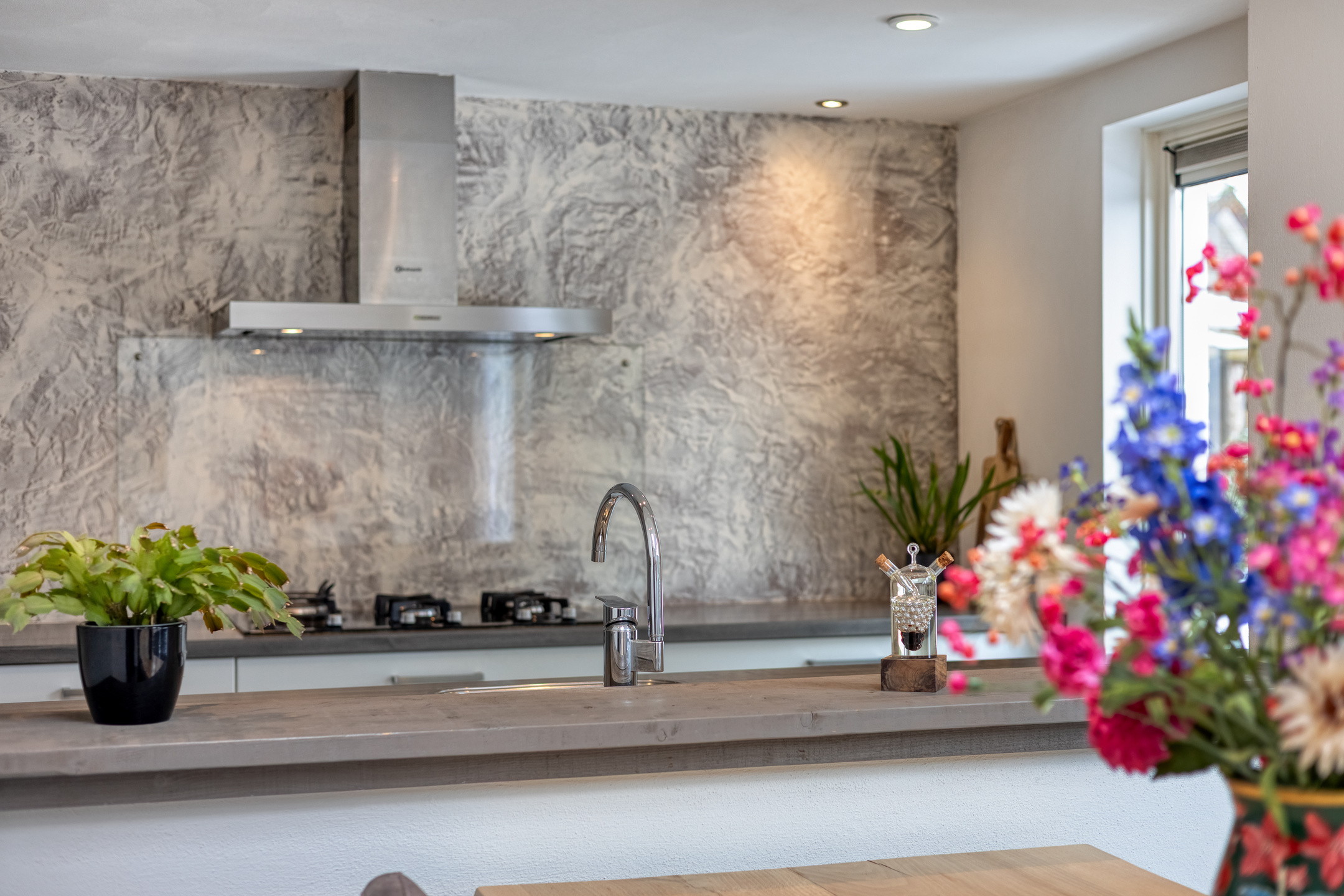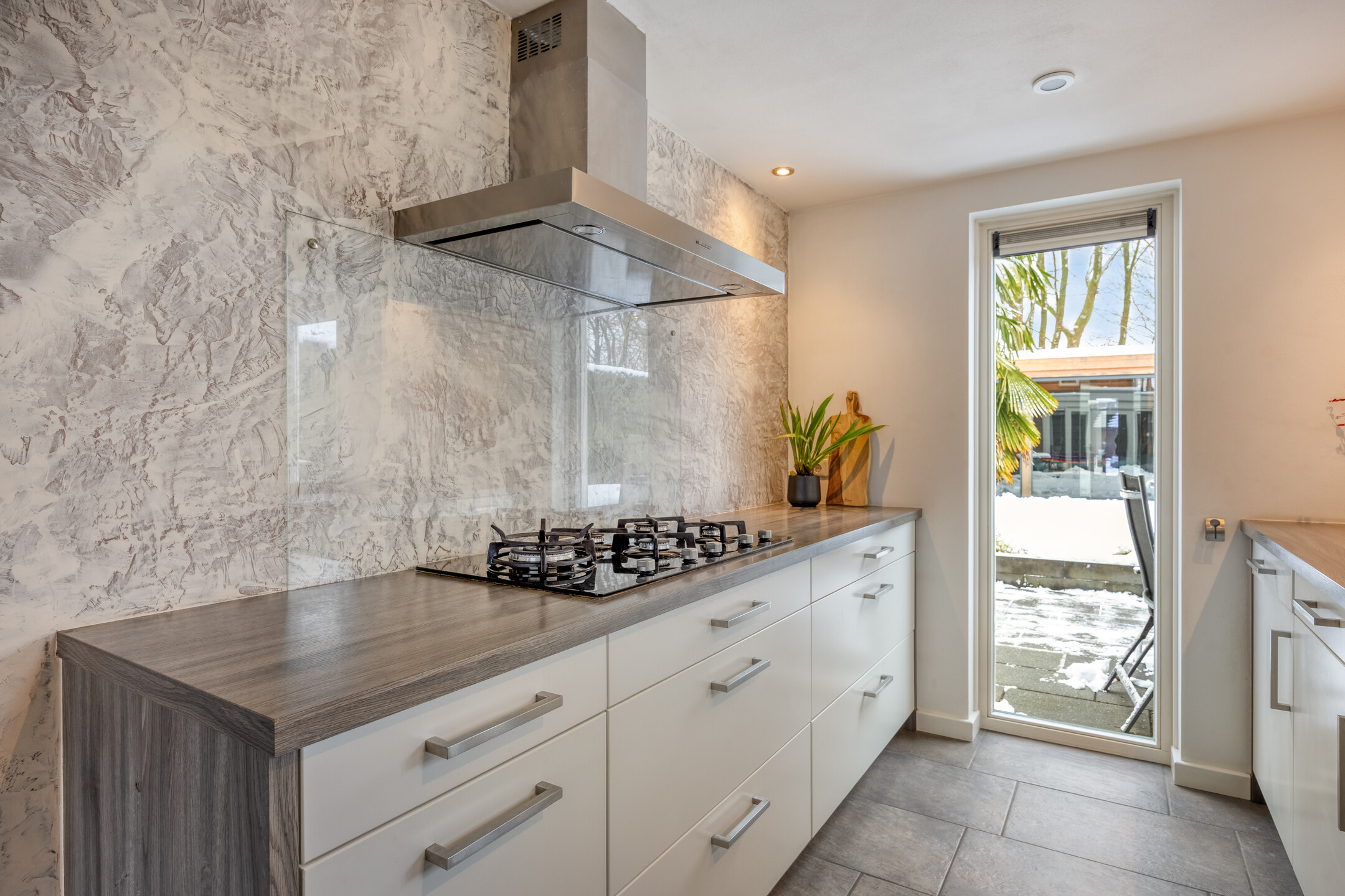 De keukenopstelling is voorzien van een 5-pits gaskookplaat, afzuigkap, oven, magnetron, koelkast en vaatwasser.