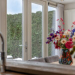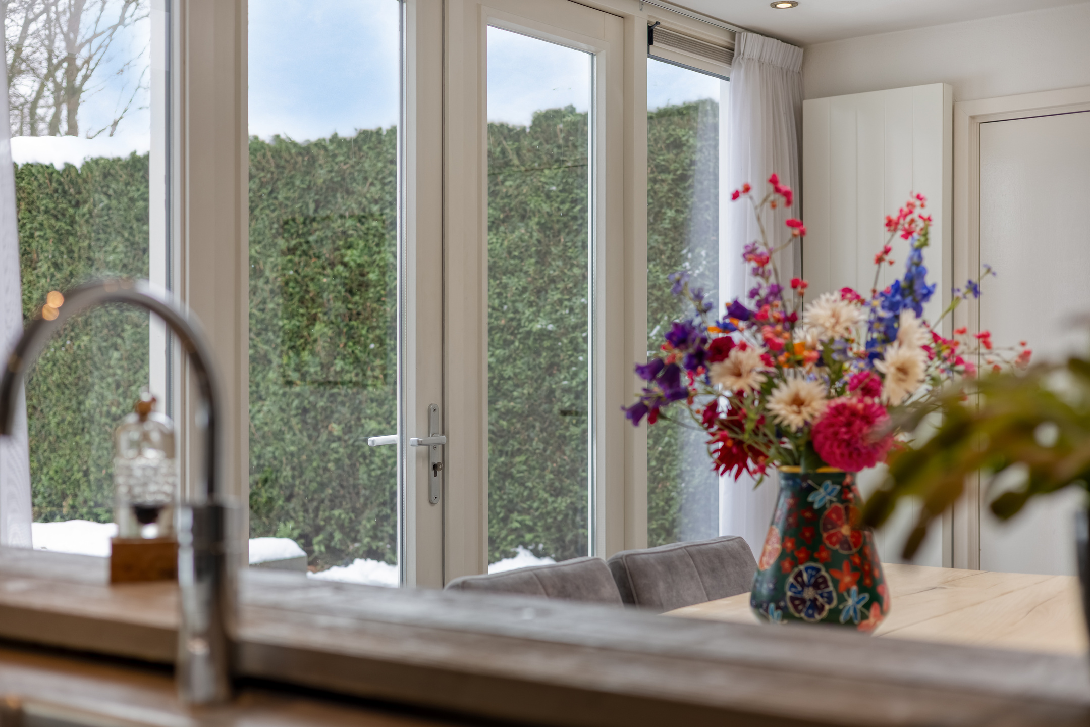Begane grond: hal met vernieuwde meterkast en toilet met fonteintje. De speels ingedeelde woonkamer met een erker en houtkachel is aan de achterzijde uitgebouwd en voorzien van openslaande tuindeuren. De keuken staat in halfopen verbinding met deze woonkamer. Praktische bijkeuken met witgoedaansluitingen en aansluitend de aangebouwde en ruime garage.