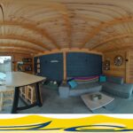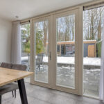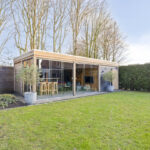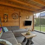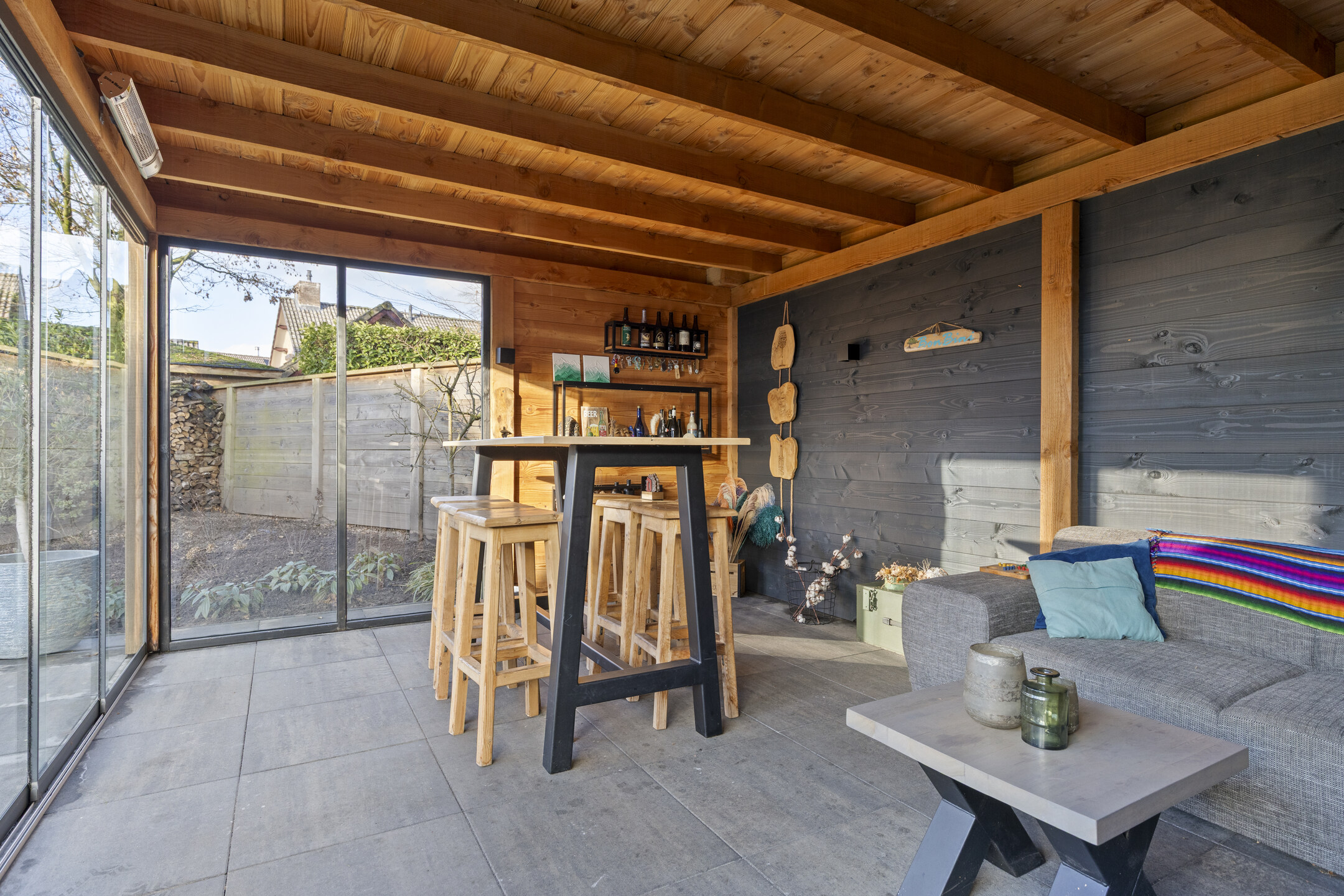 Sfeervolle tuinkamer met schuiframen en een praktische houten berging.