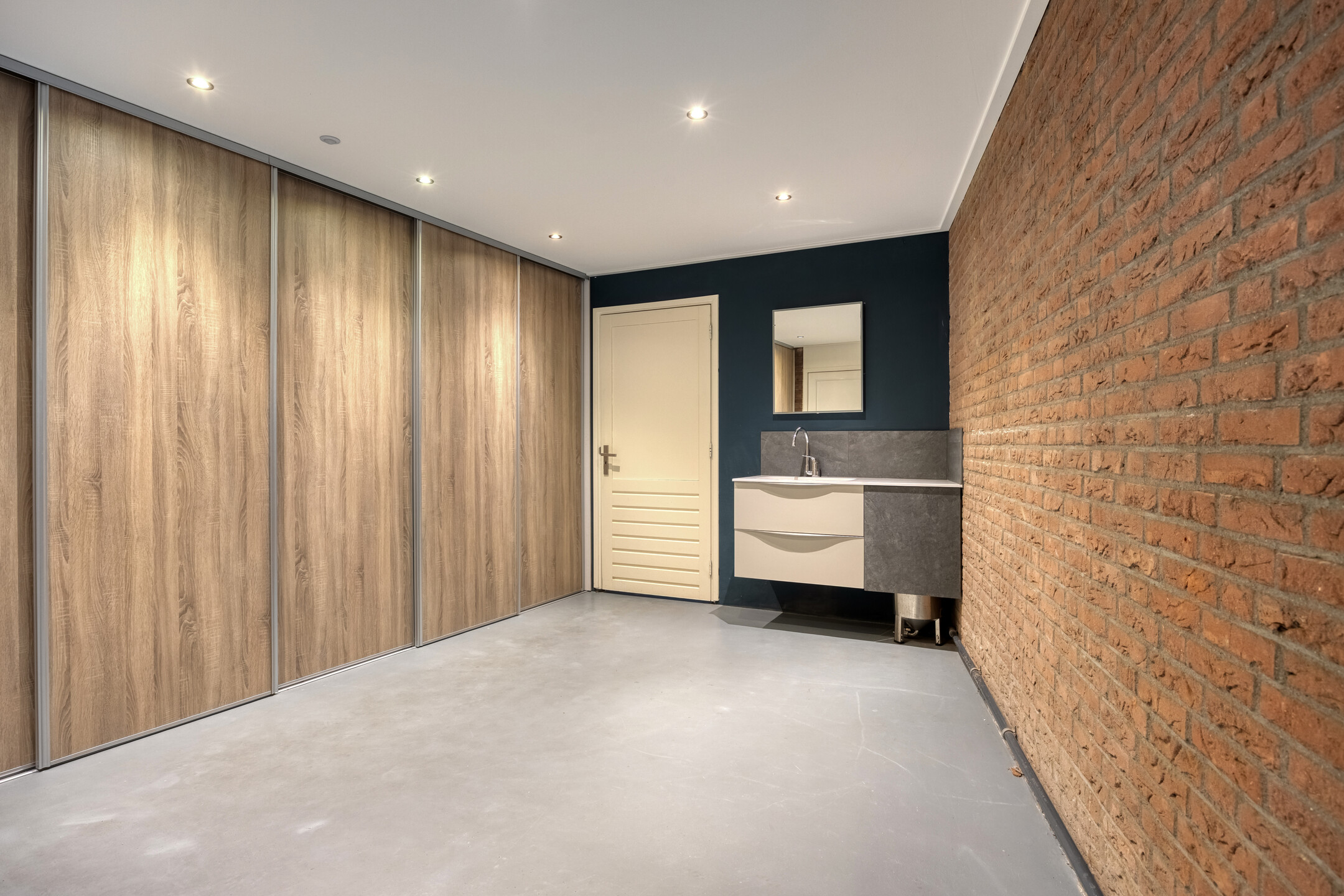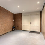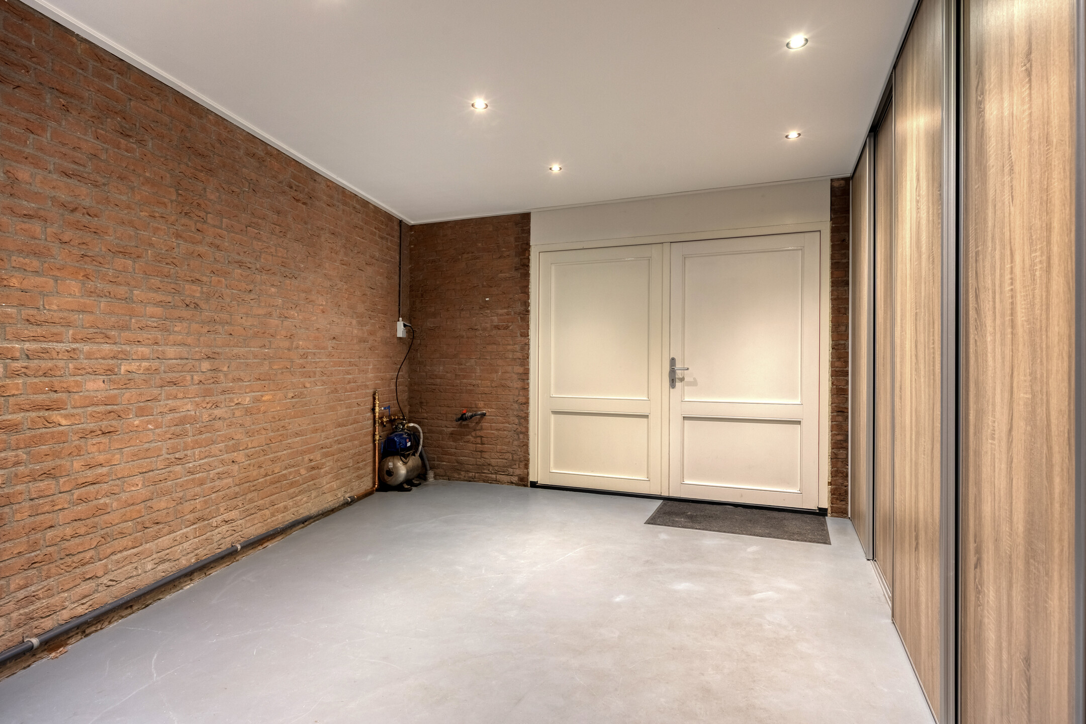 Royale inpandig te bereiken garage met schuifkastenwand en wastafel met meubel.