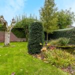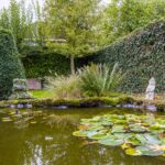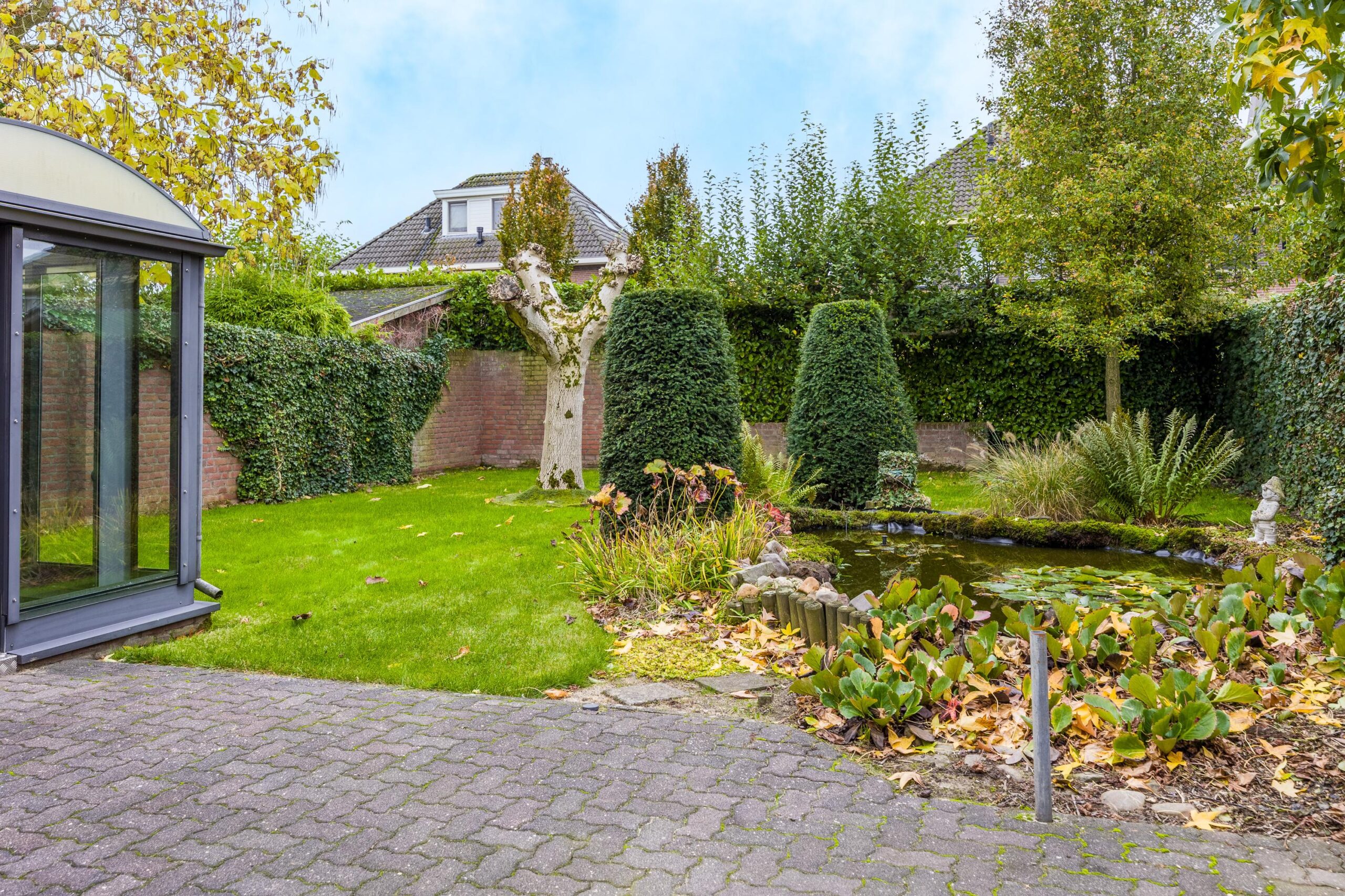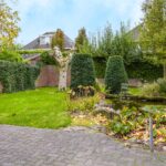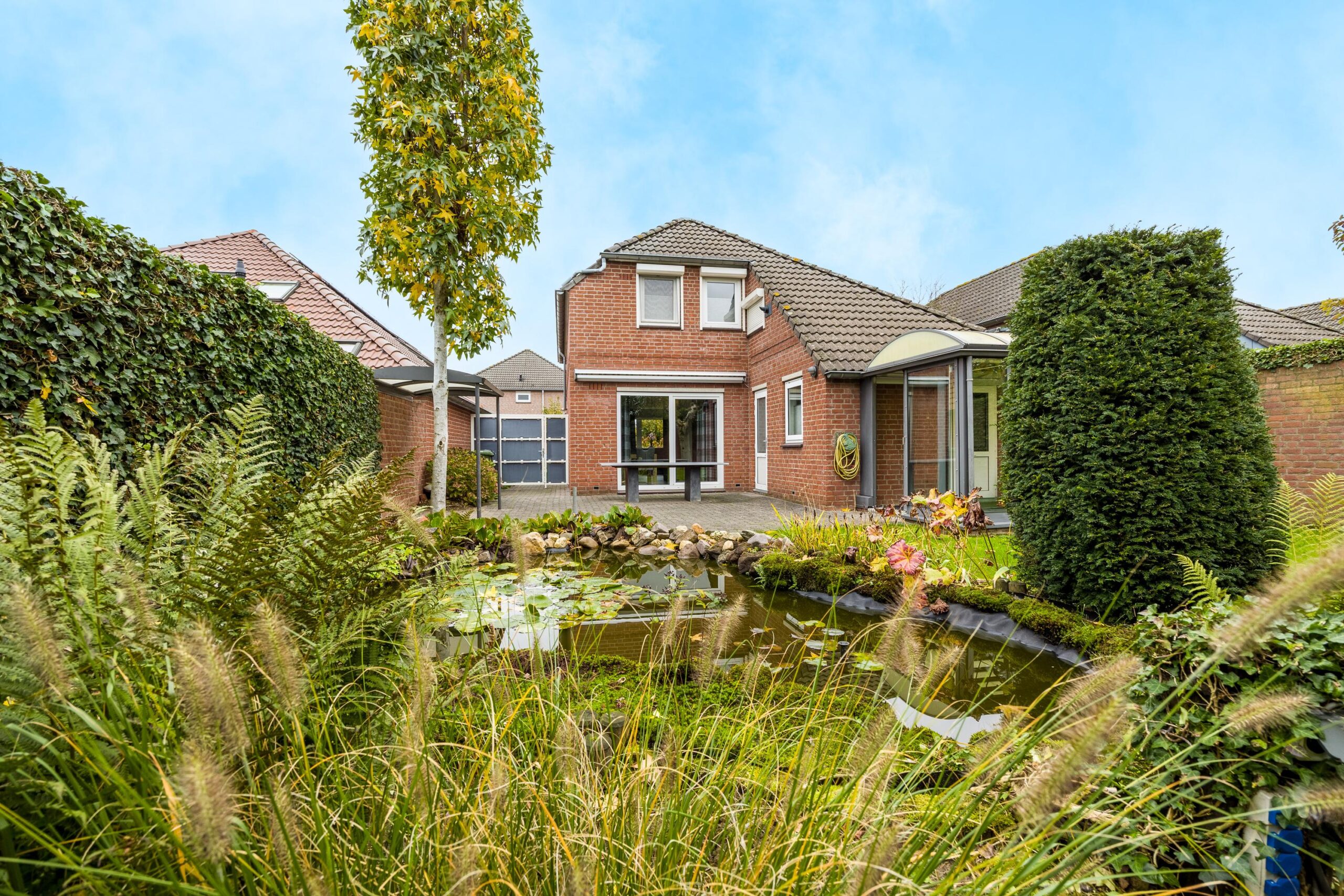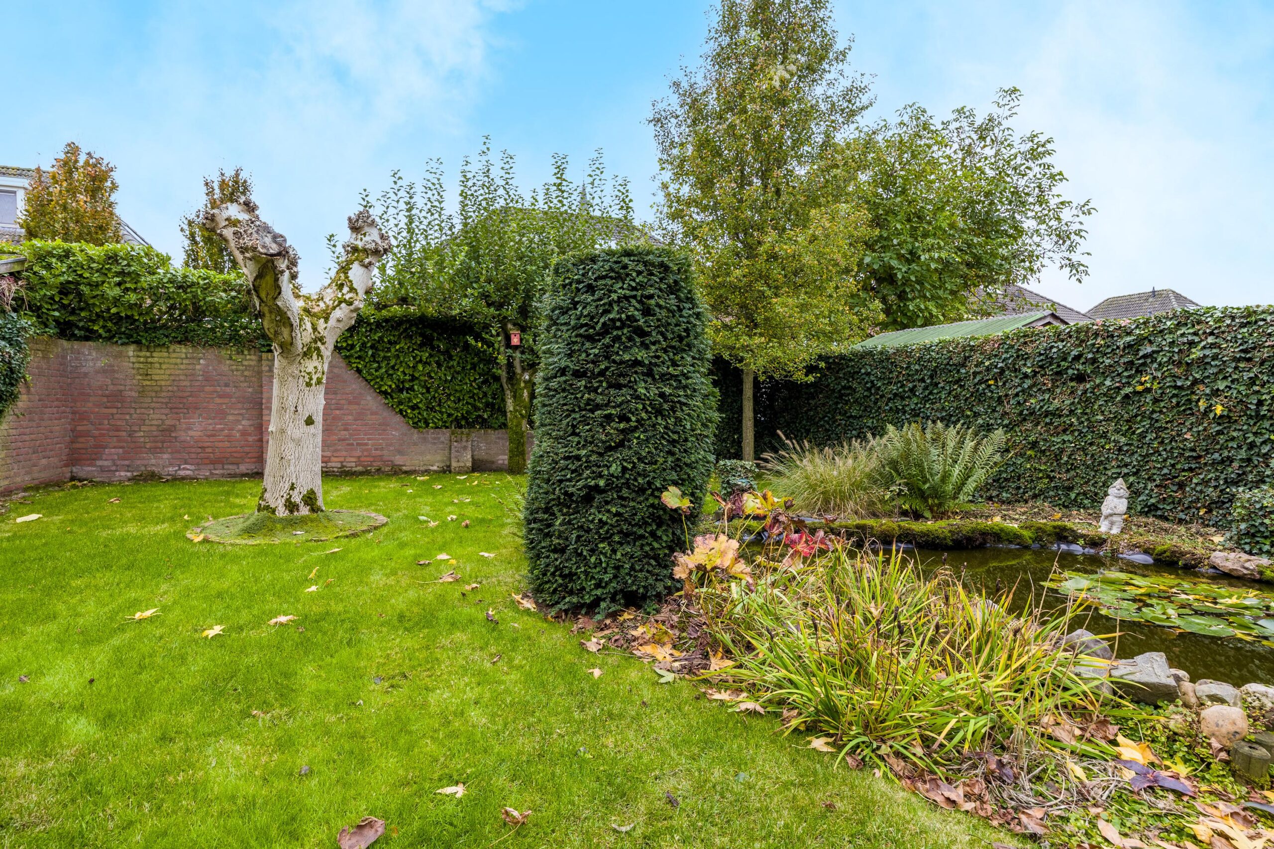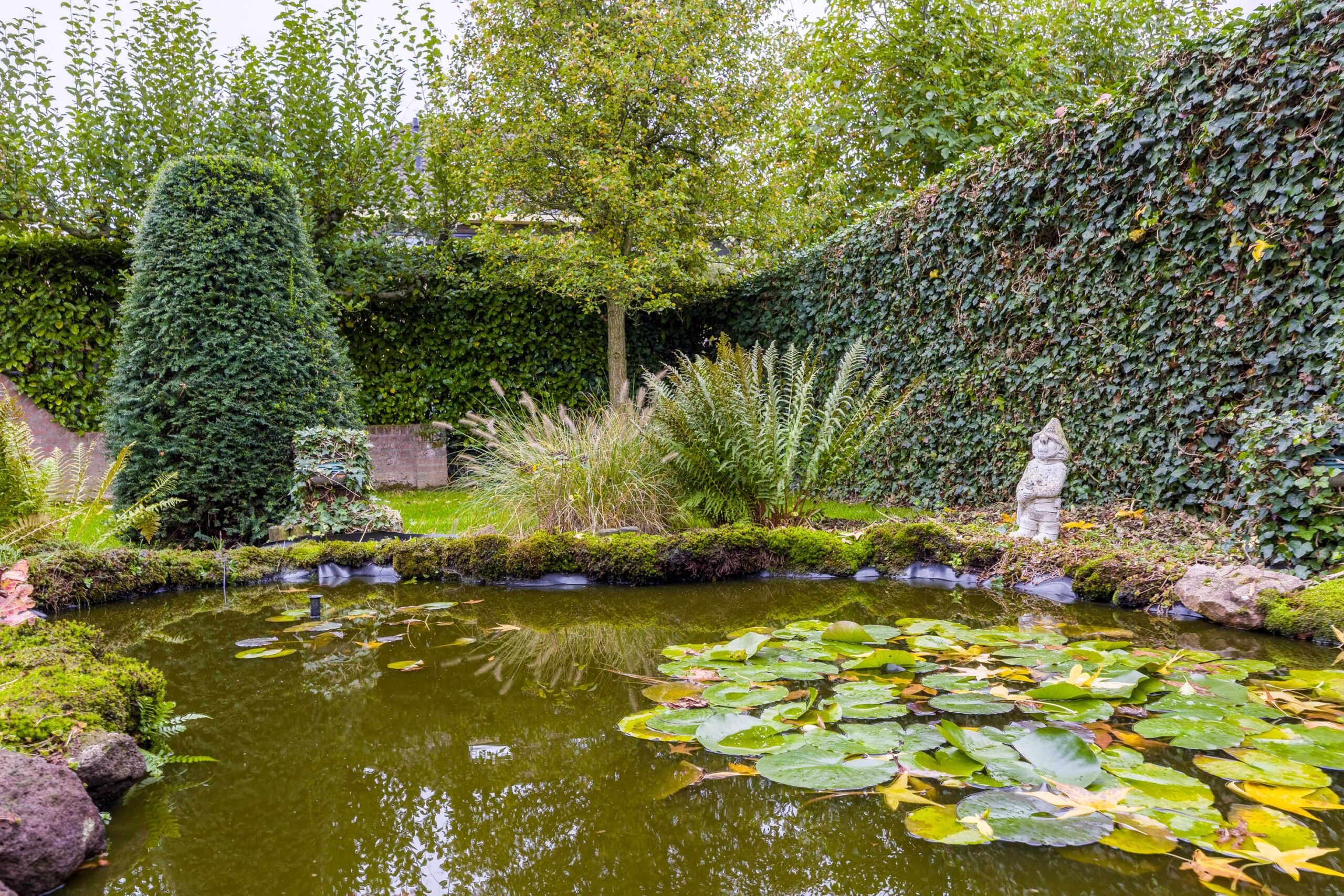De fraai aangelegde achtertuin, gelegen op het zuiden, biedt optimale privacy en is een heerlijke plek om te ontspannen. Het zonnige terras en de vijverpartij zorgen voor een oase van rust en groen.