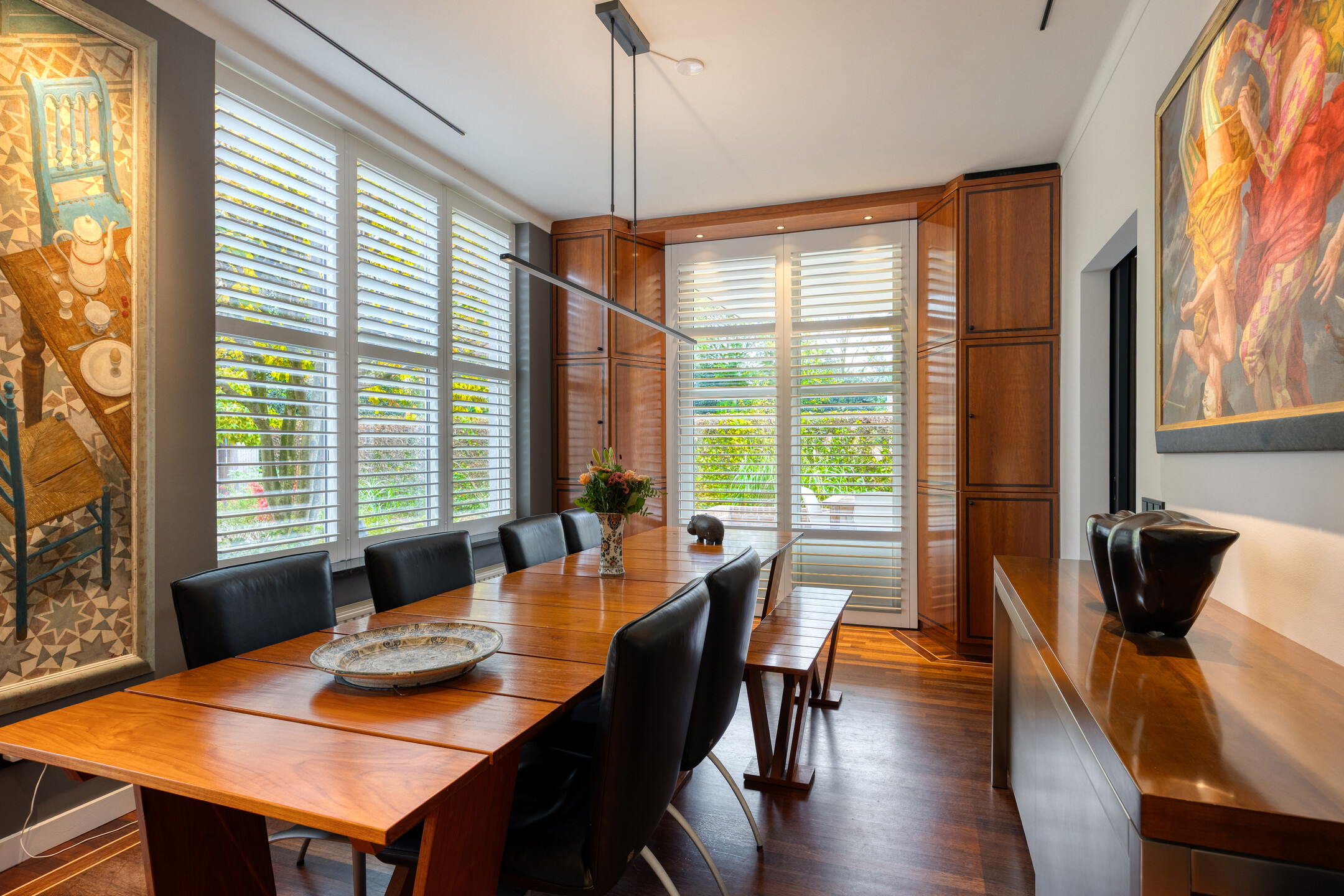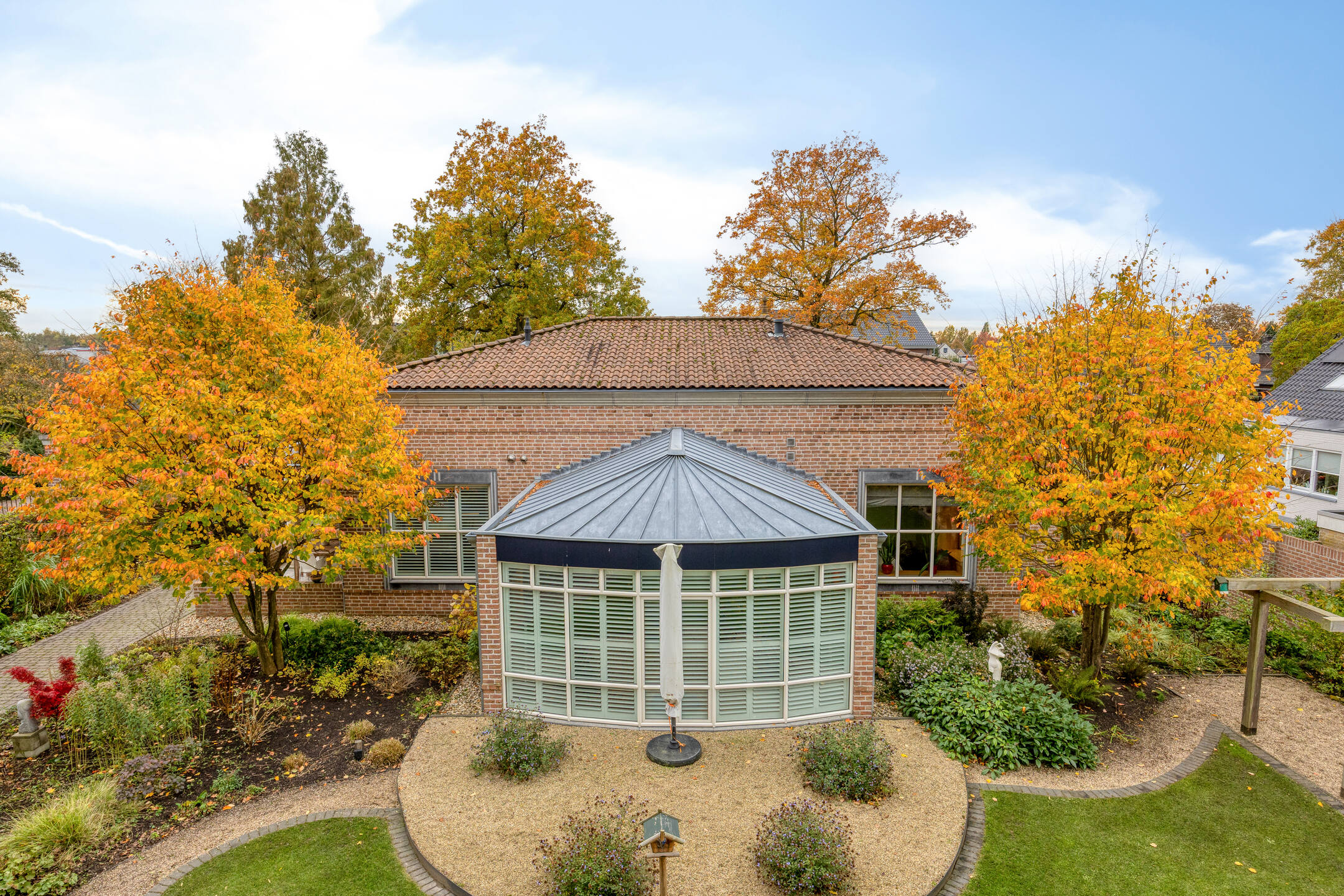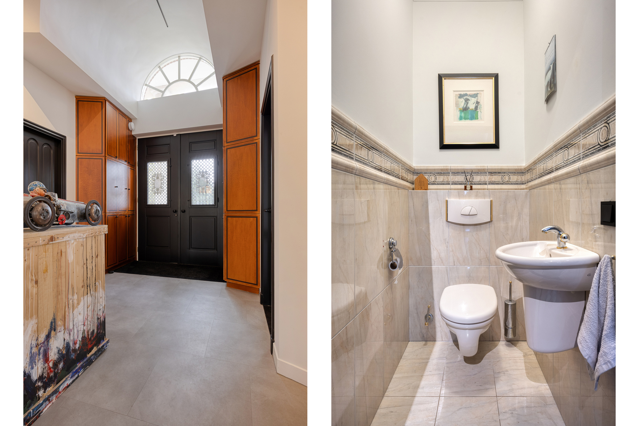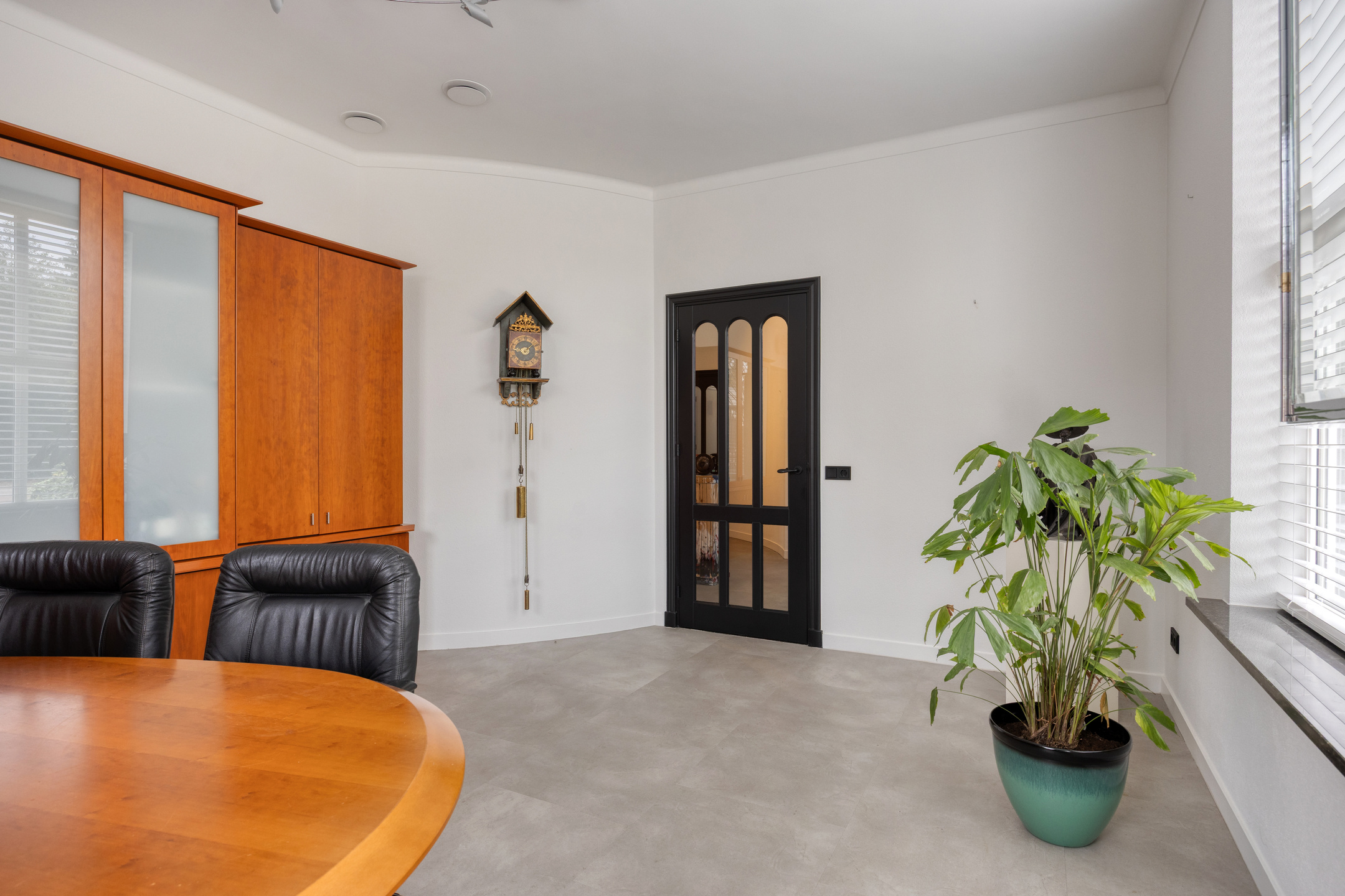 Begane grond: ruime ontvangsthal met diverse inbouwkasten, garderobenis en meterkast. De toiletruimte is voorzien van een wandcloset en fonteintje. Via dubbel openslaande deuren wordt de royale woonkamer bereikt. Deze is voorzien van een sfeervolle gashaard, een gewelfd plafond en een uitzicht op de achtertuin middels een grote raampartij – een ‘view’ die nooit verveelt. Grenzend aan de woonkamer is een knusse eethoek met inbouwkasten. De dichte moderne keuken, die in 2021 is geplaatst, is voorzien van luxe inrichting zoals een combi-oven, stoomoven, bordenwarmer en een grote koelkast. Vanuit de keuken kan ook de pantry worden bereikt. Twee slaapkamers en een ruim kantoor zijn vanuit de ontvangsthal bereikbaar. Wie in de van airconditioning voorziene master bedroom ontwaakt, heeft uitzicht op de achtertuin. In die slaapkamer is ook een toilet aanwezig en een in 2021 gerealiseerde badkamer en suite, voorzien van een halfronde inloopdouche en dubbele wastafel. De andere slaapkamer is ook uitgerust met een wastafel en douchecabine en geeft toegang tot de veranda. Het met airconditioning uitgeruste kantoor, aan de voorzijde van de villa, is ruim van opzet en – zoals dat geldt voor alle ruimtes op de begane grond – voorzien van volop natuurlijke lichtinval.