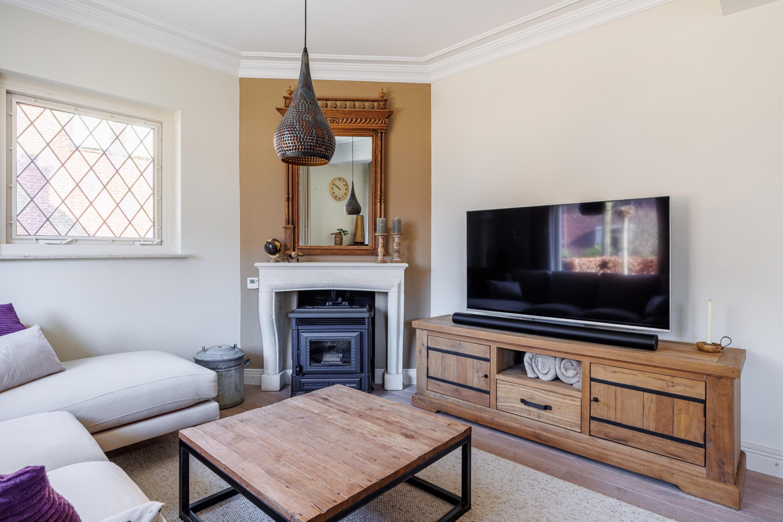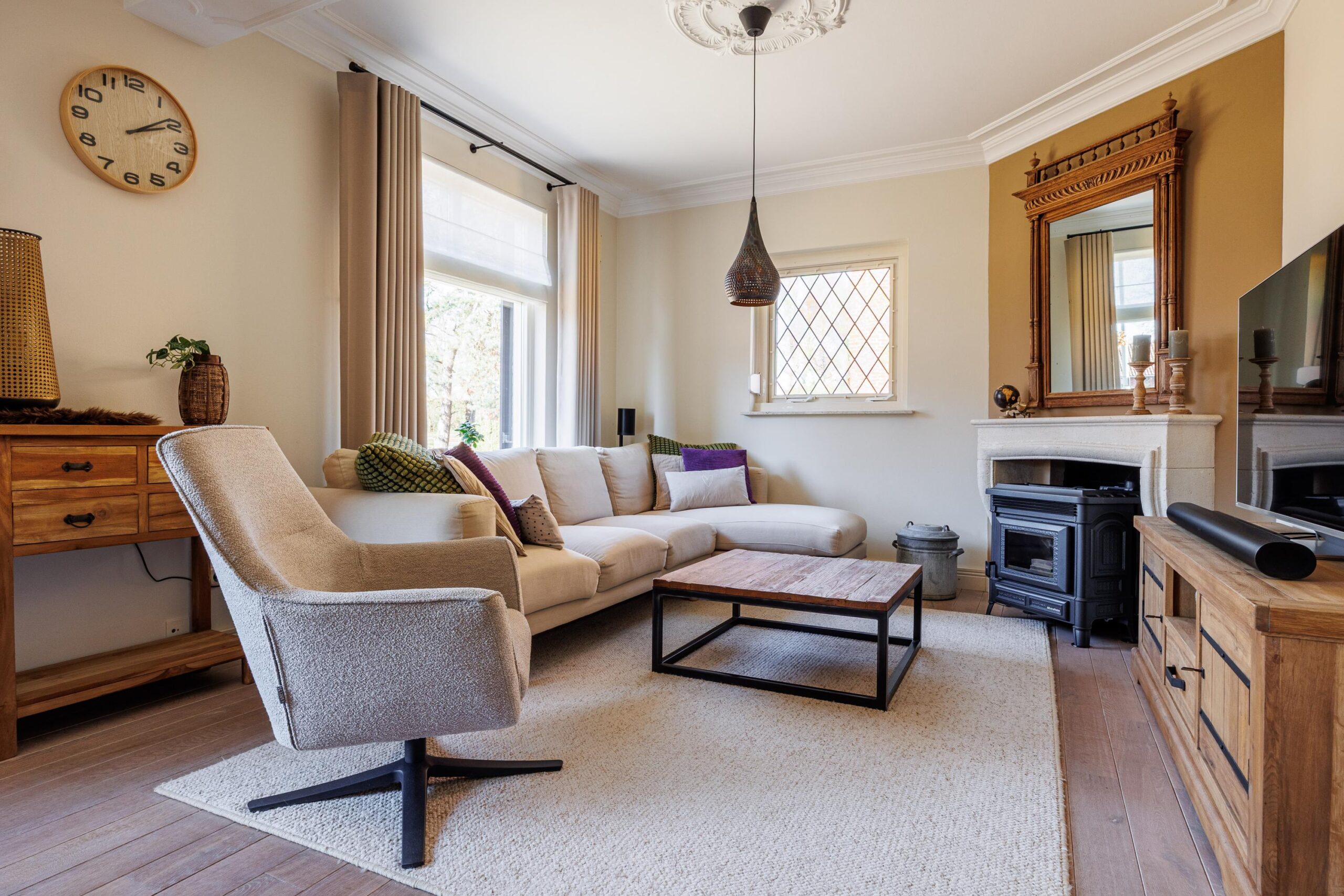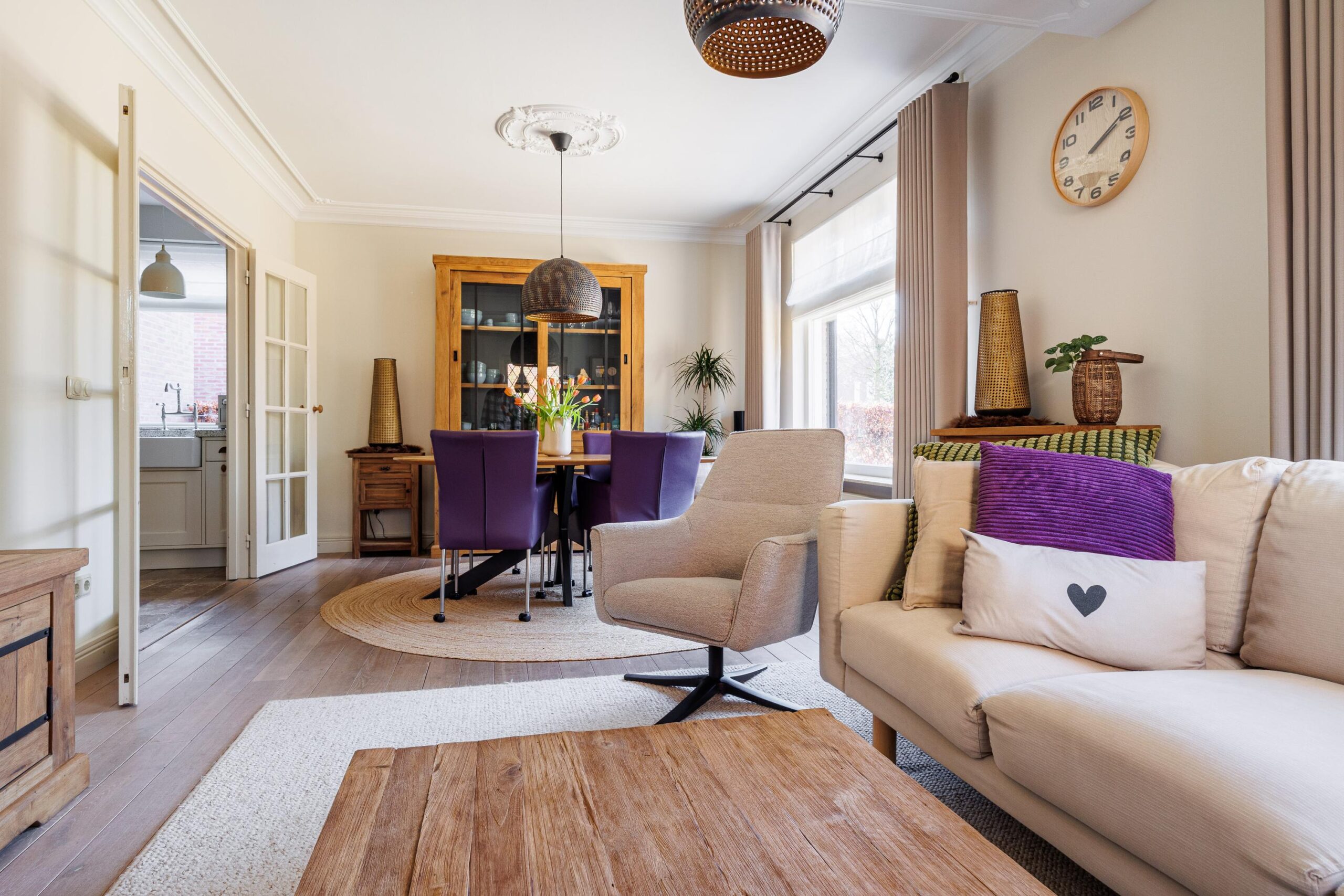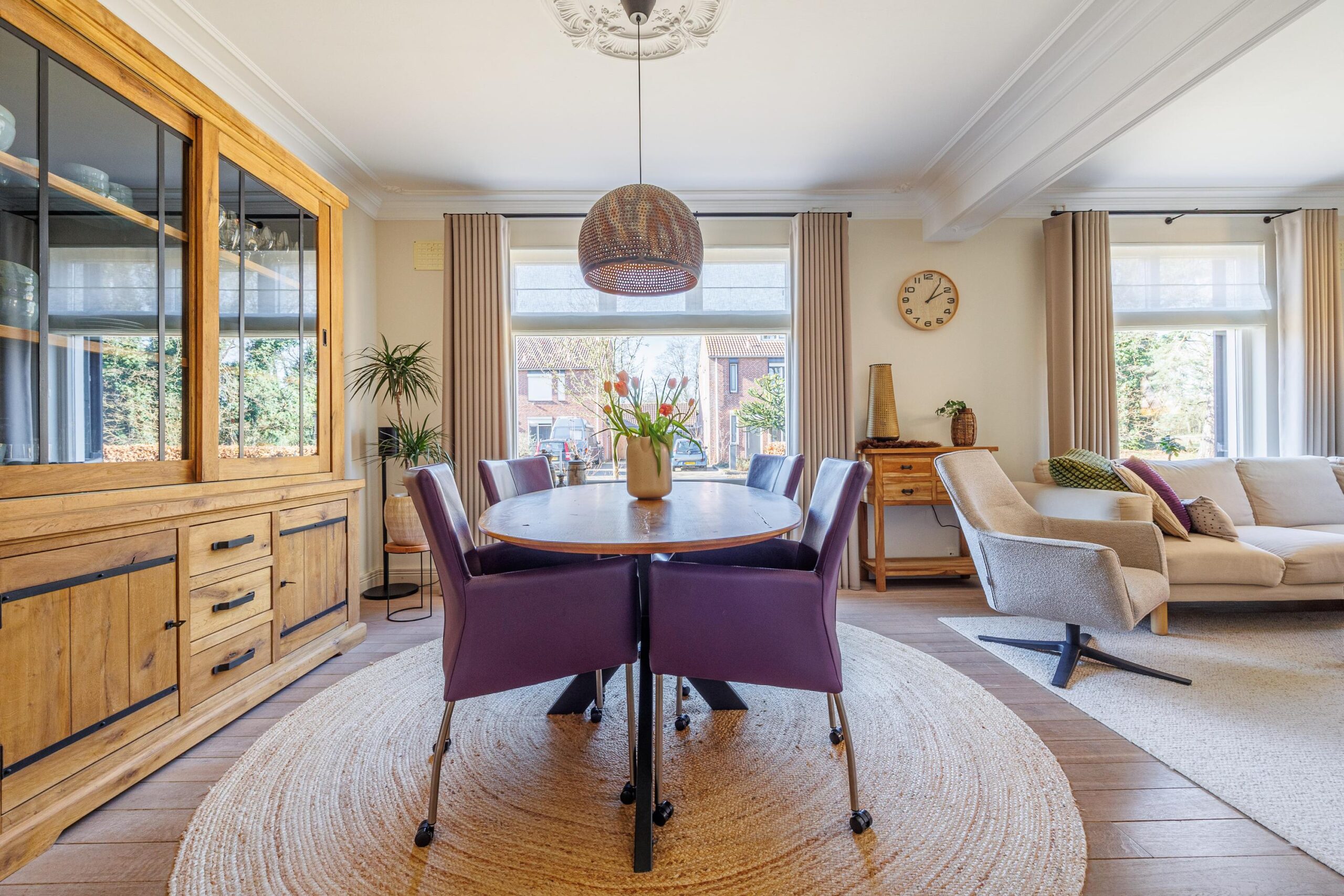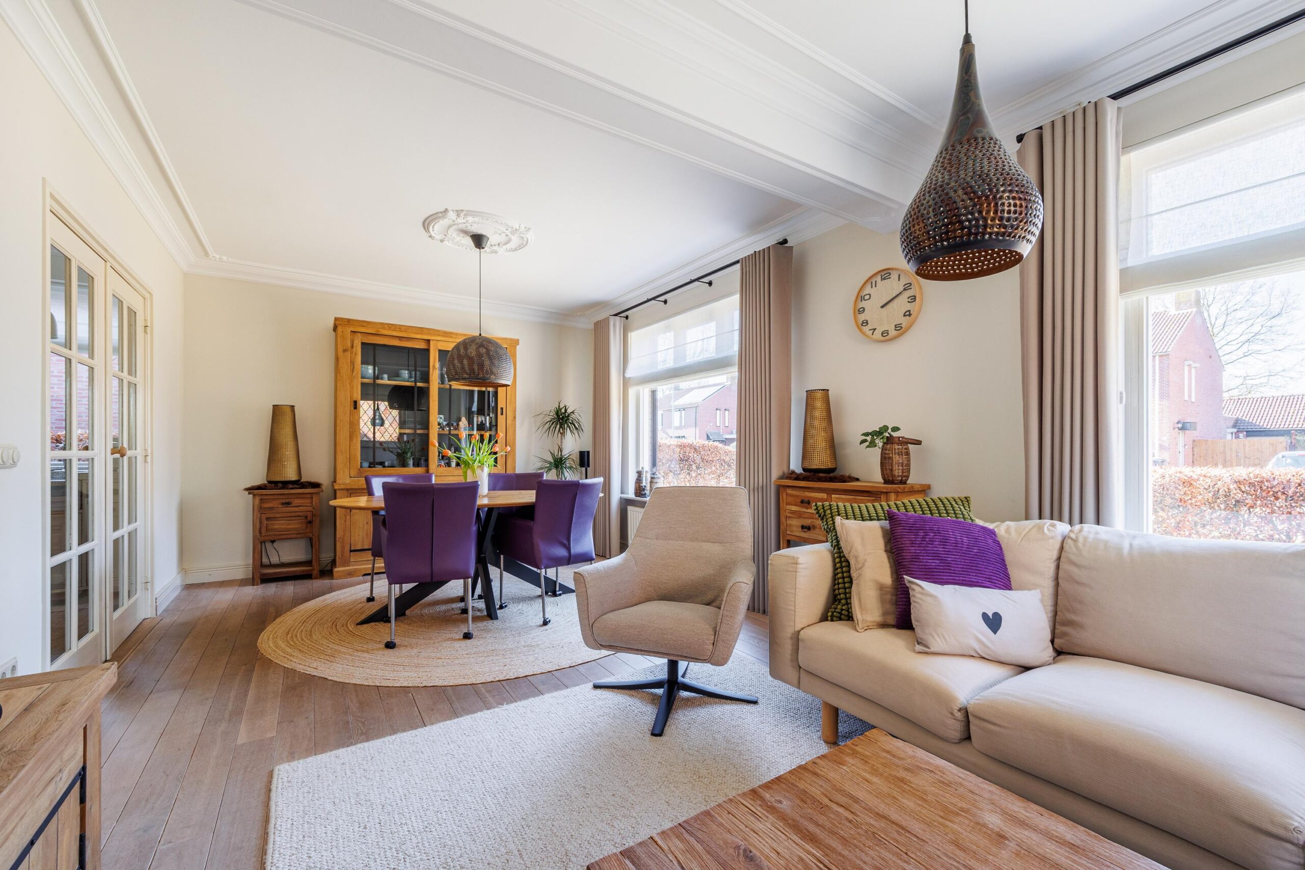 Het plafond van de woonkamer is voorzien van een sierlijst en plafondornament.