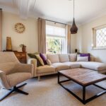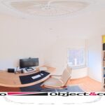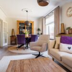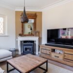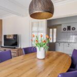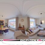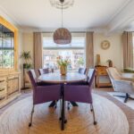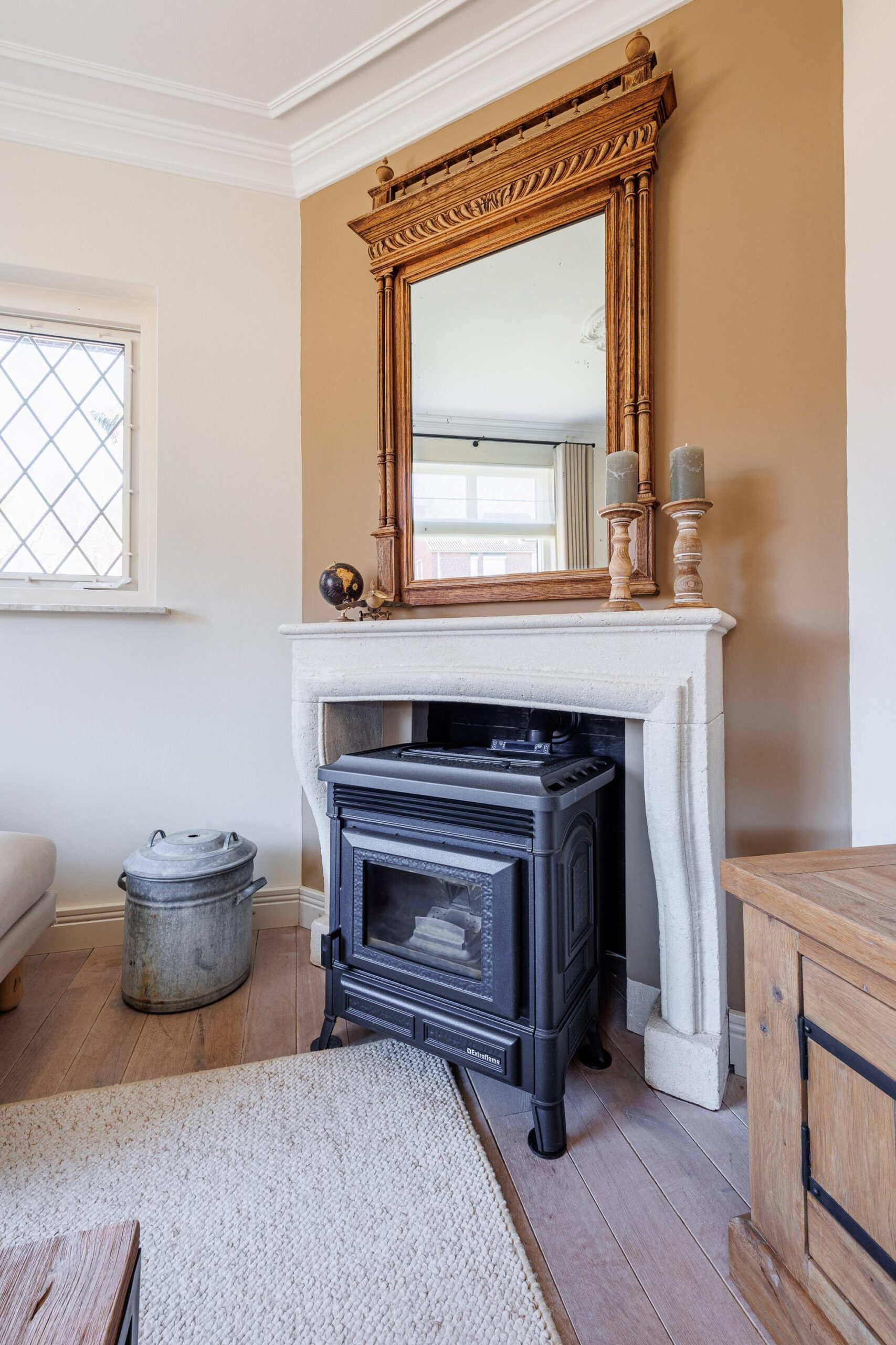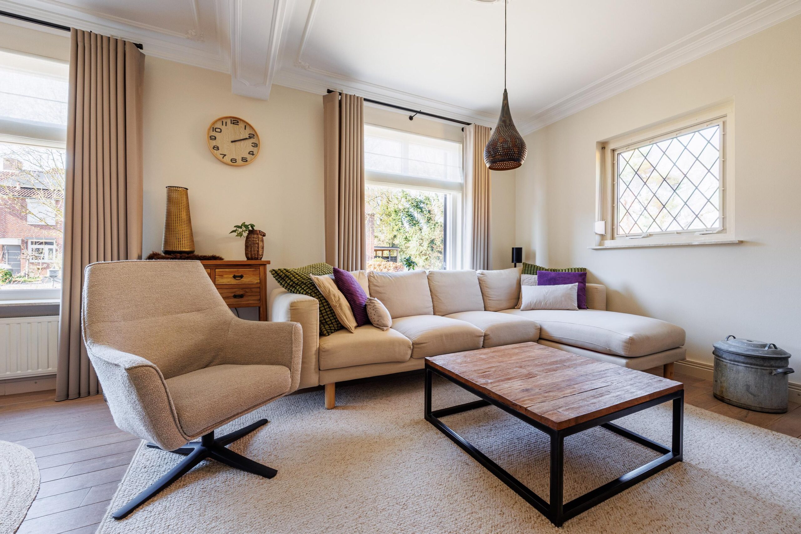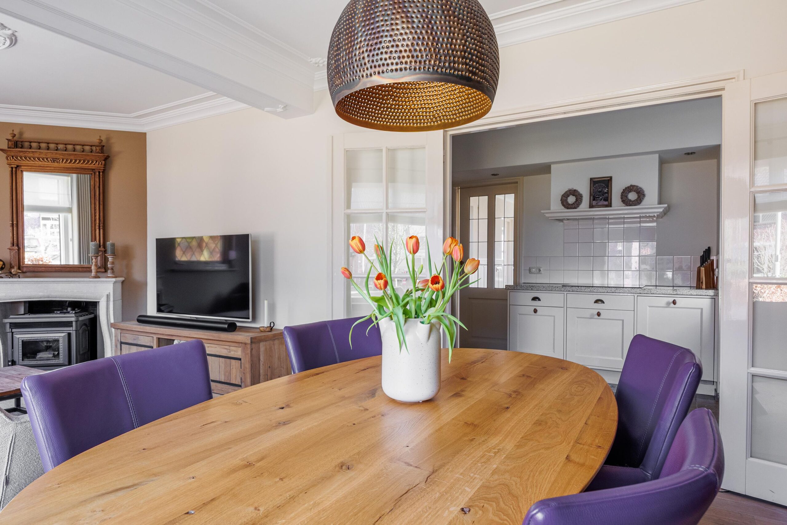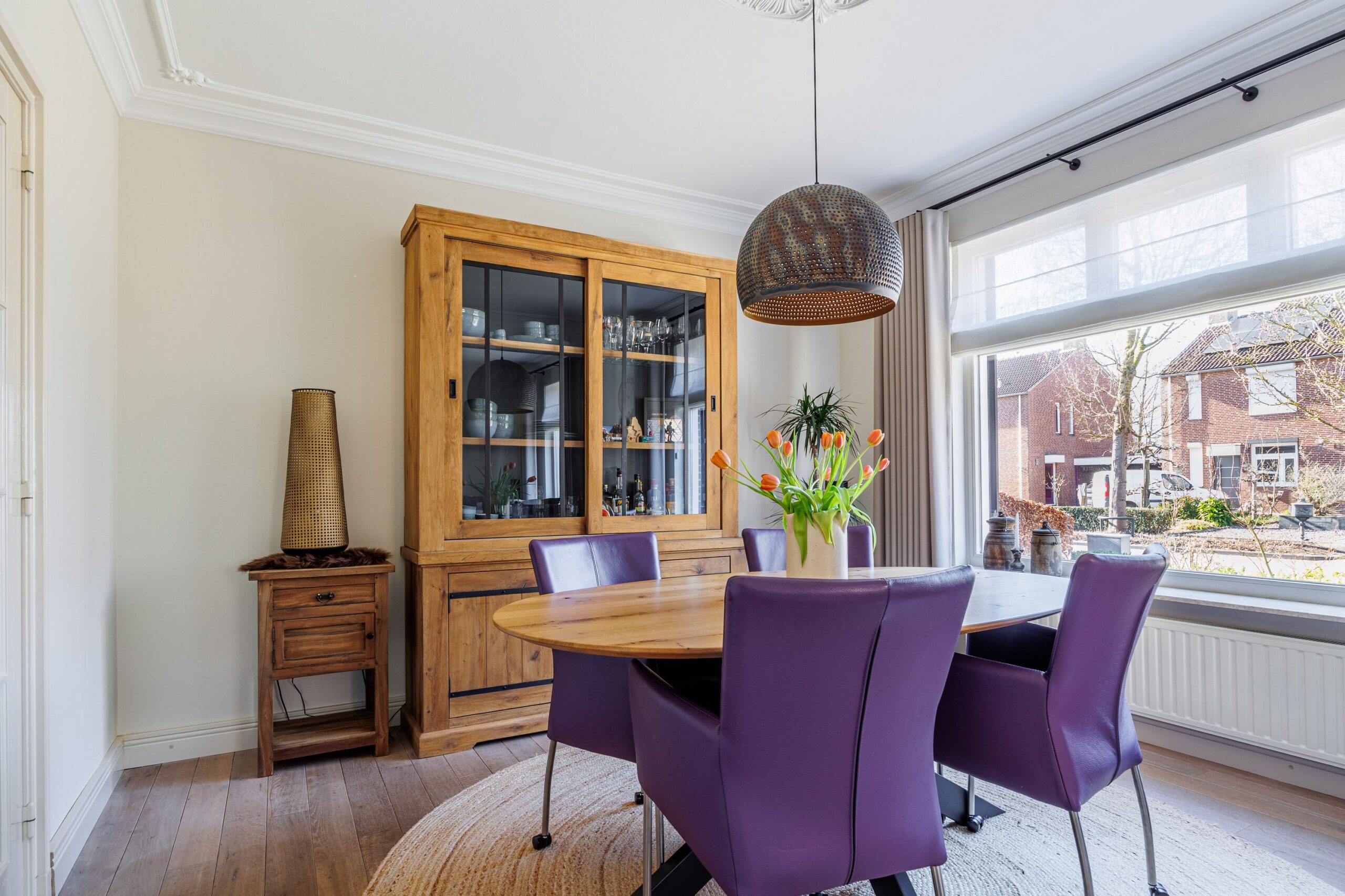 Het plafond van de woonkamer is voorzien van een sierlijst en plafondornament.