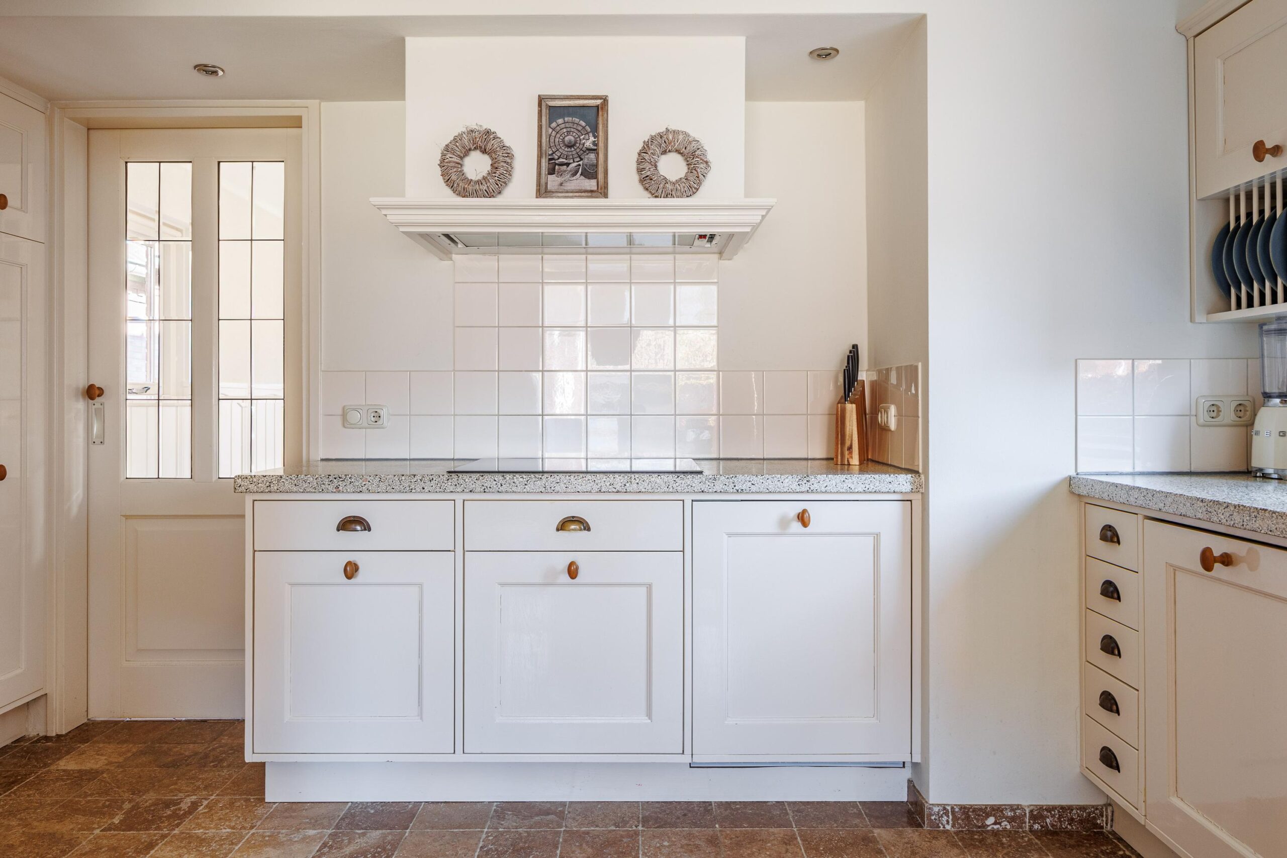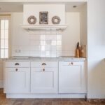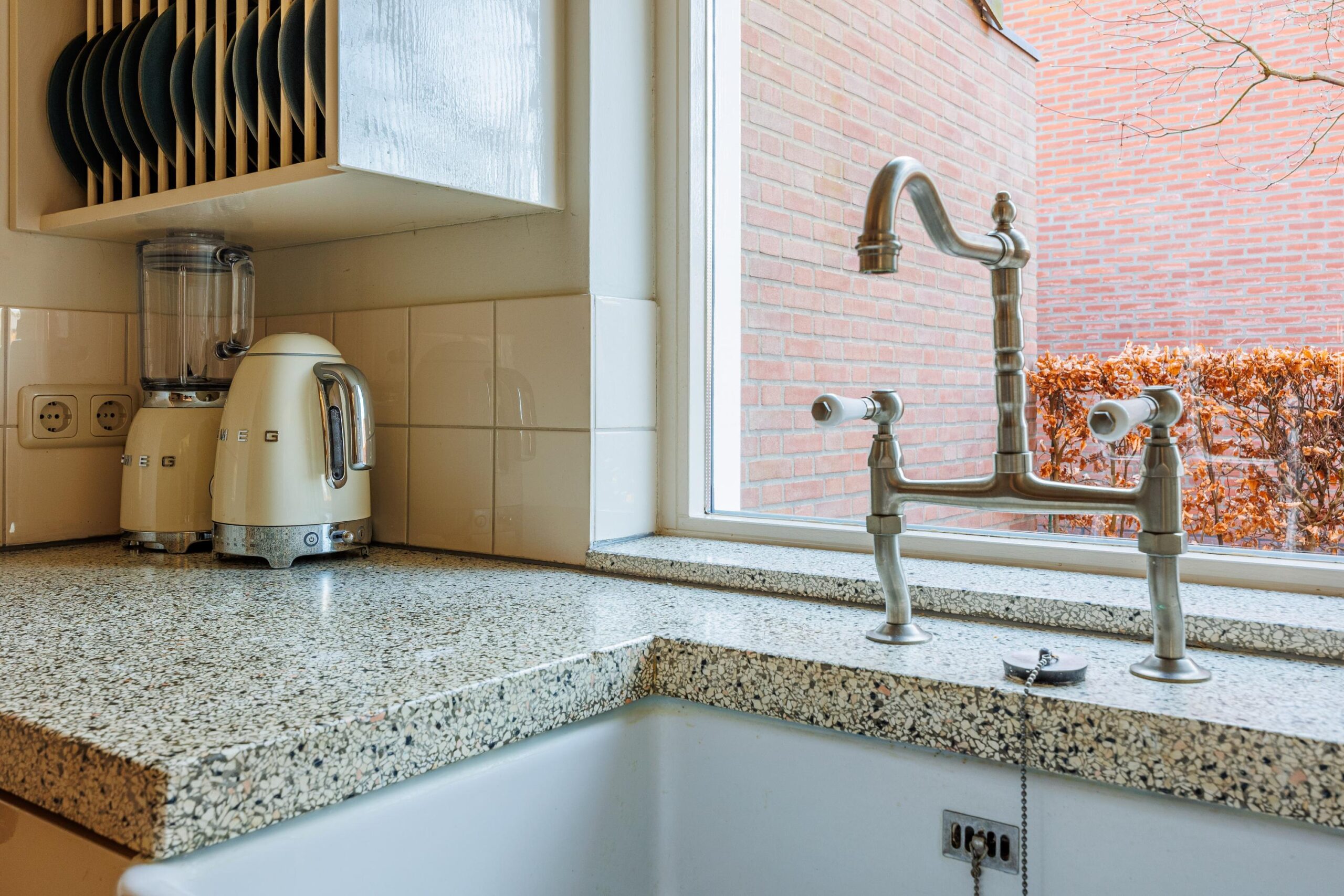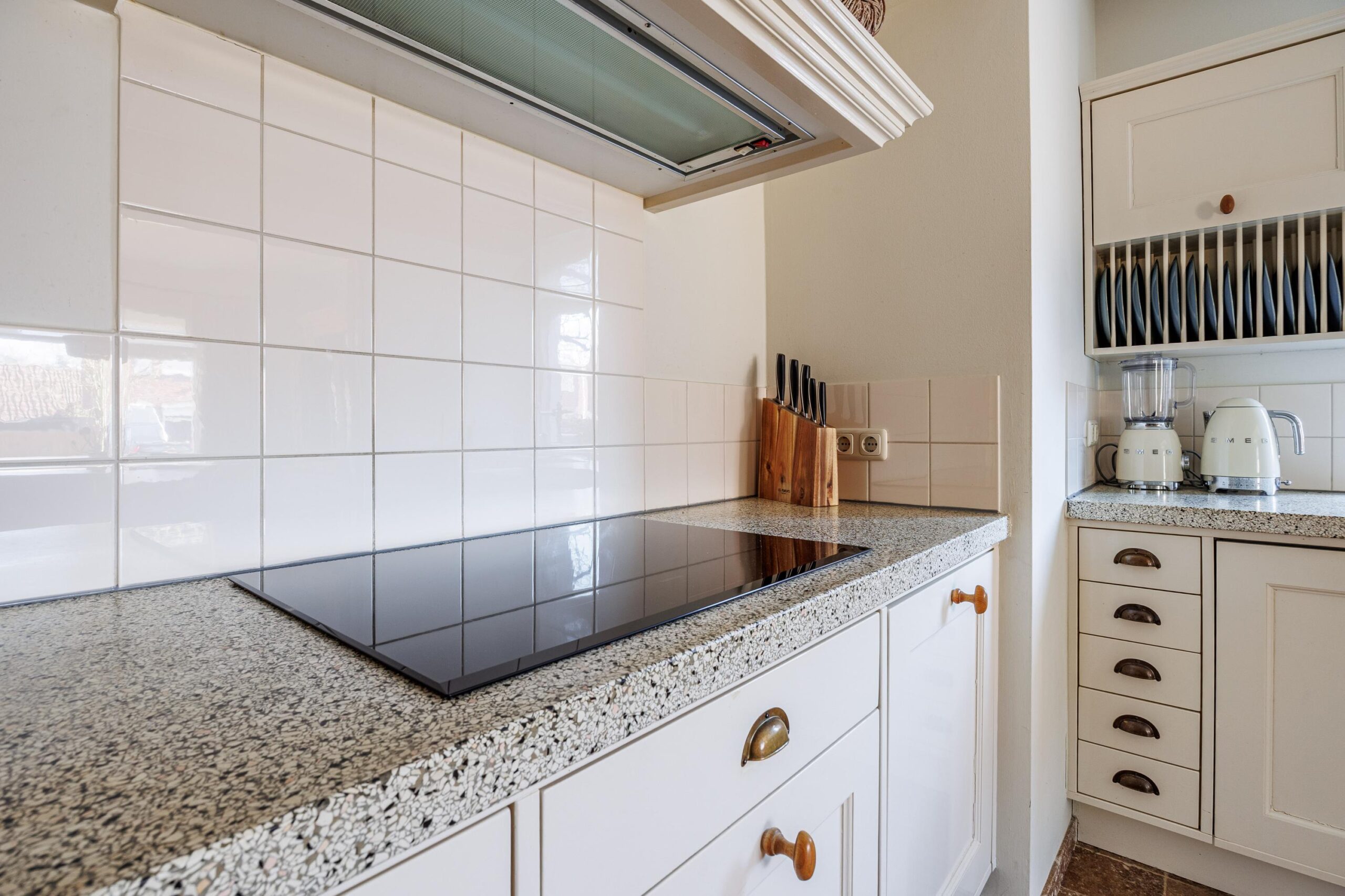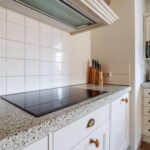 De keukenopstelling met een Terrazo werkblad is voorzien van de volgende inbouwapparatuur: inductiekookplaat (2023), vaatwasser (2023), koellade (2026), afzuigkap/ schouw en een oven.