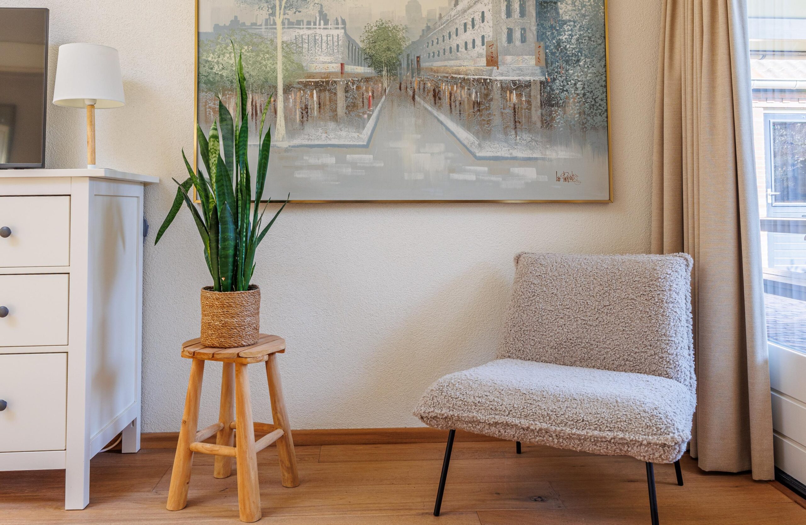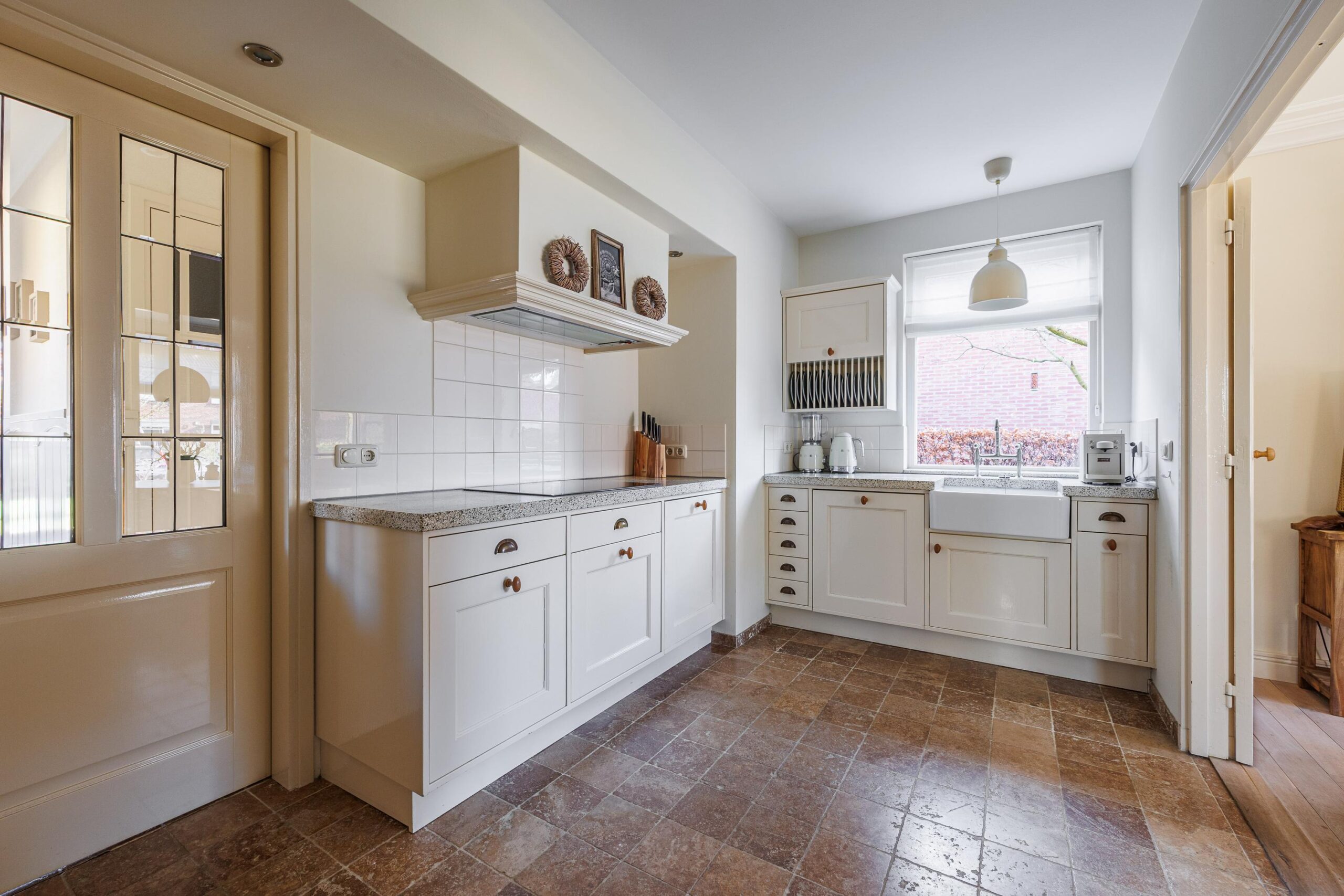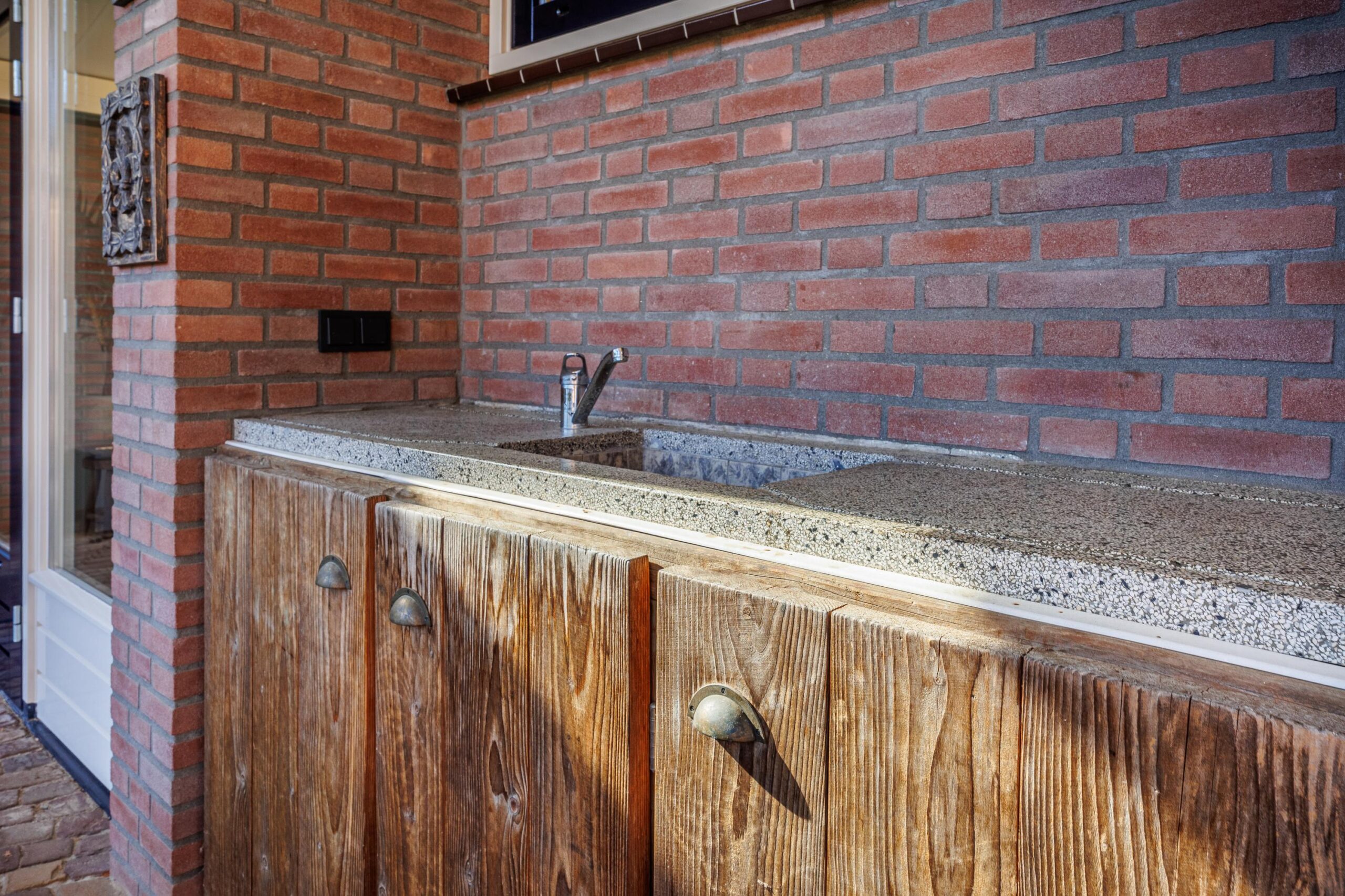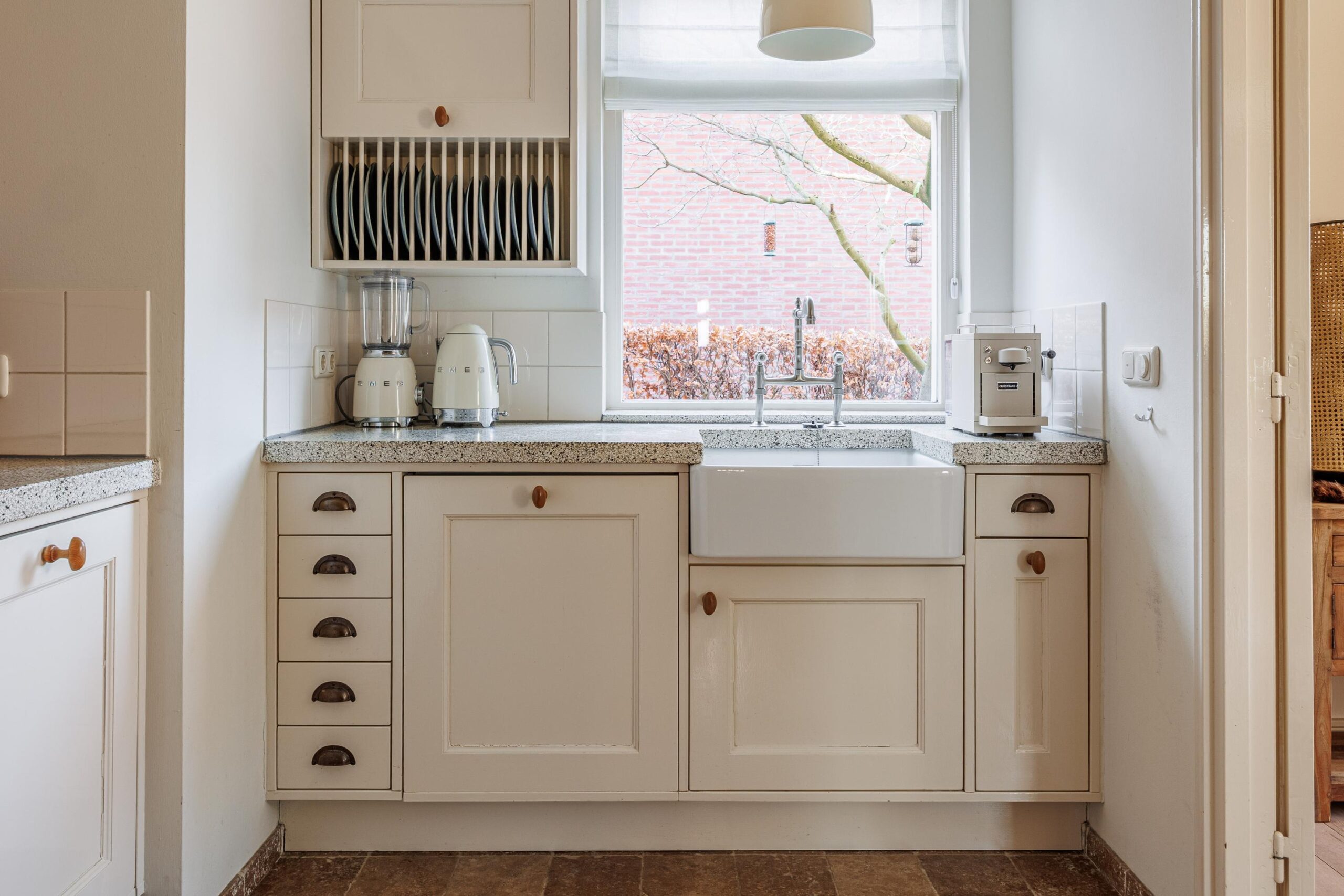 De keukenopstelling met een Terrazo werkblad is voorzien van de volgende inbouwapparatuur: inductiekookplaat (2023), vaatwasser (2023), koellade (2026), afzuigkap/ schouw en een oven.