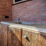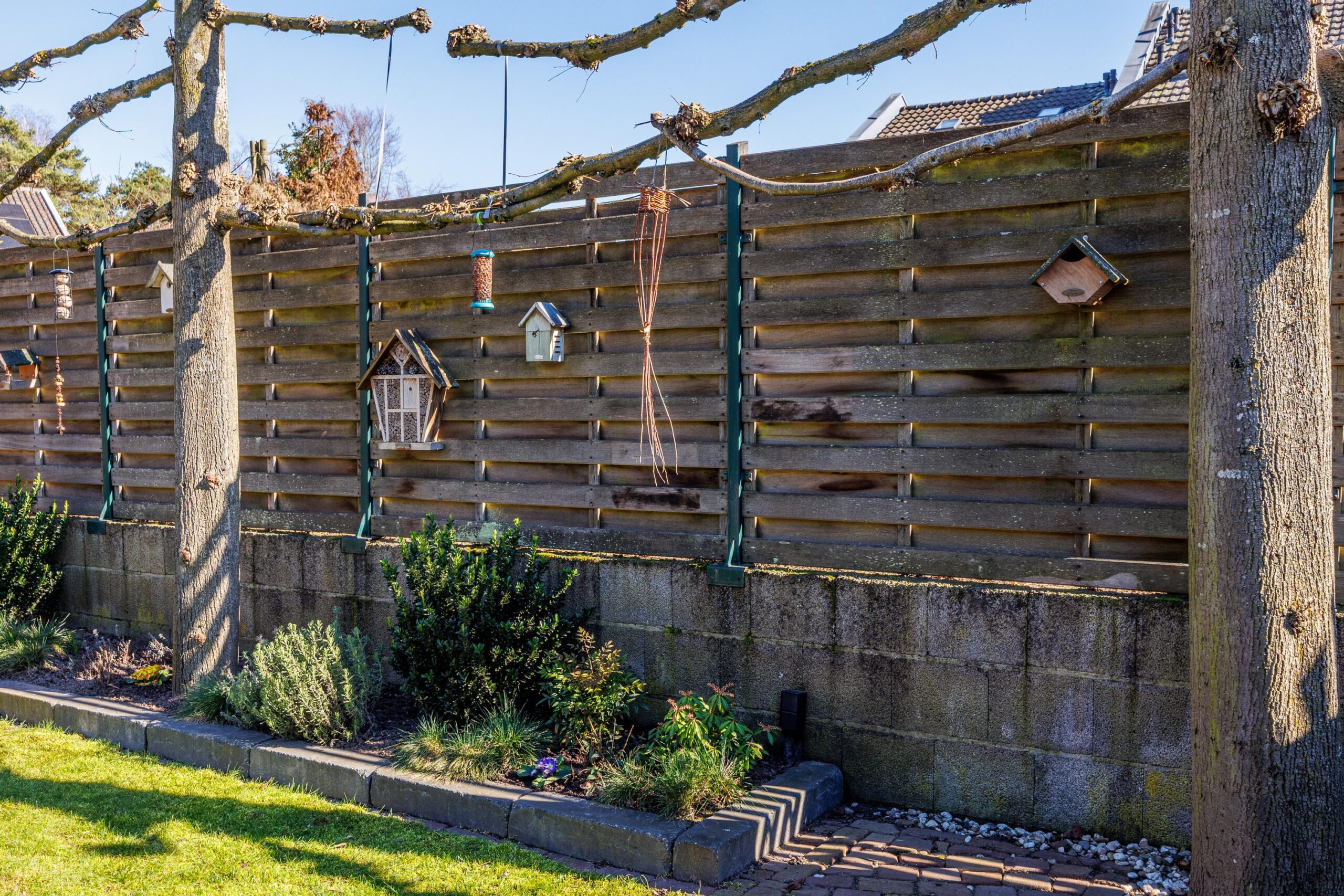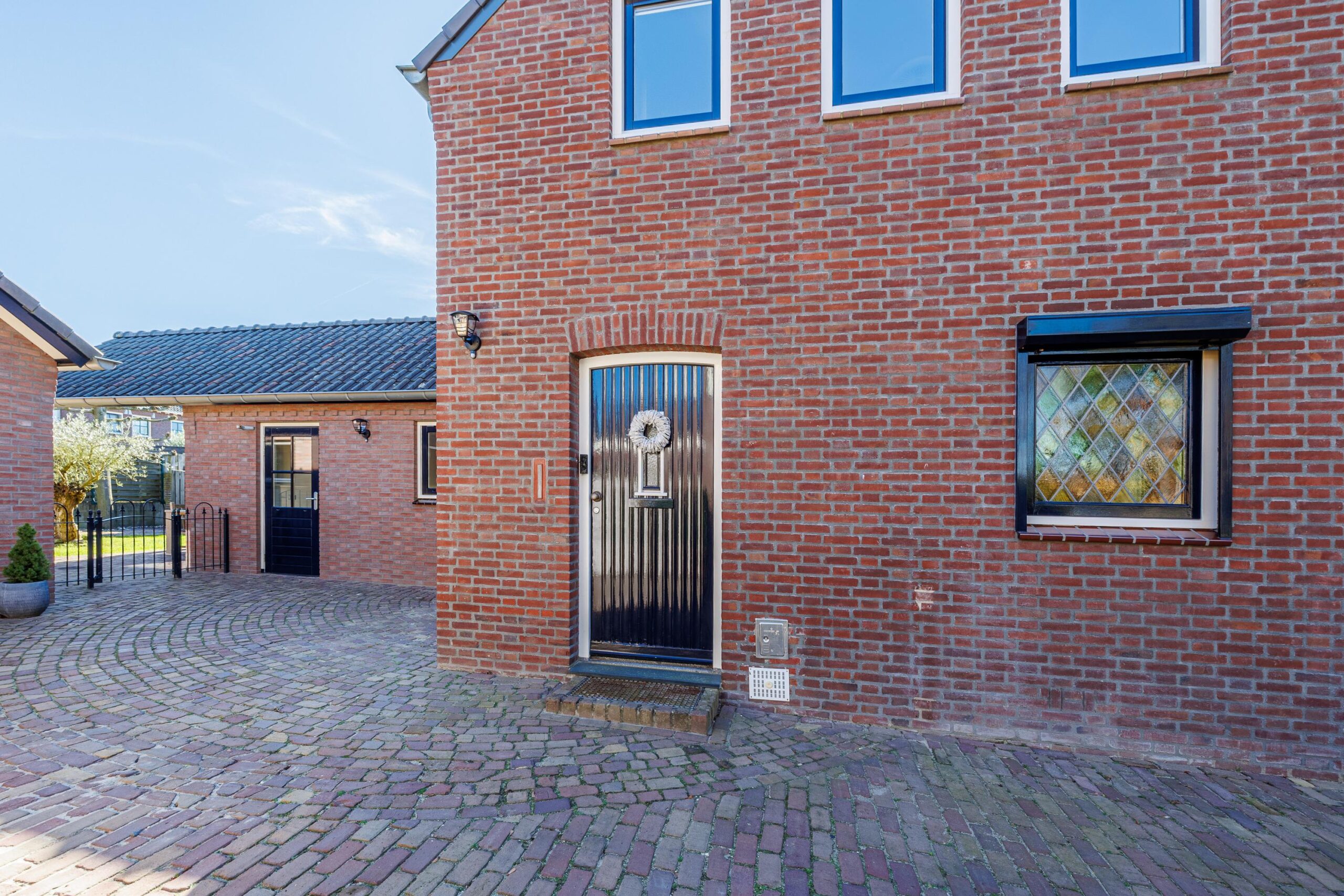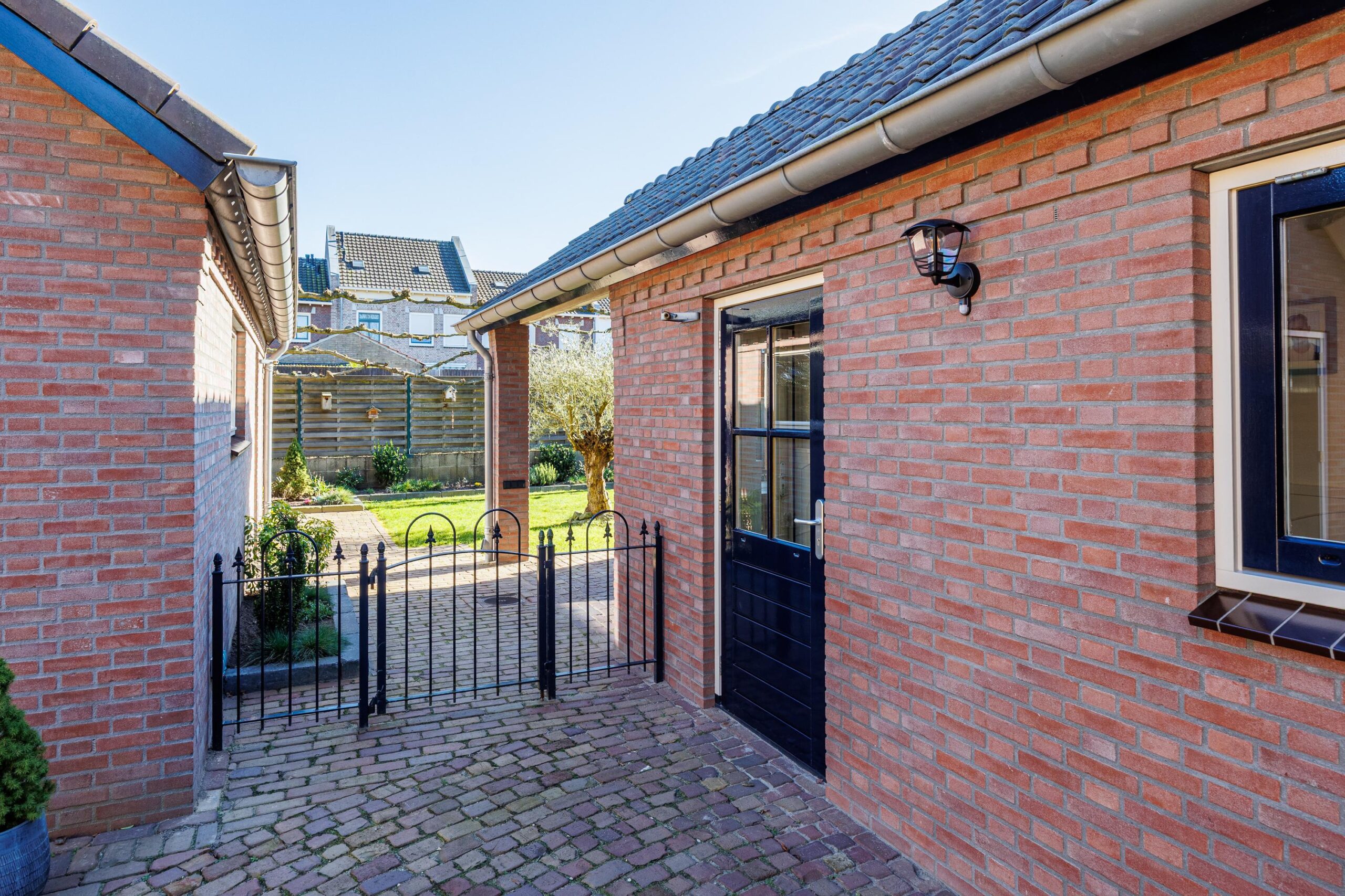 De oprit van het terras in de tuin is gemaakt van gebakken klinkers.