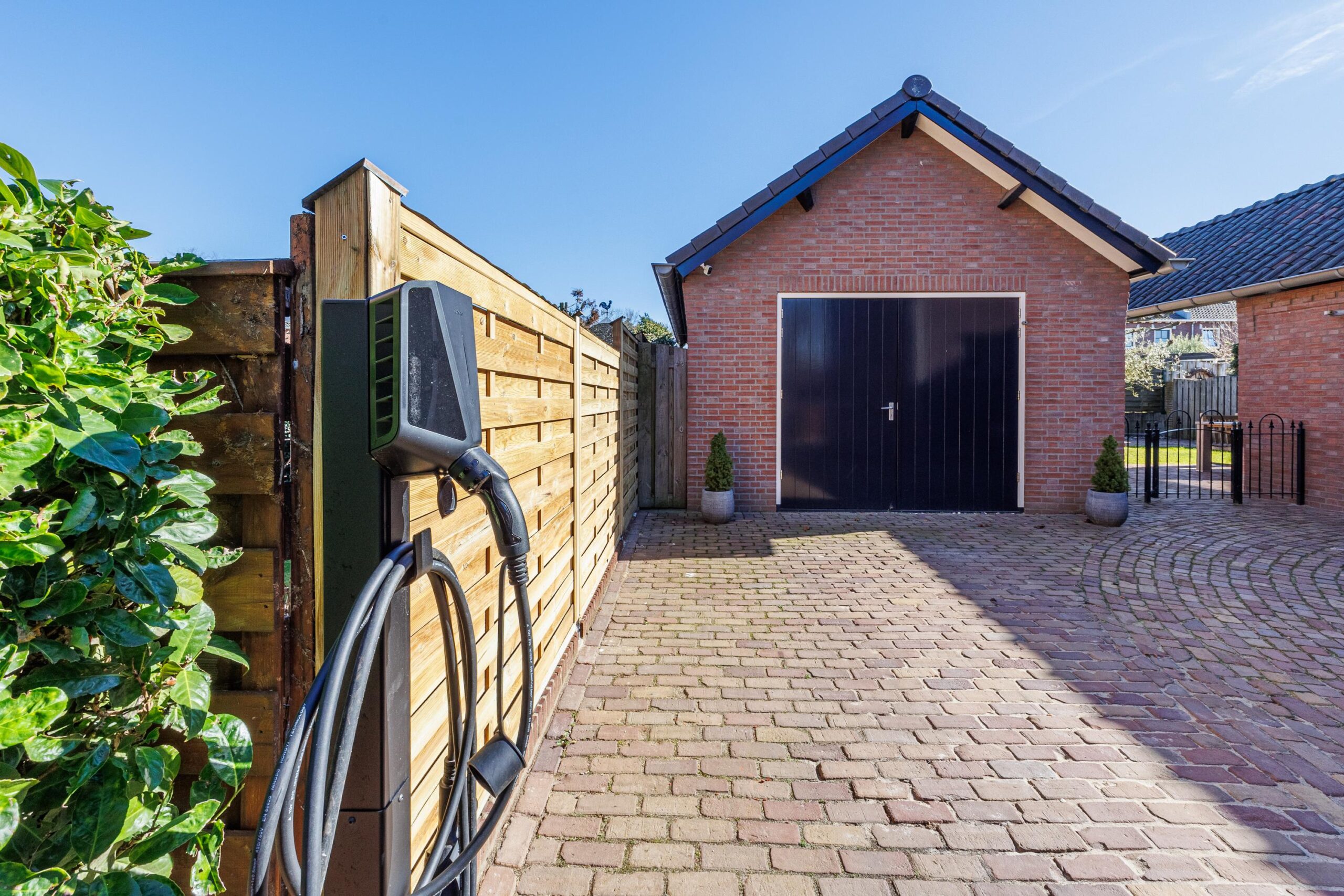 Er is een krachtstroomaansluiting en een laadpaal aanwezig.