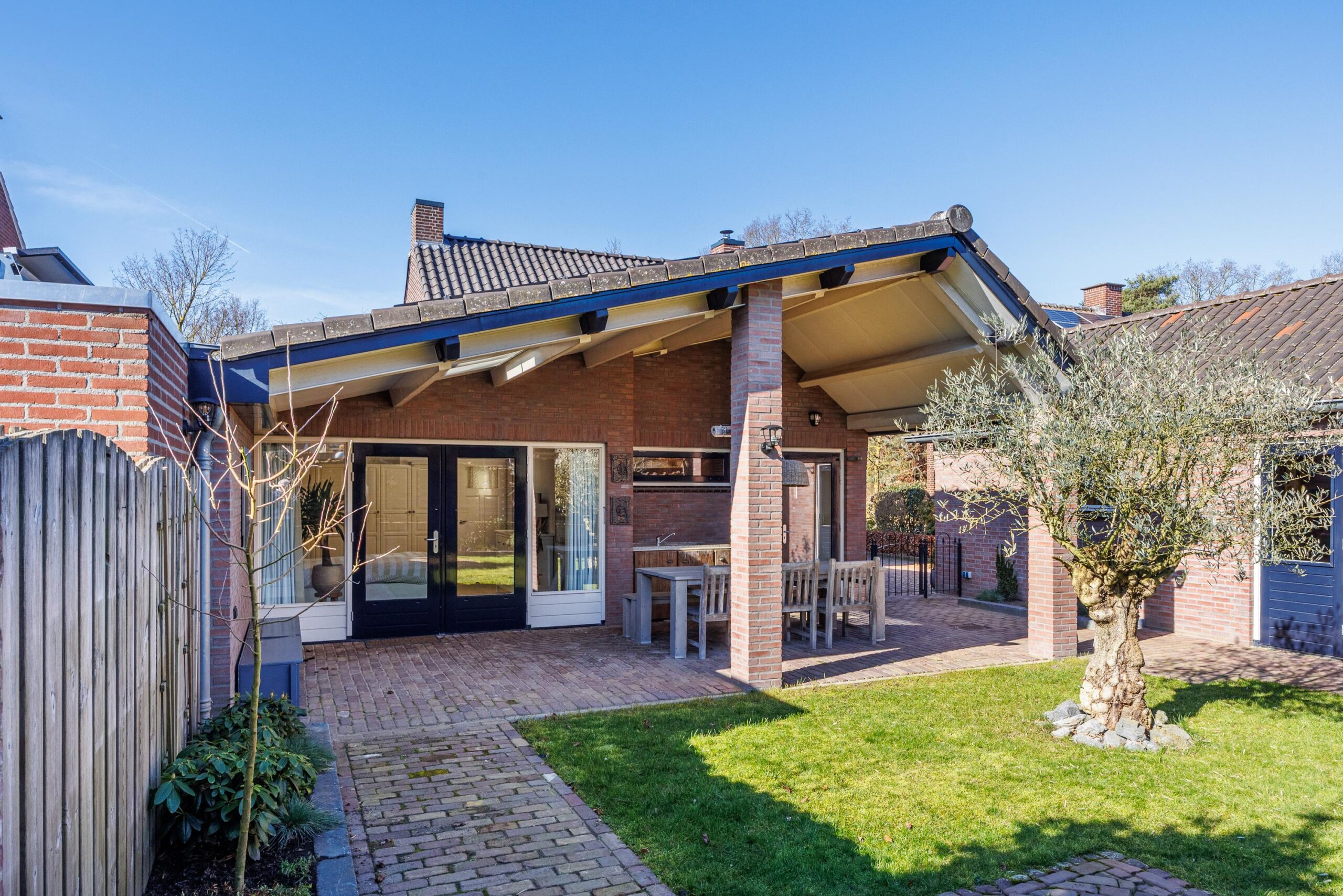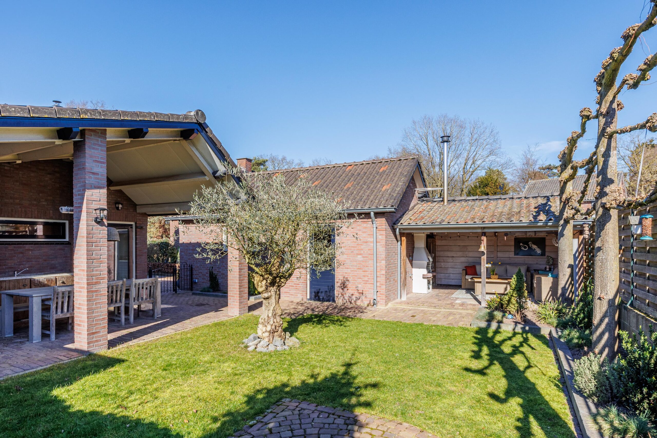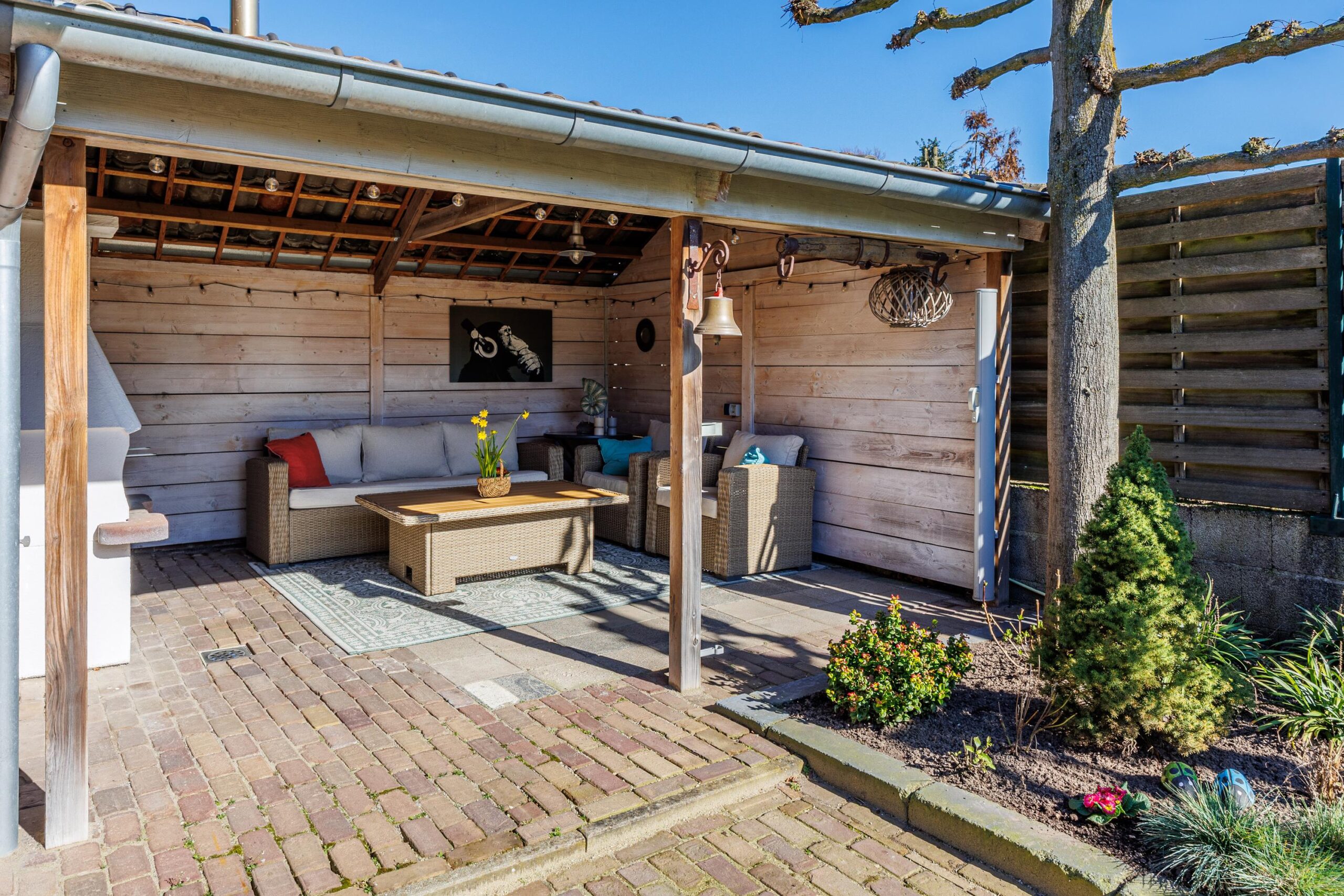 Op het perceel bevinden zich tevens een vrijstaande garage en twee sfeervolle overkappingen, perfect voor het stallen van uw auto, hobbyruimte of voor het creëren van een fijne buitenplek waar u tot in de late uurtjes kunt genieten.