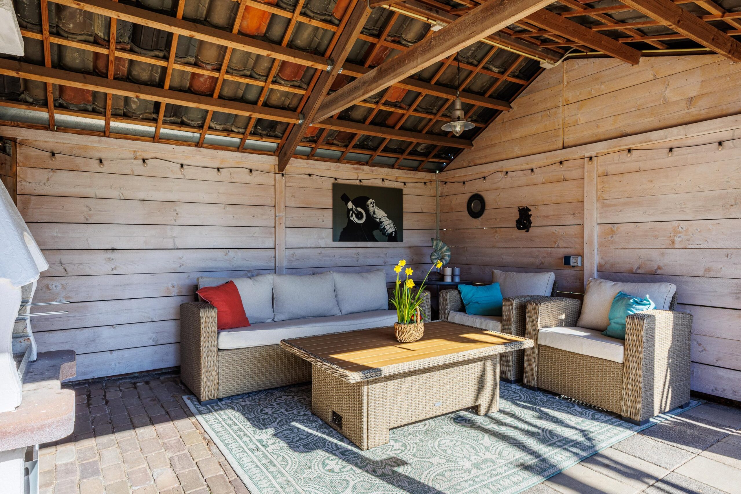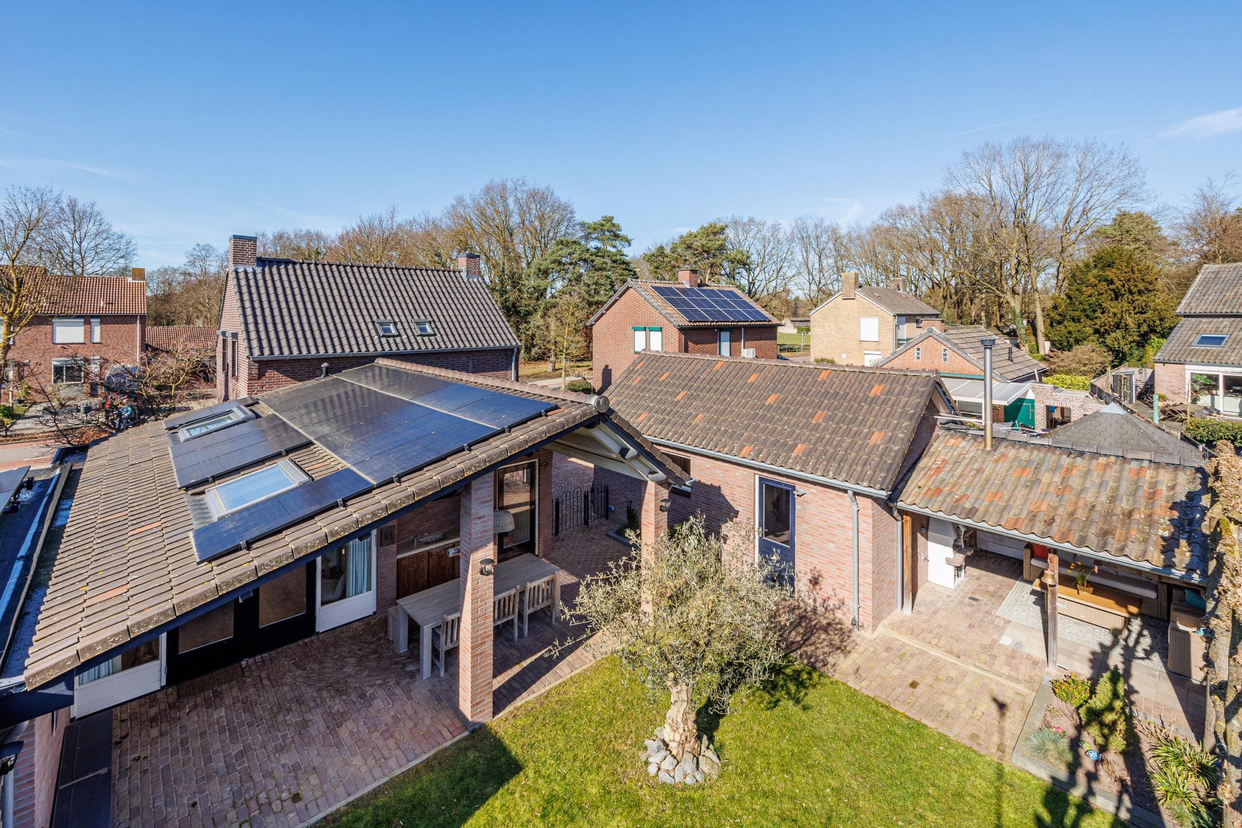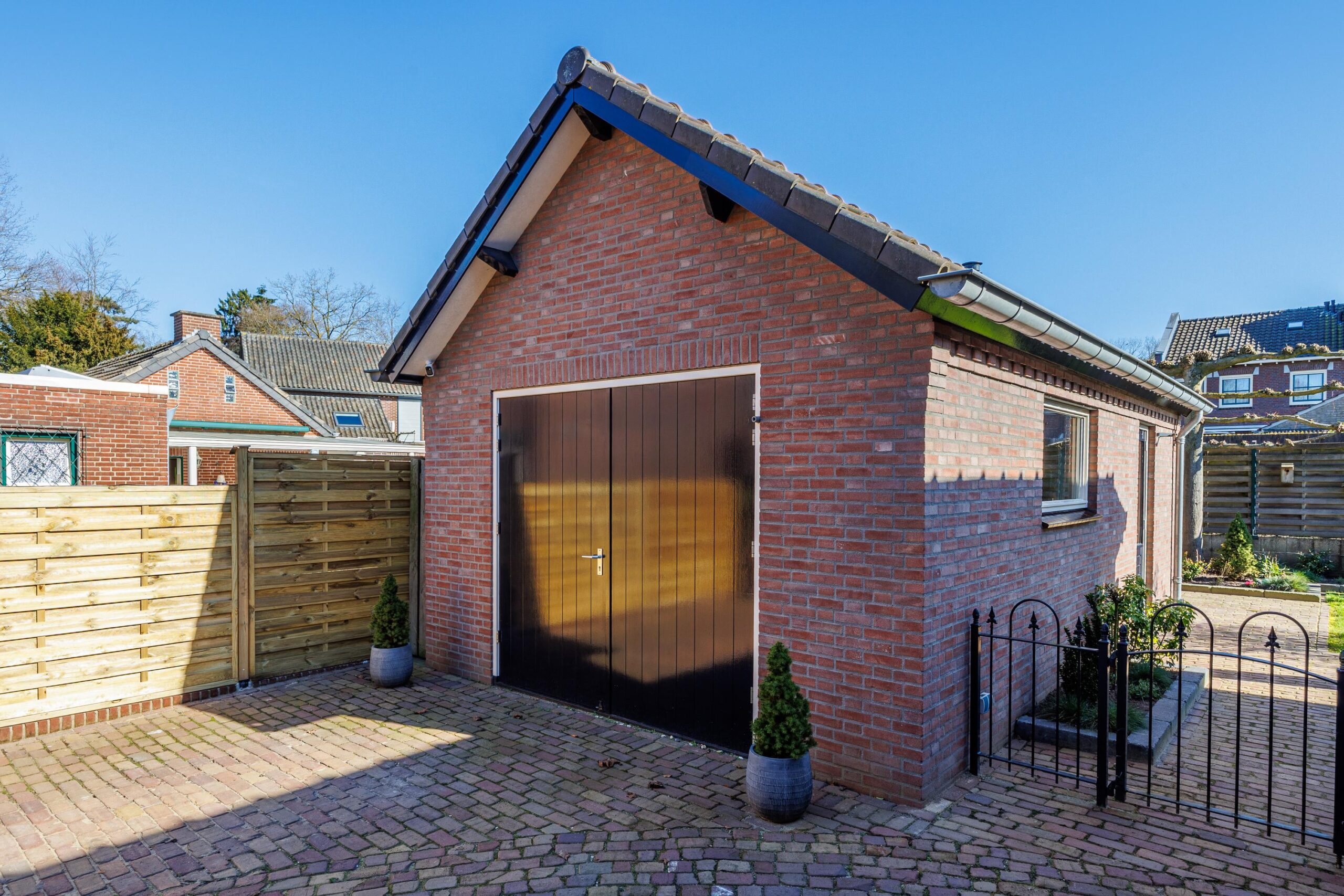Op het perceel bevinden zich tevens een vrijstaande garage en twee sfeervolle overkappingen, perfect voor het stallen van uw auto, hobbyruimte of voor het creëren van een fijne buitenplek waar u tot in de late uurtjes kunt genieten.