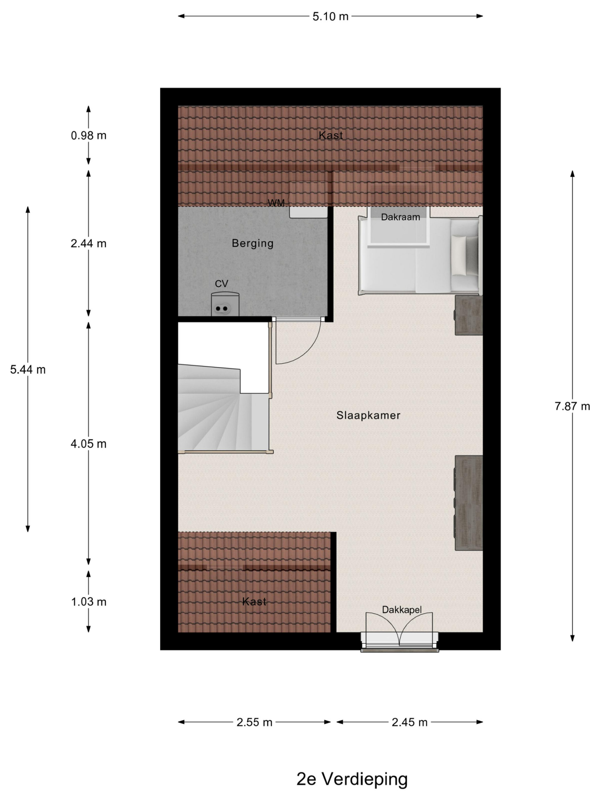 2e verdieping: grote zolderruimte met de mogelijkheid om deze als 3e slaapkamer in gebruik te nemen, technische ruimte met warmte terugwin installatie, witgoedaansluitingen en warmtepomp. Aan de voorzijde is een grote dakkapel aanwezig, waardoor er veel licht naar binnen komt.