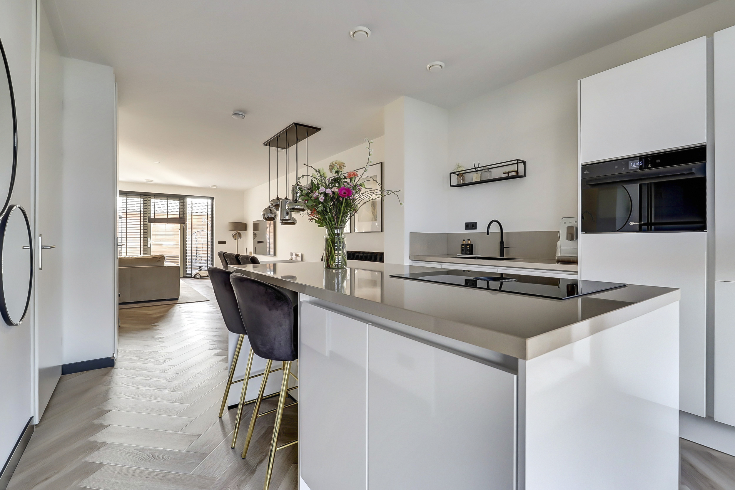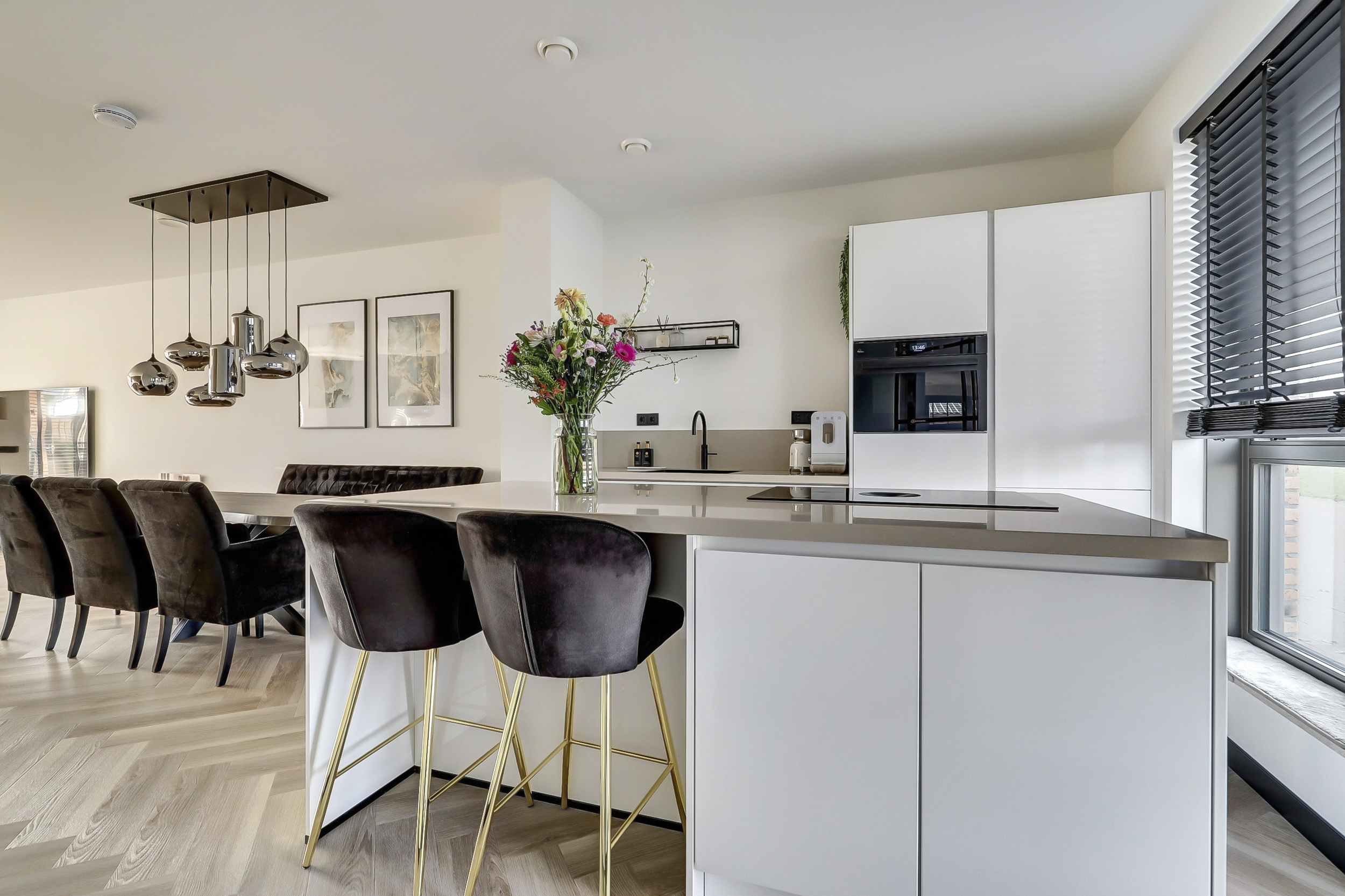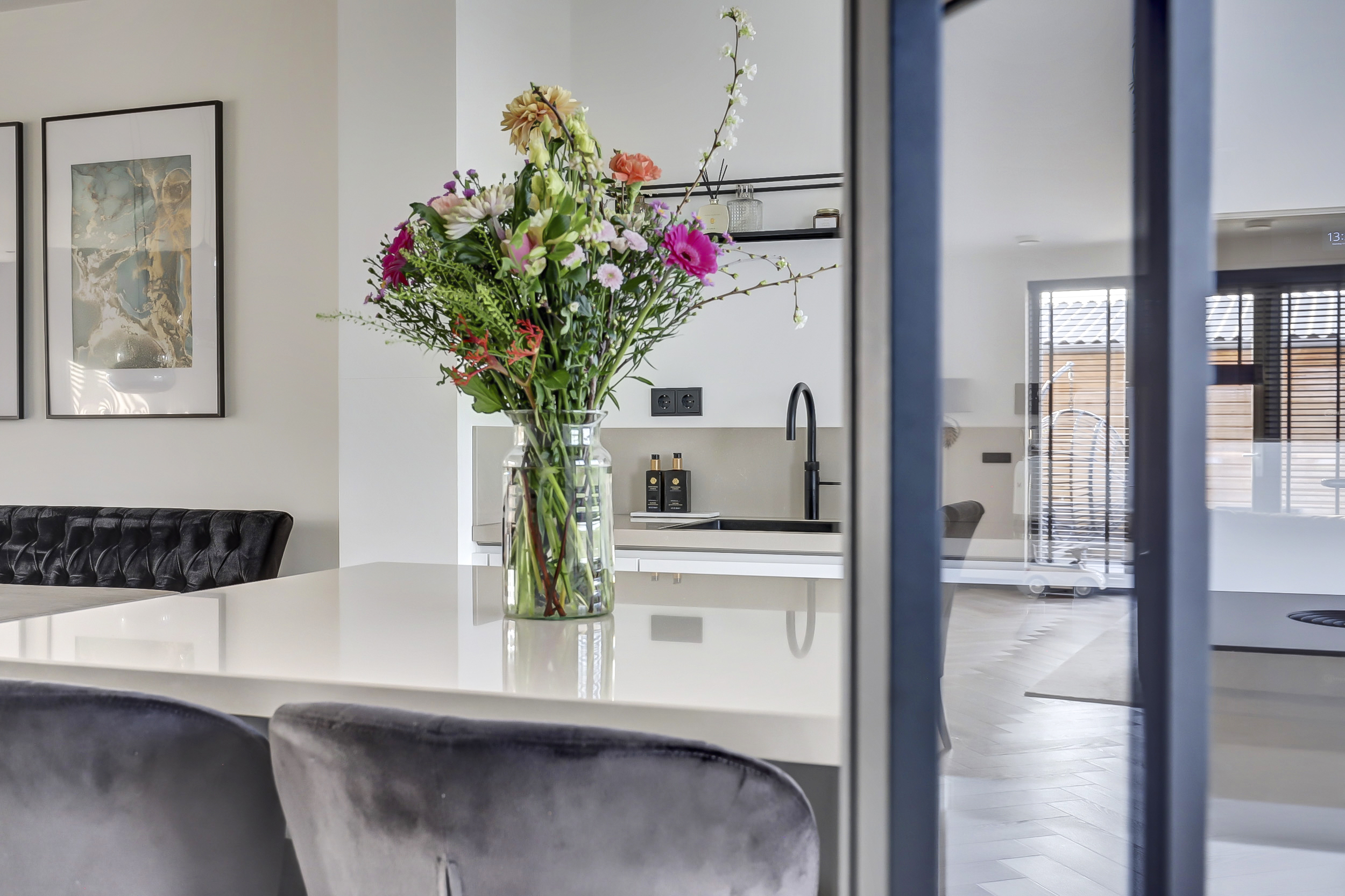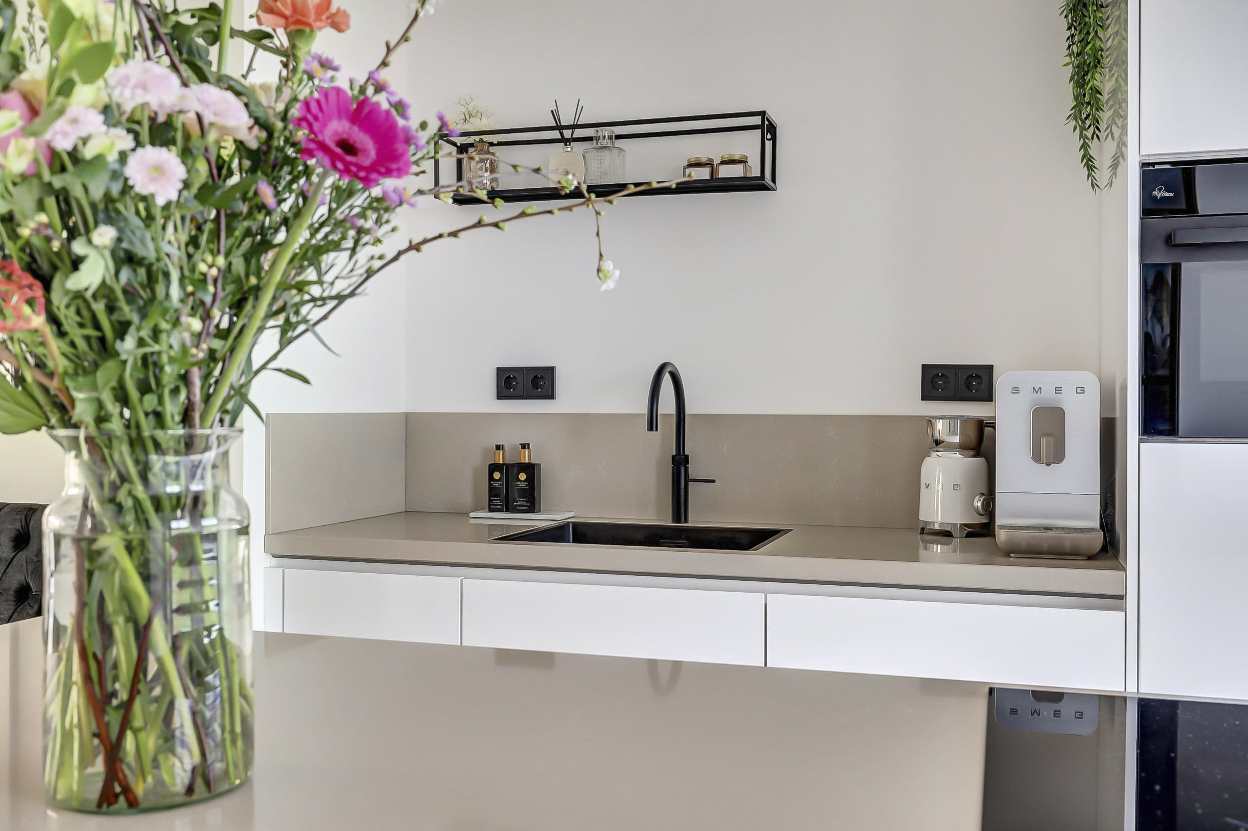 De keukenopstelling is voorzien van een Bora inductiekookplaat, combioven, vaatwasser, koelkast en Quooker.