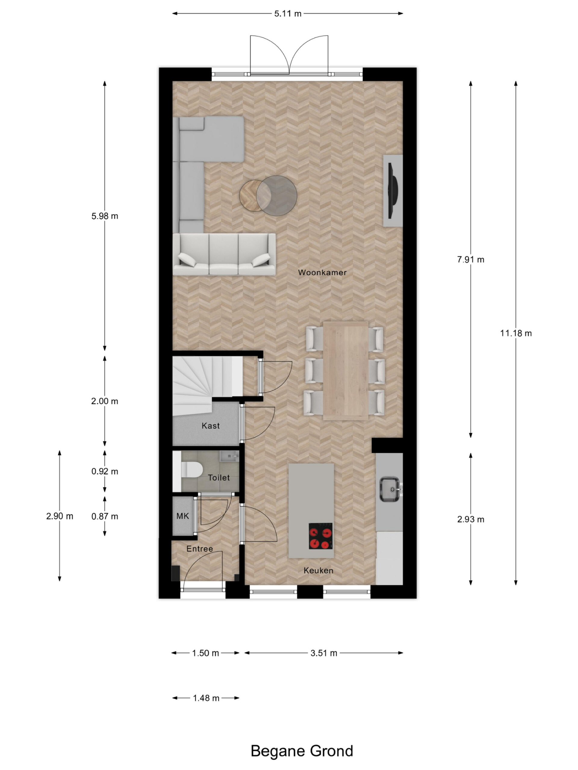 Begane grond: hal met meterkast, trapkast en toilet met wandcloset en fonteintje. Woonkamer met een uitbouw en openslaande tuindeuren, open keuken, welke aan de voorzijde van de woning gelegen is.