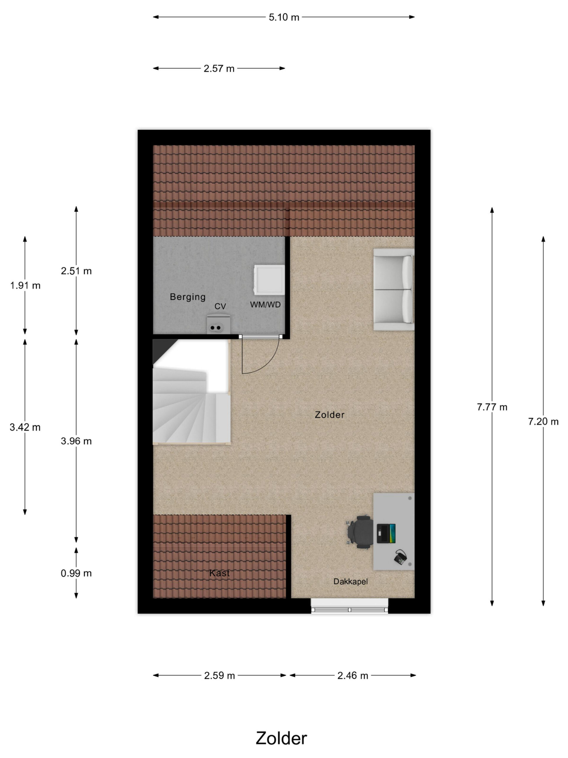 2e verdieping: grote zolderruimte met de mogelijkheid om deze als 4e slaapkamer in gebruik te nemen, technische ruimte met warmte terugwin installatie, witgoedaansluitingen en warmtepomp. Aan de voorzijde is een grote dakkapel aanwezig, waardoor er veel licht naar binnen komt.