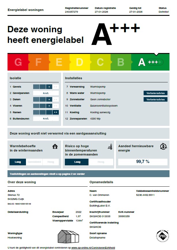De woning is volledig geïsoleerd, heeft hardhouten kozijnen met triple beglazing, beschikt over vloerverwarming- en koeling en is uitstekend afgewerkt. Er zijn 10 zonnepanelen aanwezig.
