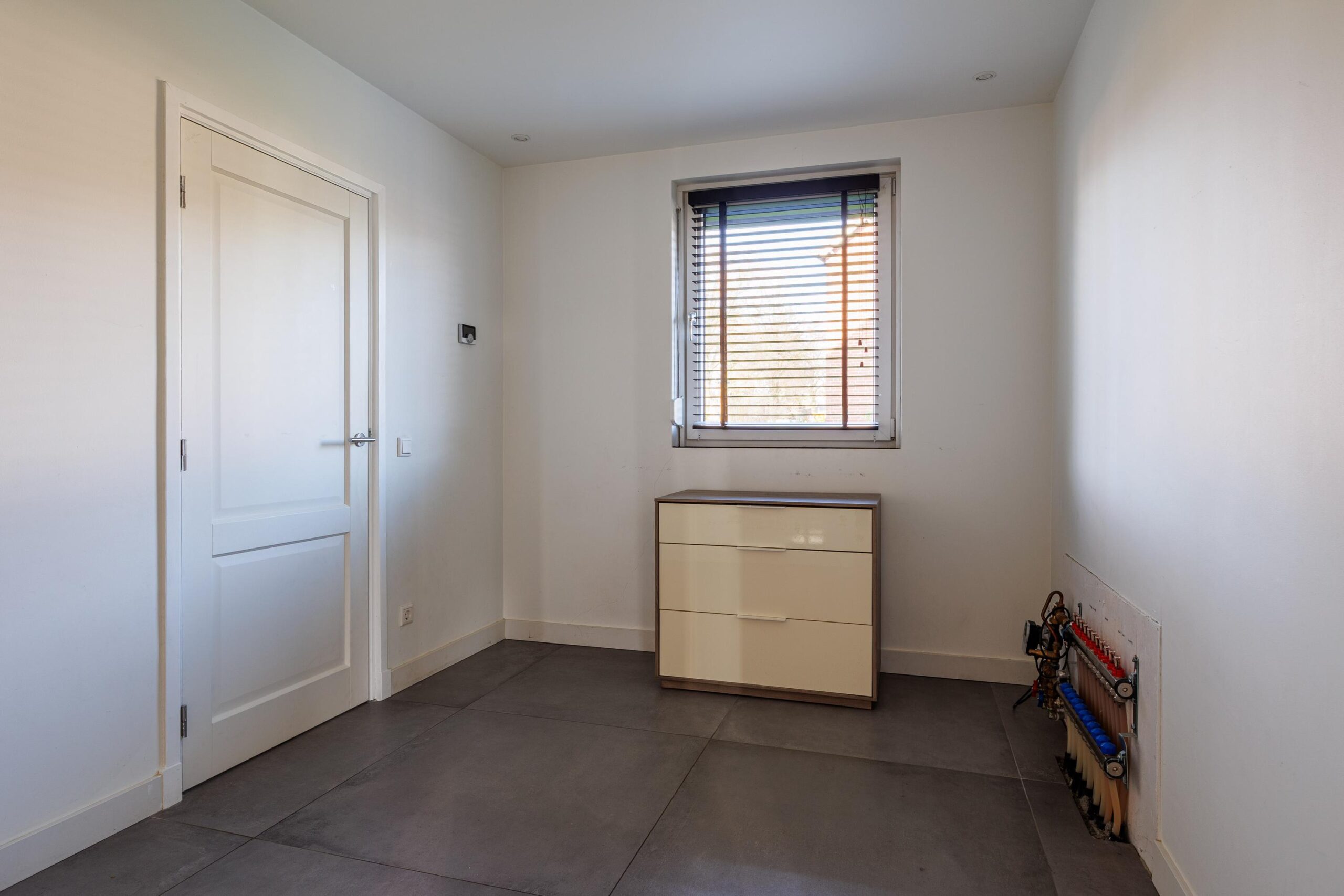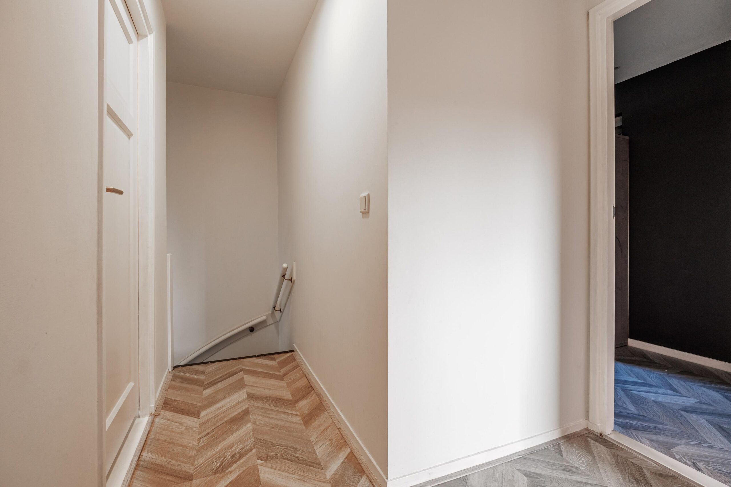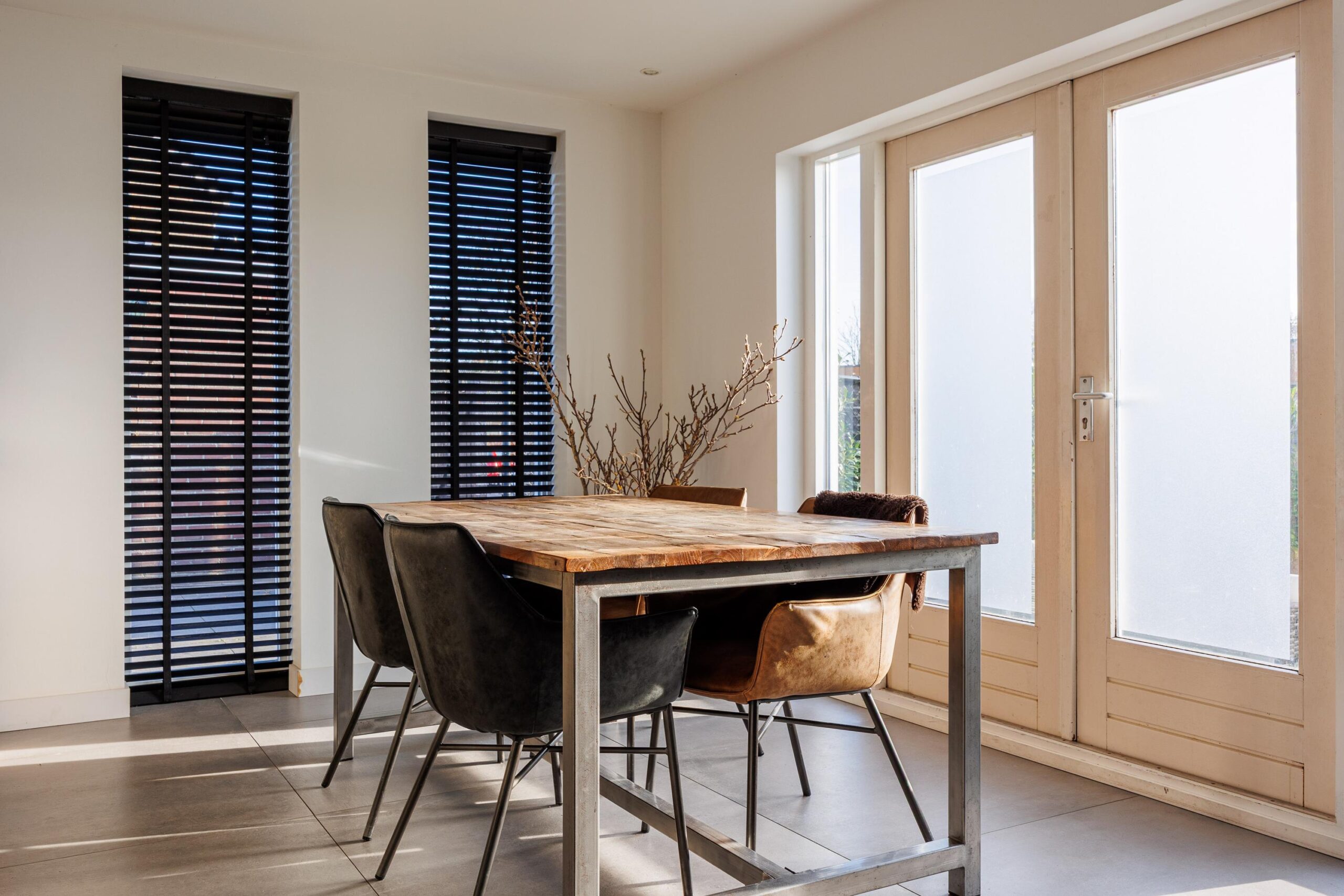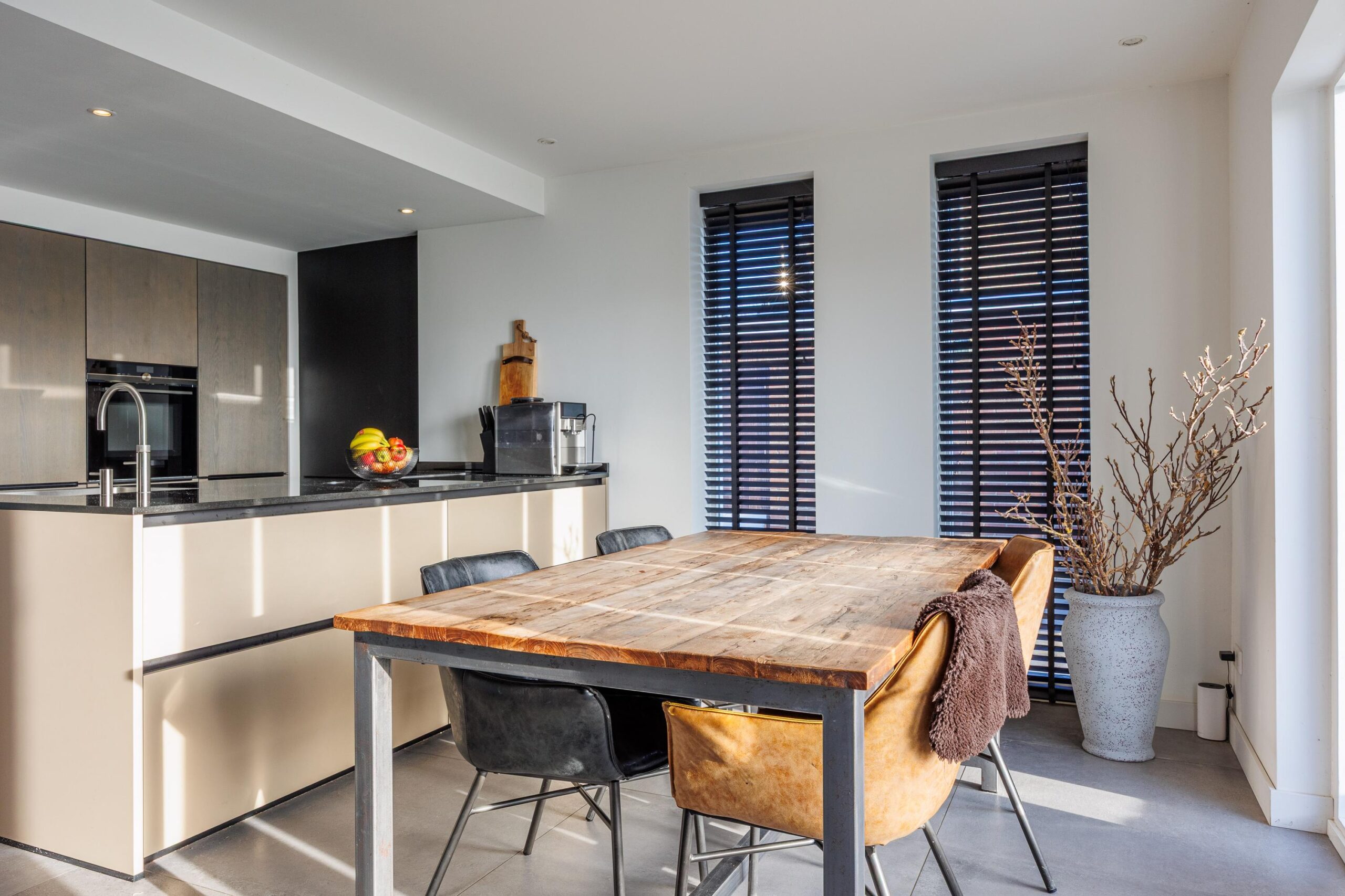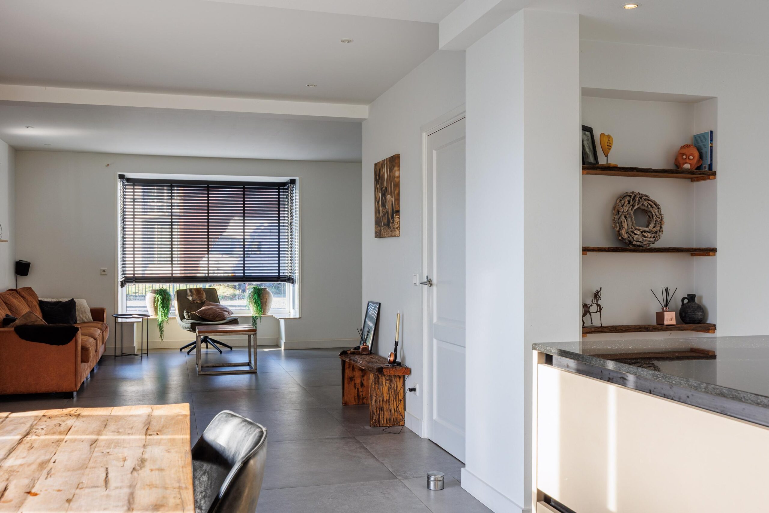 Begane grond: hal, meterkast en trapopgang, werkkamer, woonkamer met airco en een prachtige tegelvloer met vloerwarming, die doorloopt in de eetkamer (openslaande deuren naar de tuin), een luxe open keuken (2020) en een ruimte met witgoedaansluiting. In de hal bij de achterdeur is een mooi toilet gerealiseerd.