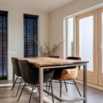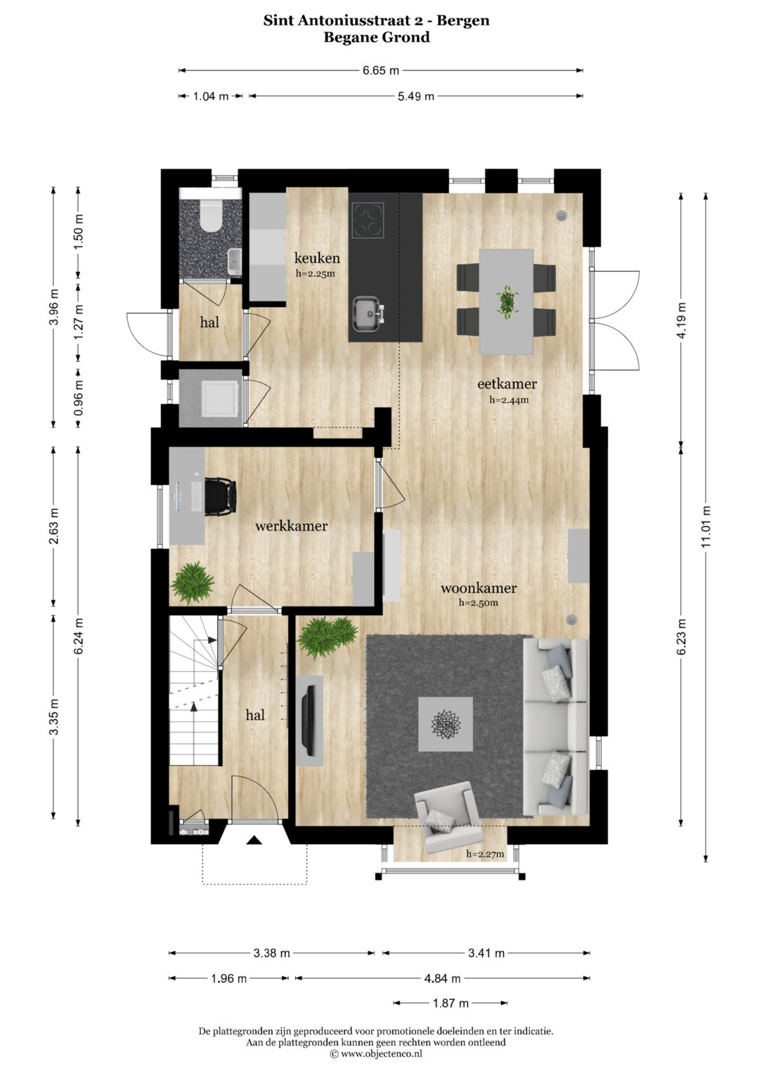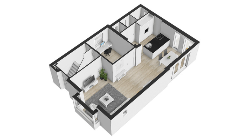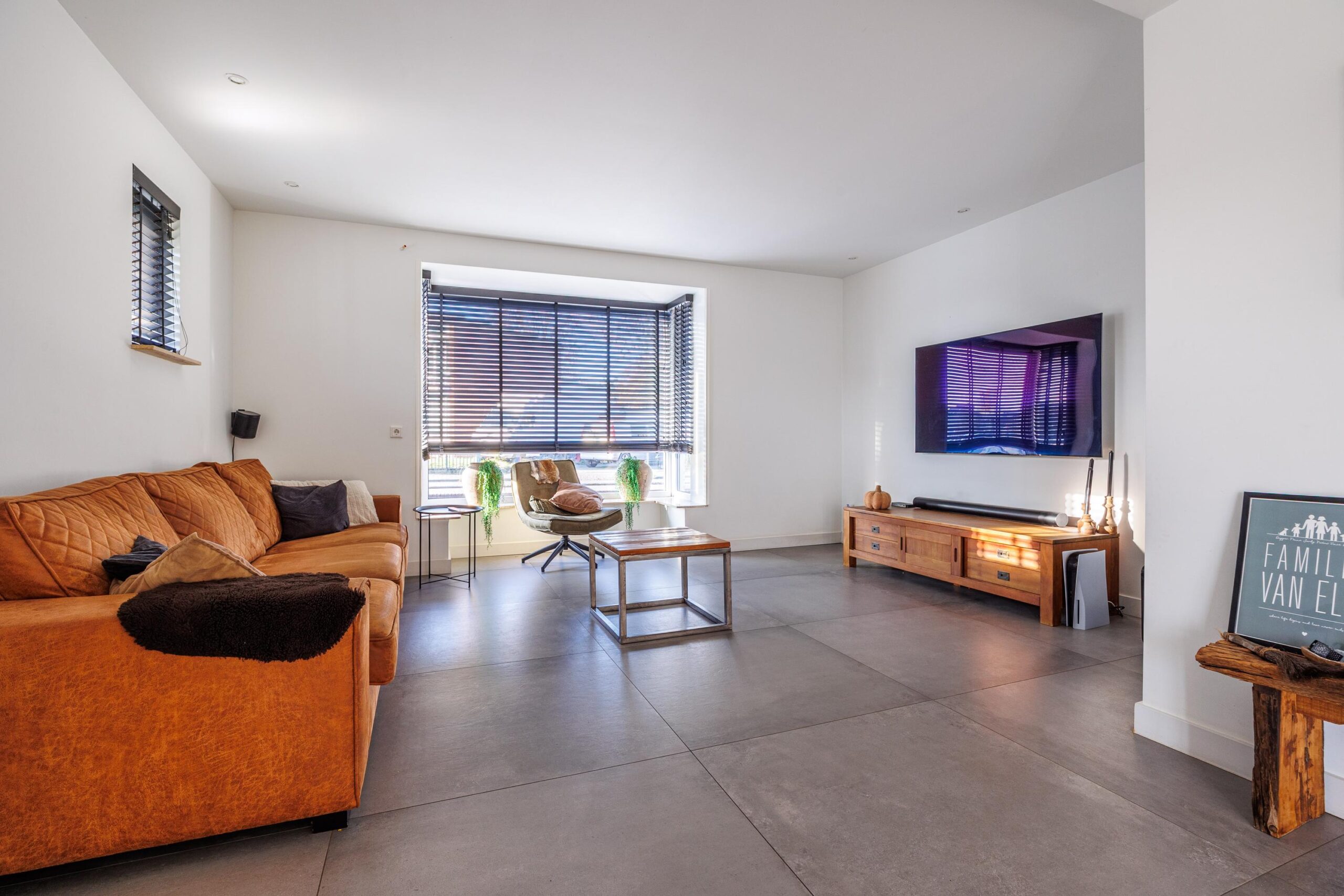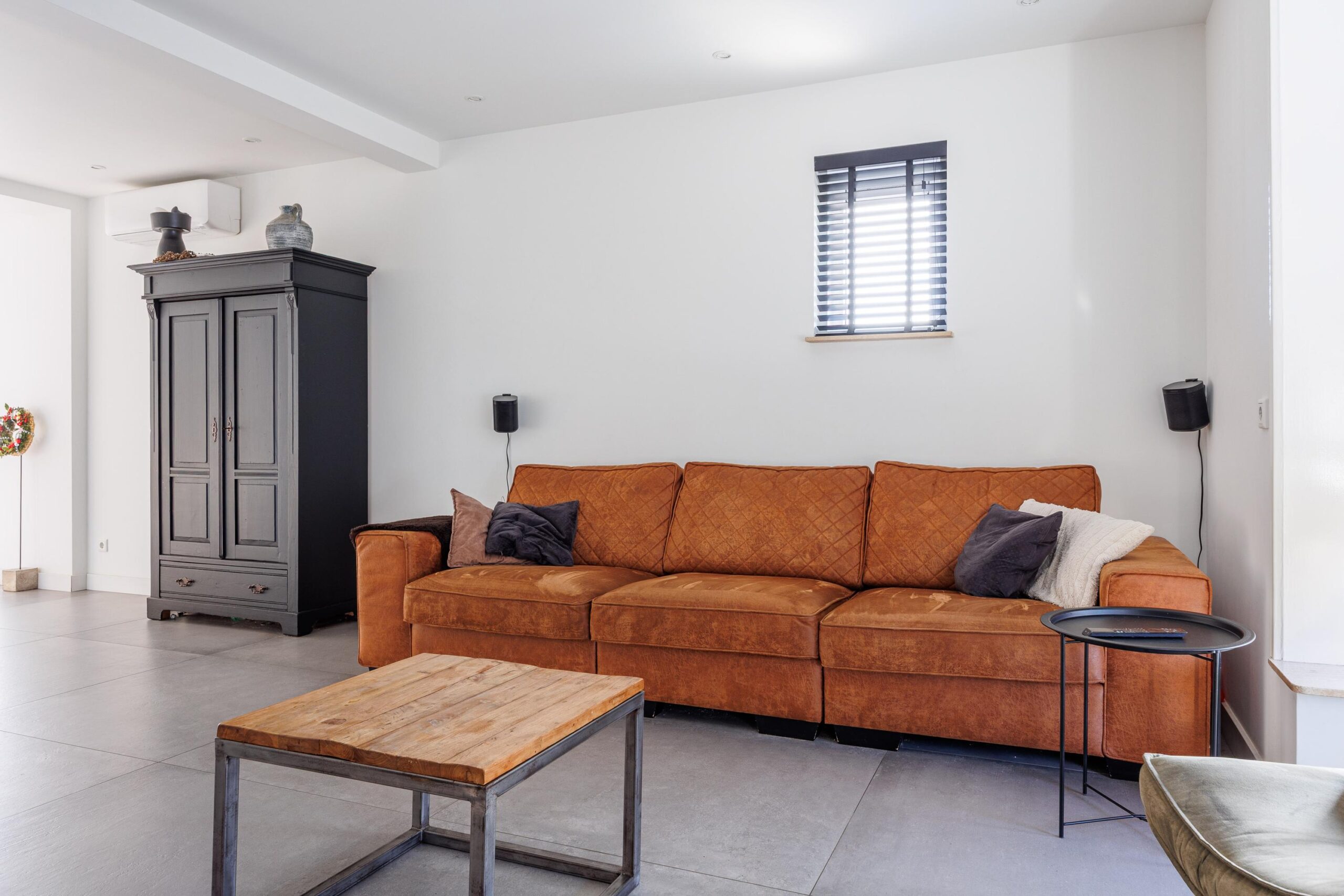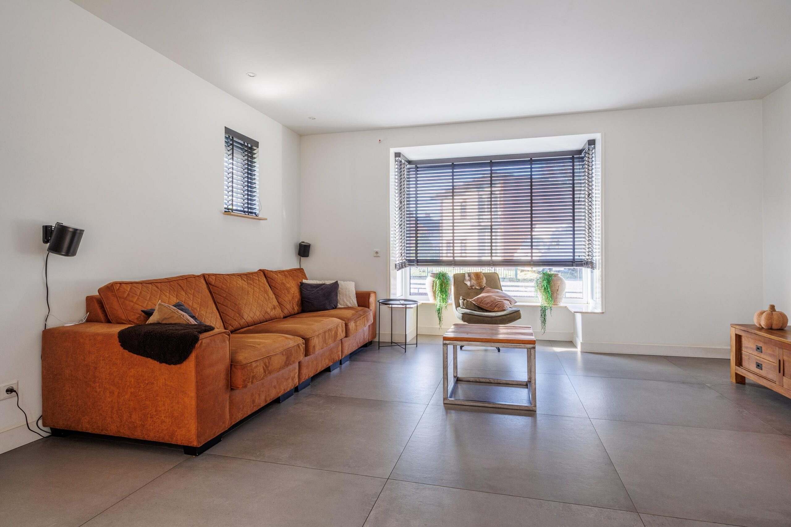 Begane grond: hal, meterkast en trapopgang, werkkamer, woonkamer met airco en een prachtige tegelvloer met vloerwarming, die doorloopt in de eetkamer (openslaande deuren naar de tuin), een luxe open keuken (2020) en een ruimte met witgoedaansluiting. In de hal bij de achterdeur is een mooi toilet gerealiseerd.