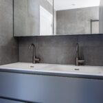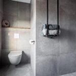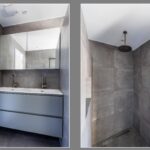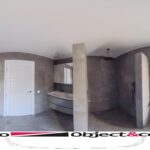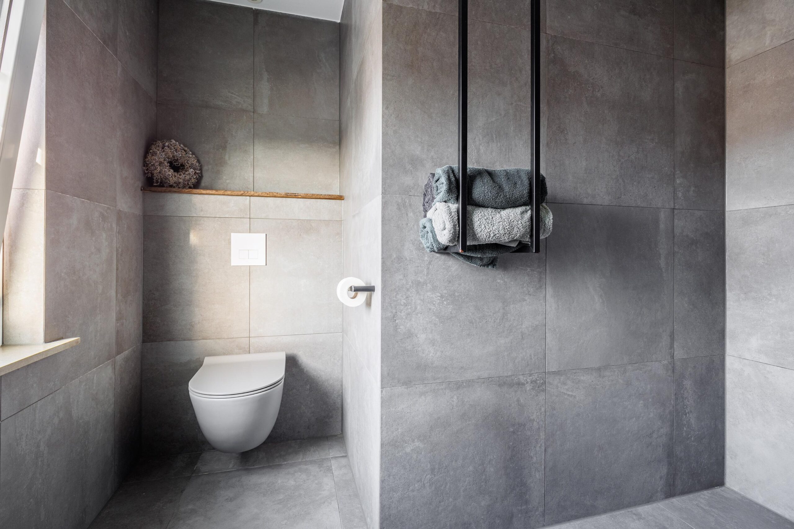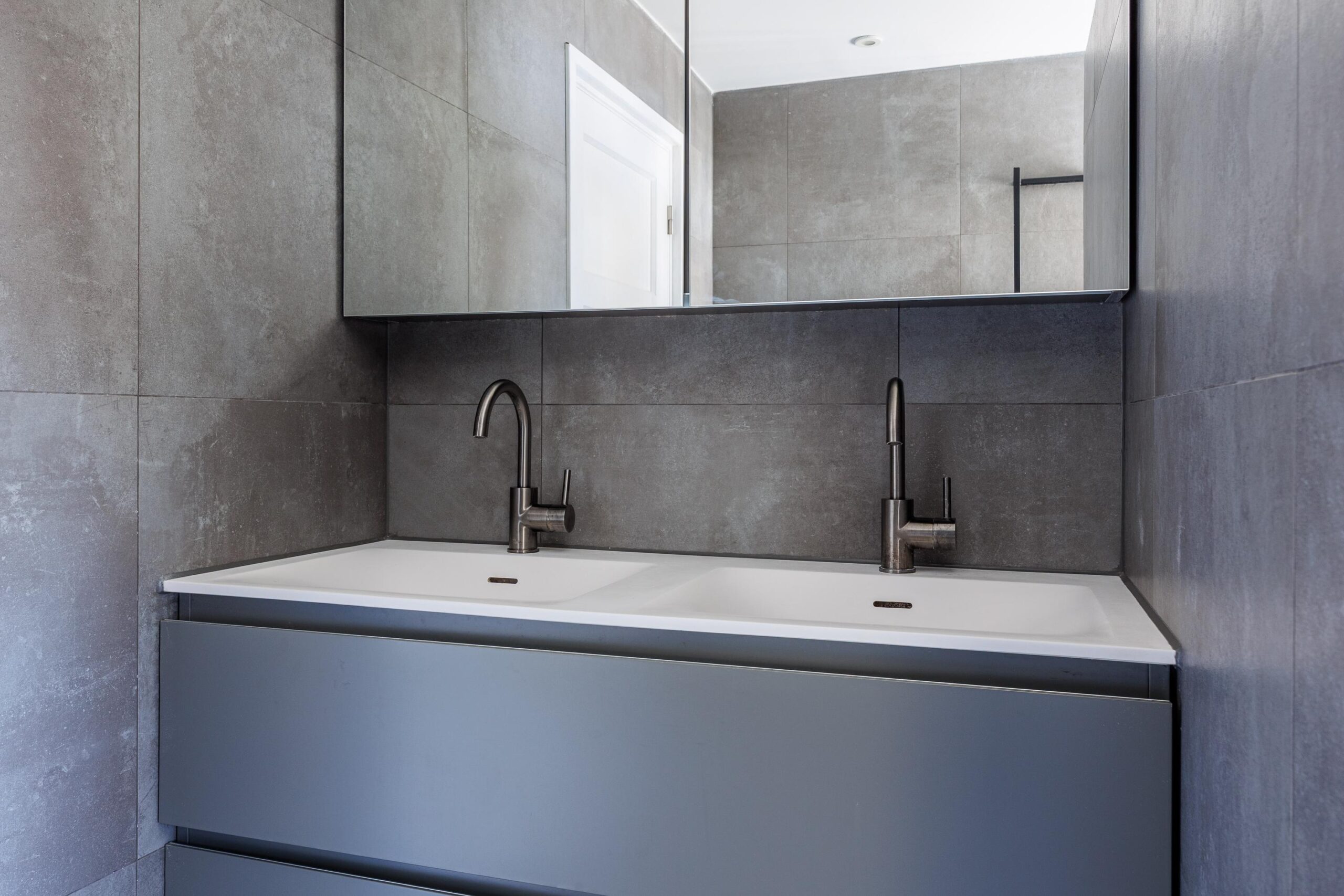 1e verdieping: overloop naar de drie slaapkamers (voorzien van zeer comfortabele en fraai ingebouwde plafondairco's) , een geheel betegelde moderne badkamer voorzien van vloerverwarming, een dubbele wastafel met meubel, hangend toilet en een inloopdouche.