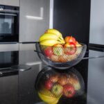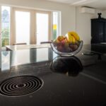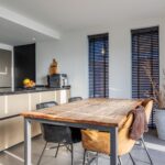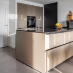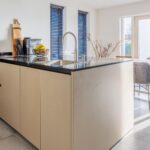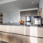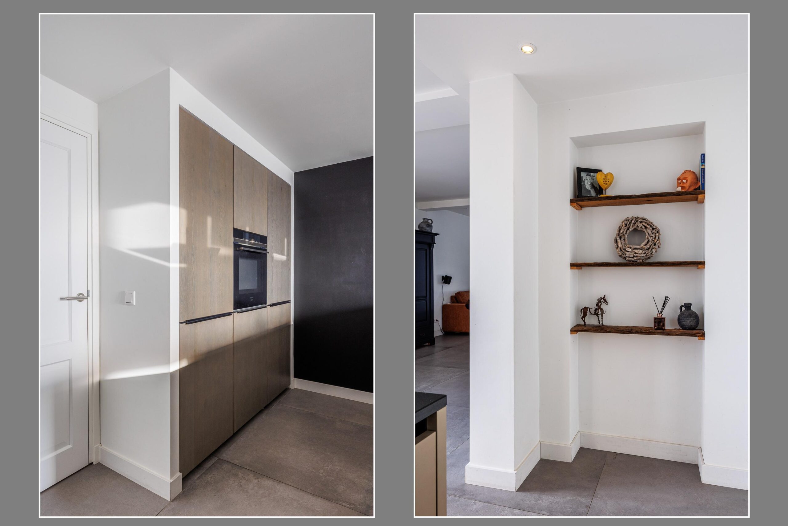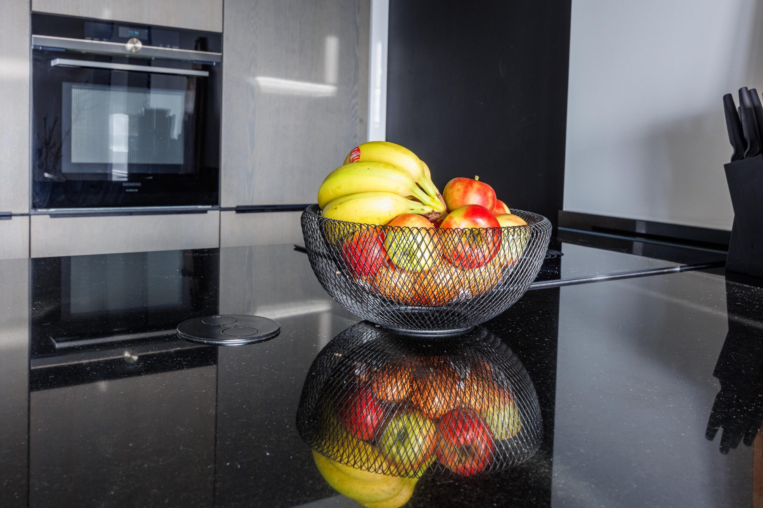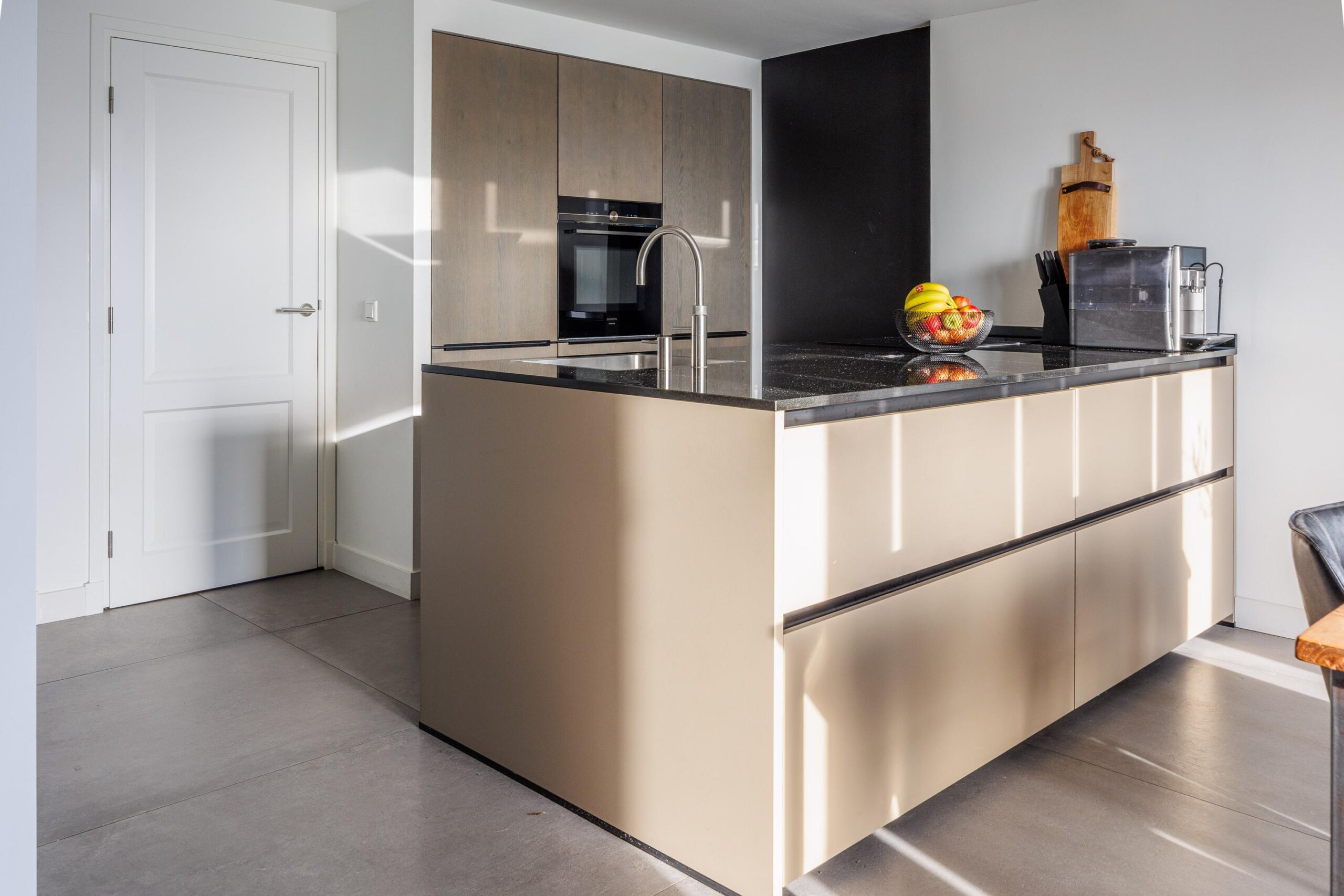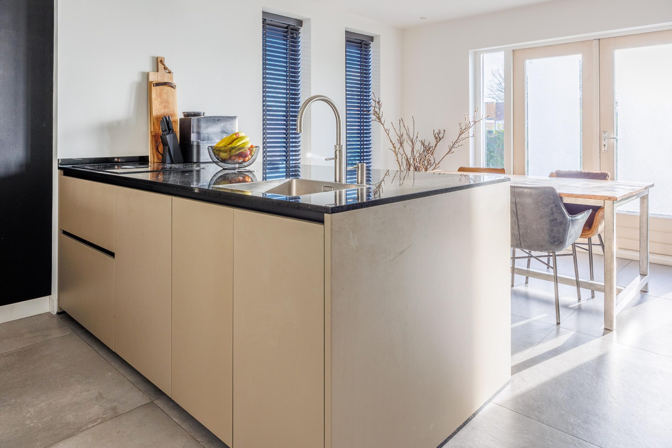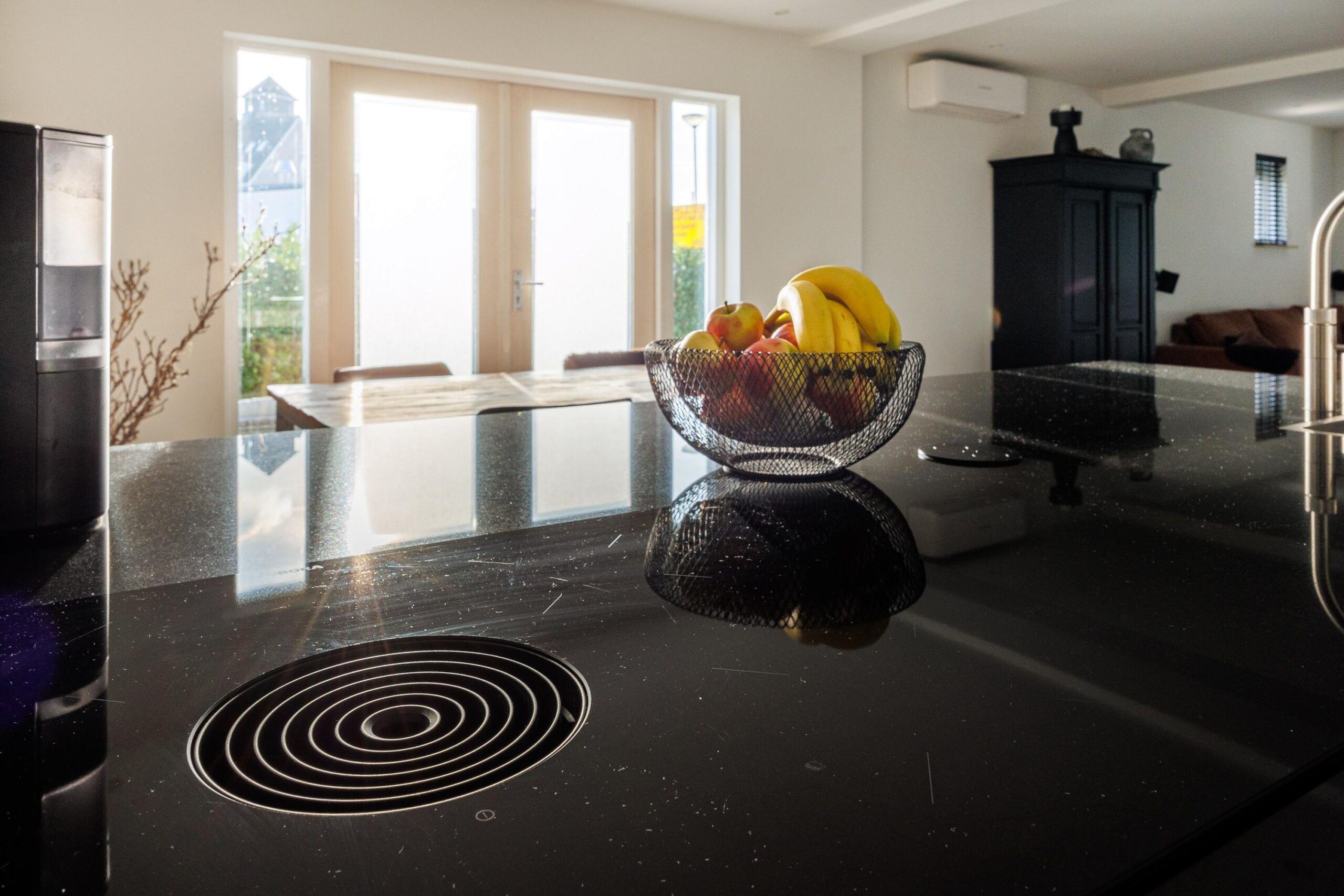 De keukenopstelling met een natuurstenen blad is voorzien van de volgende inbouwapparatuur: inductiekookplaat met downdraft systeem (BORA), vaatwasser, koelkast, vriezer, combi-oven en Quooker (functies: heet, koud en bubbels).