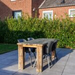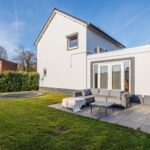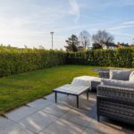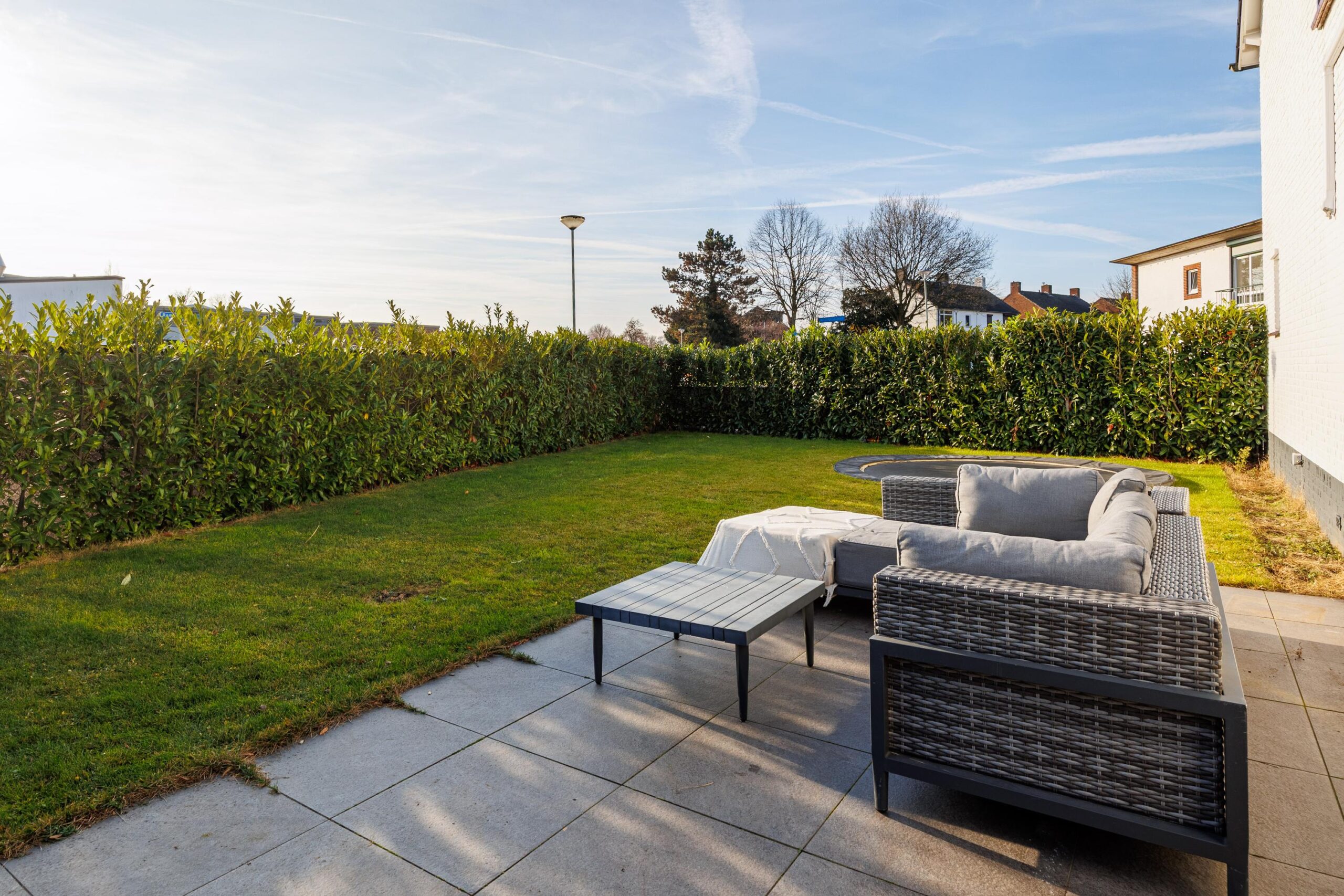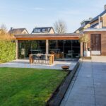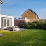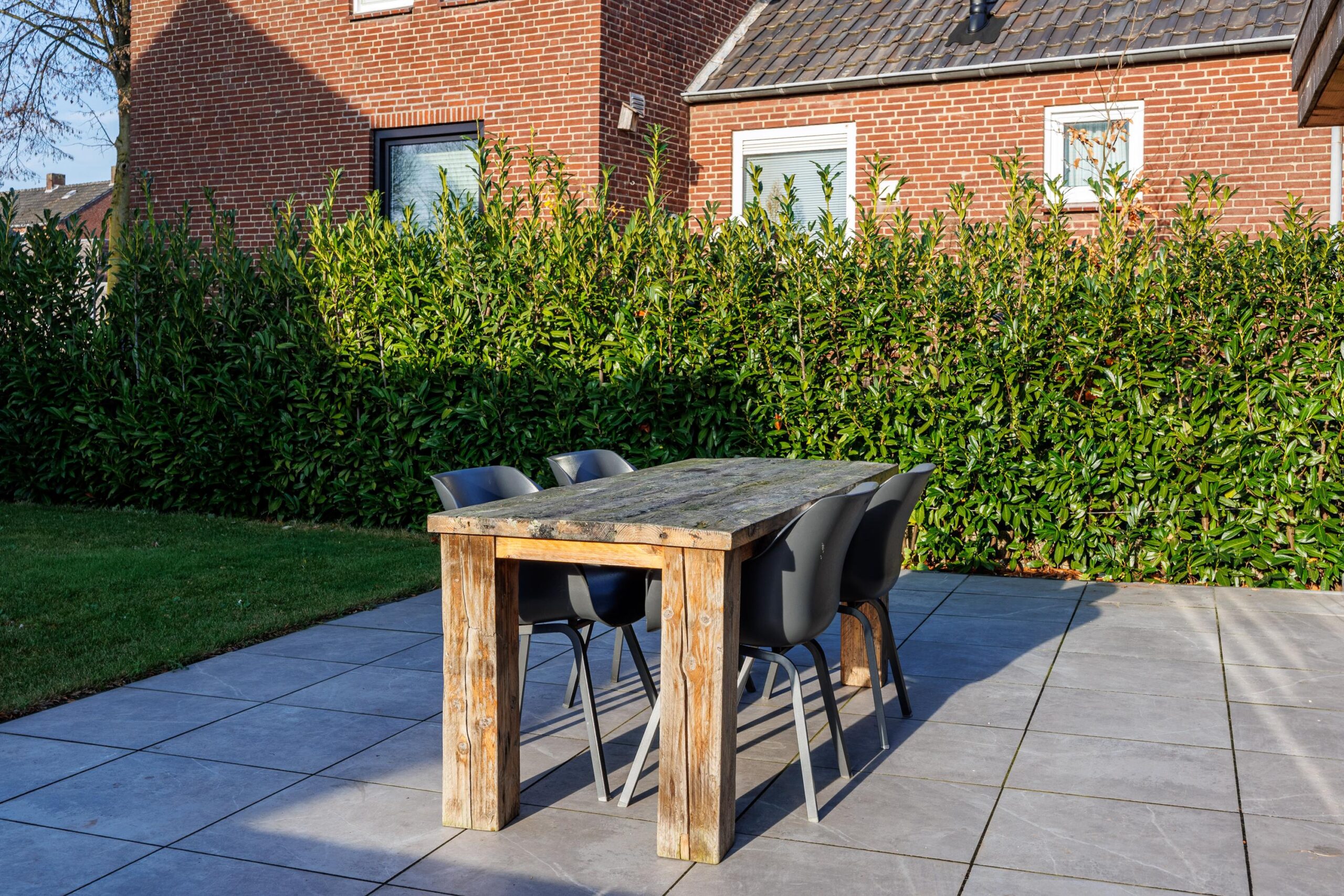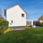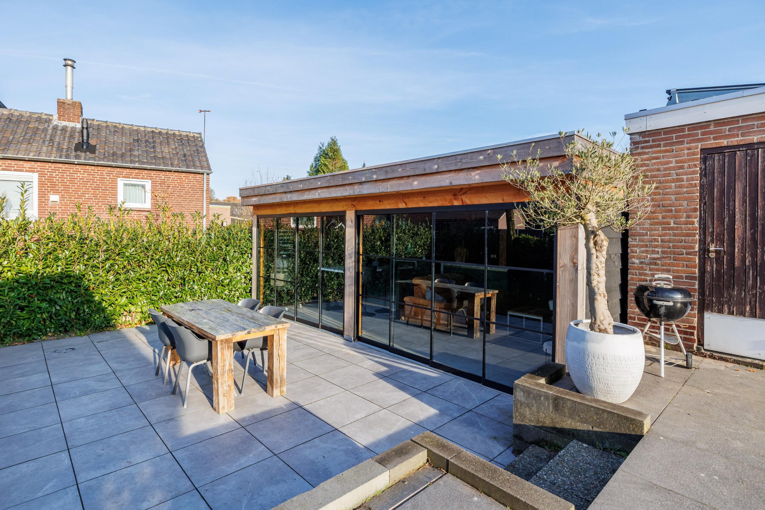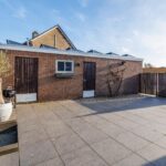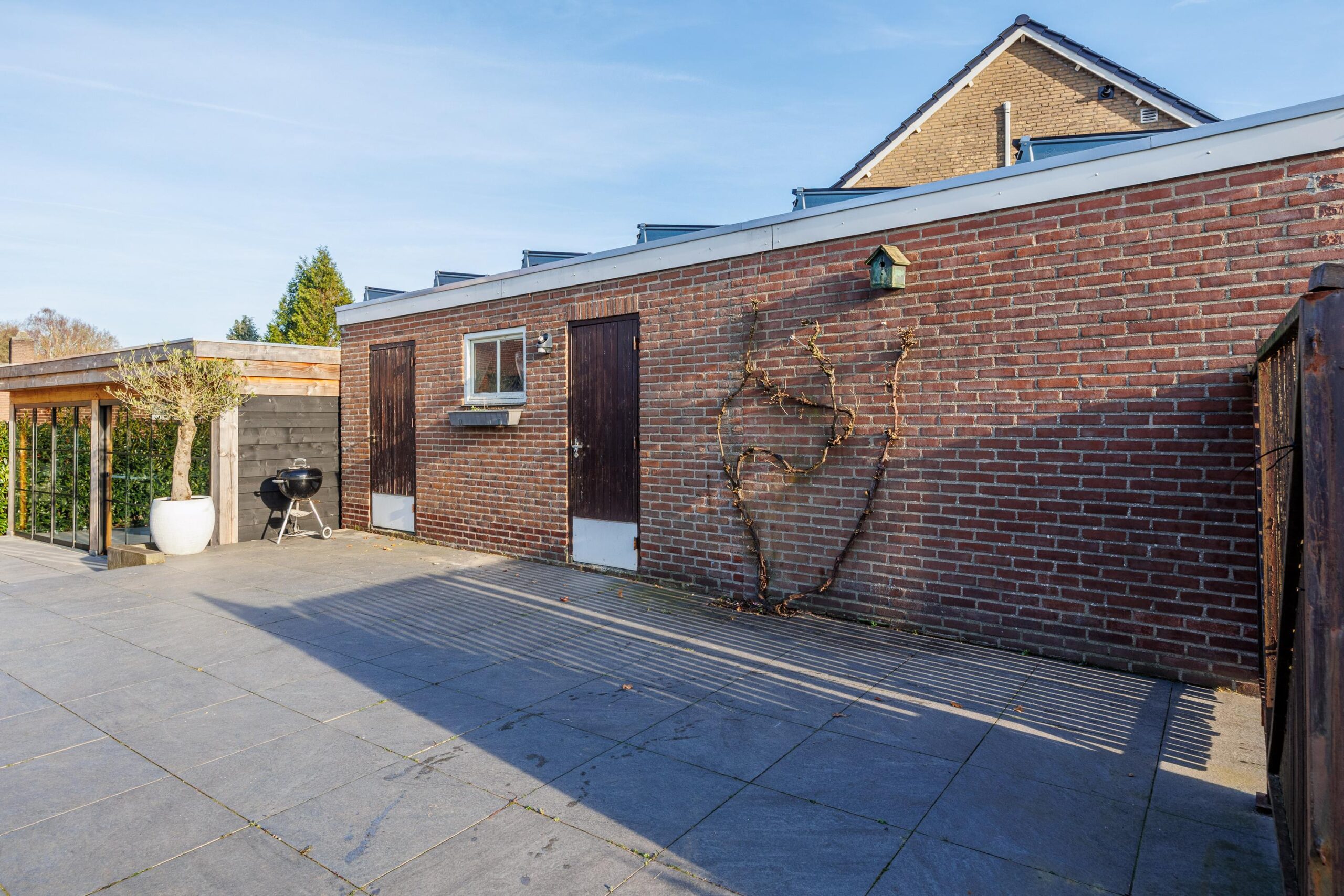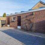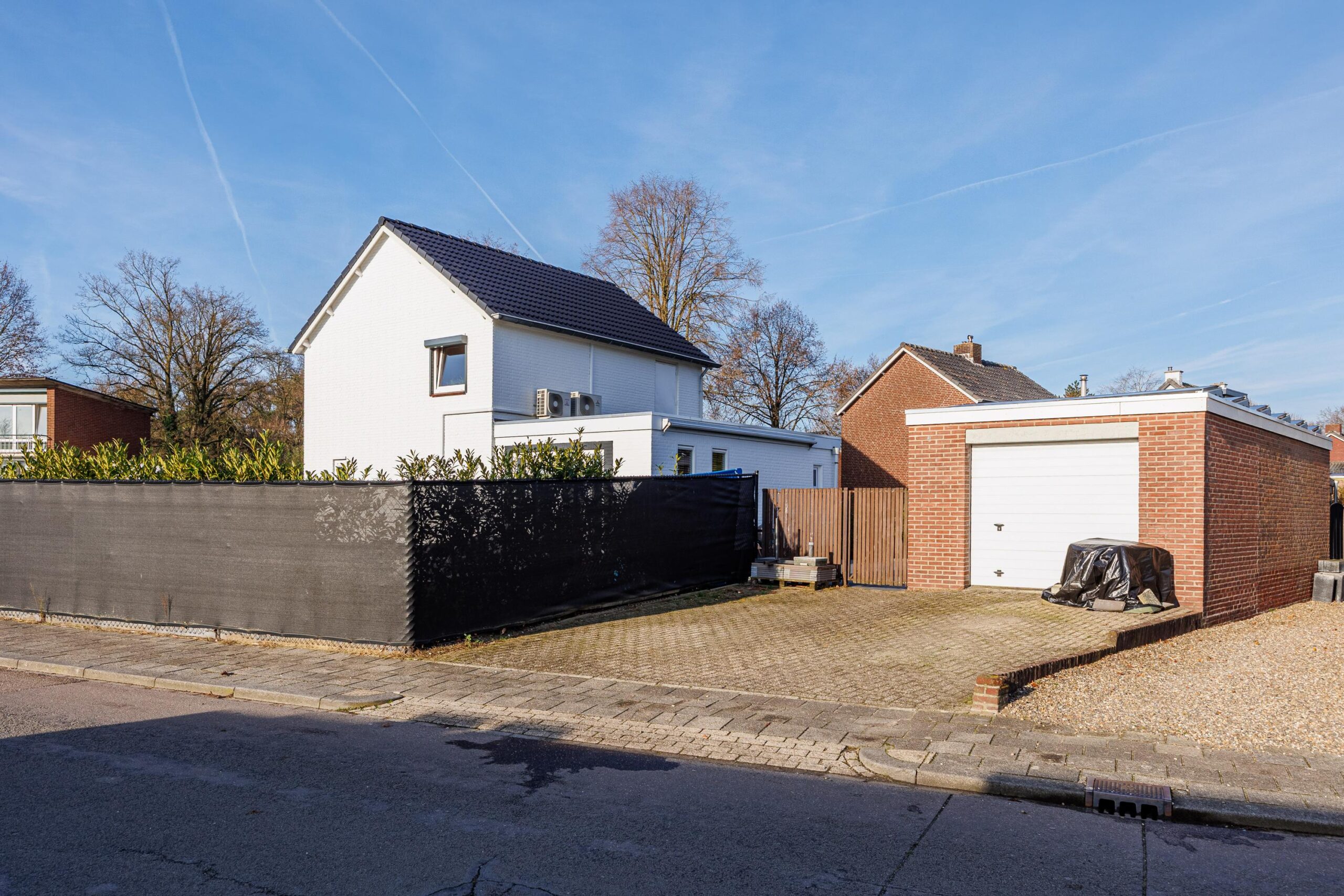 Exterieur: oprit voor twee auto's, fraaie tuin met prachtig nieuw buitenverblijf en een separate garage (niet gerenoveerd) met elektrische sectionaldeur.
