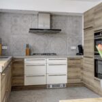 Modern ingerichte keuken die is voorzien van een vaatwasser, combioven, heteluchtoven, 5-pits gaskookplaat, afzuigkap en koel-/ vriescombinatie.