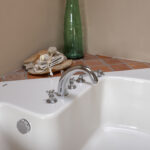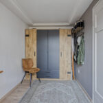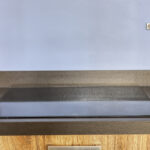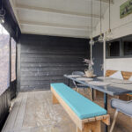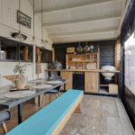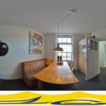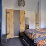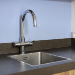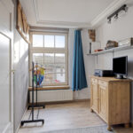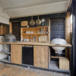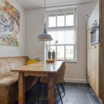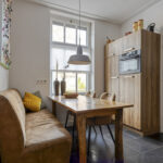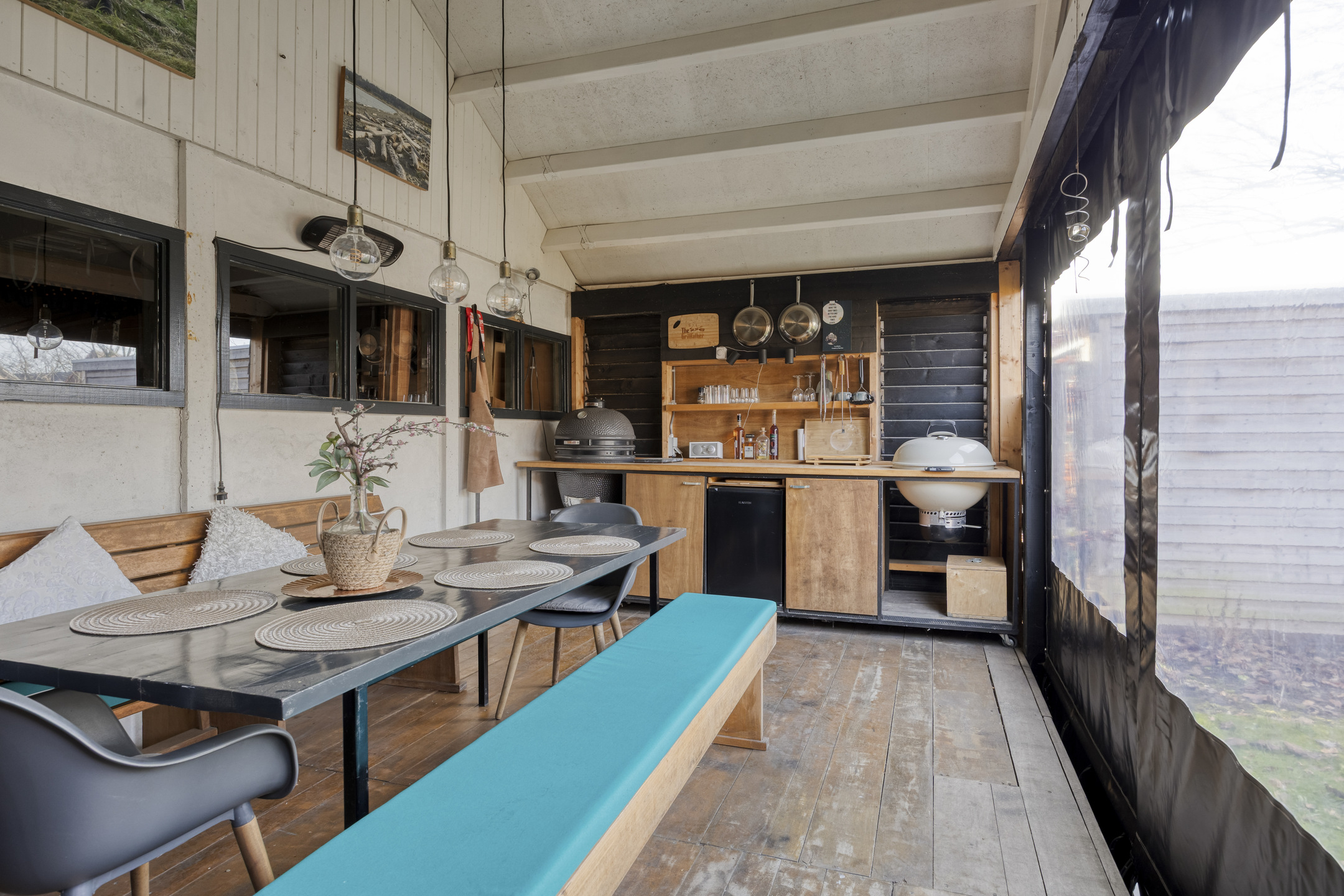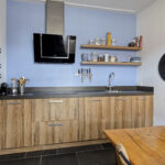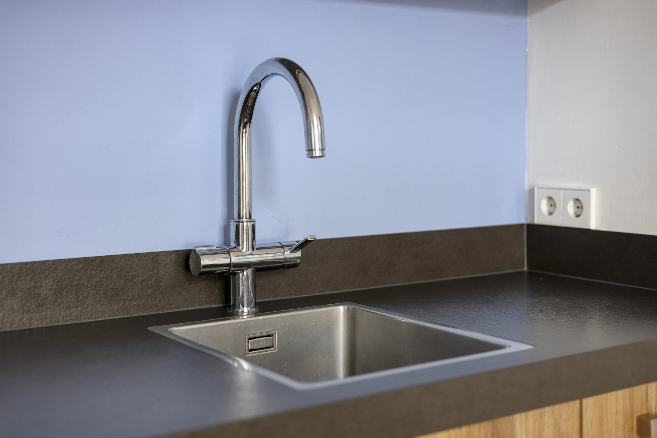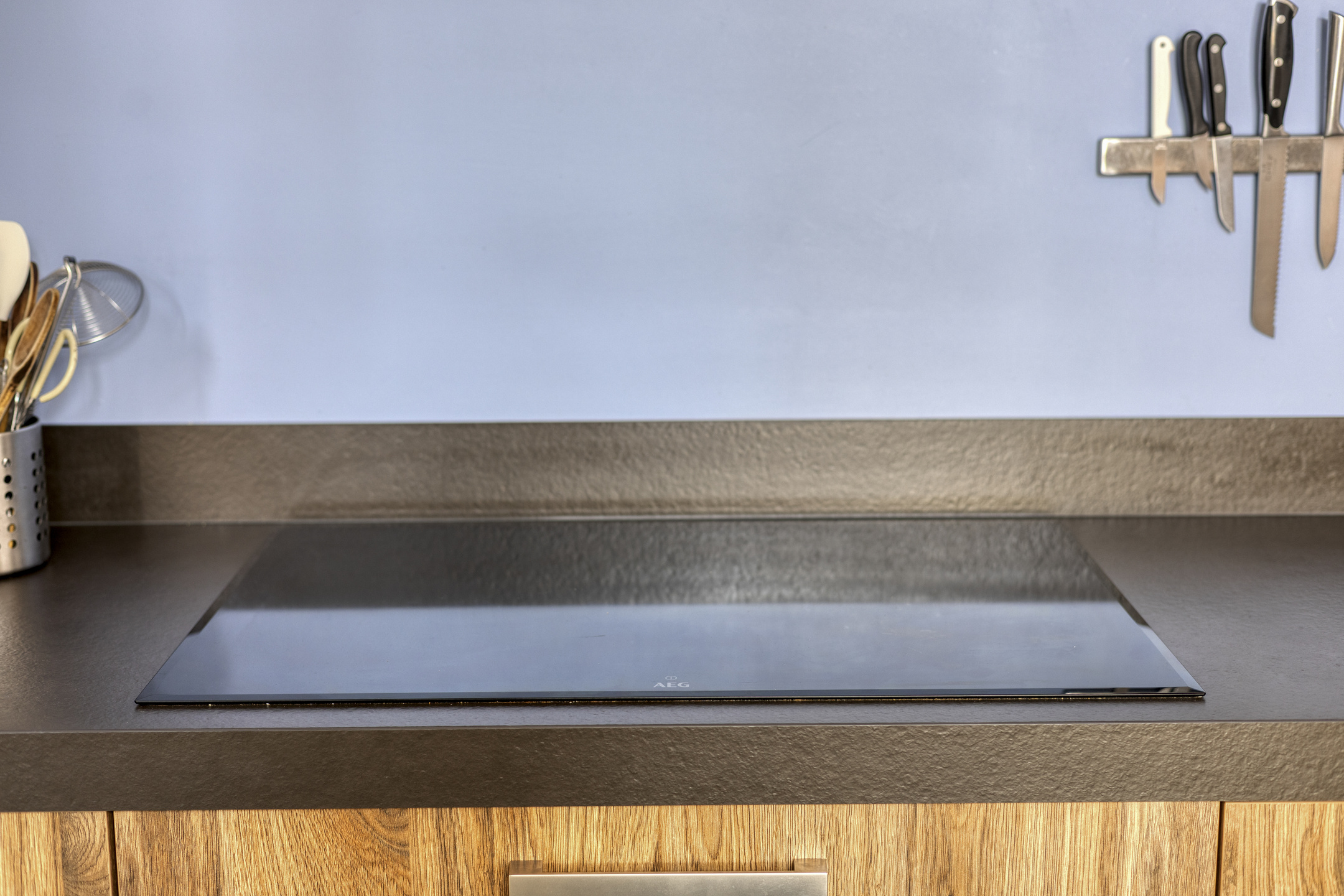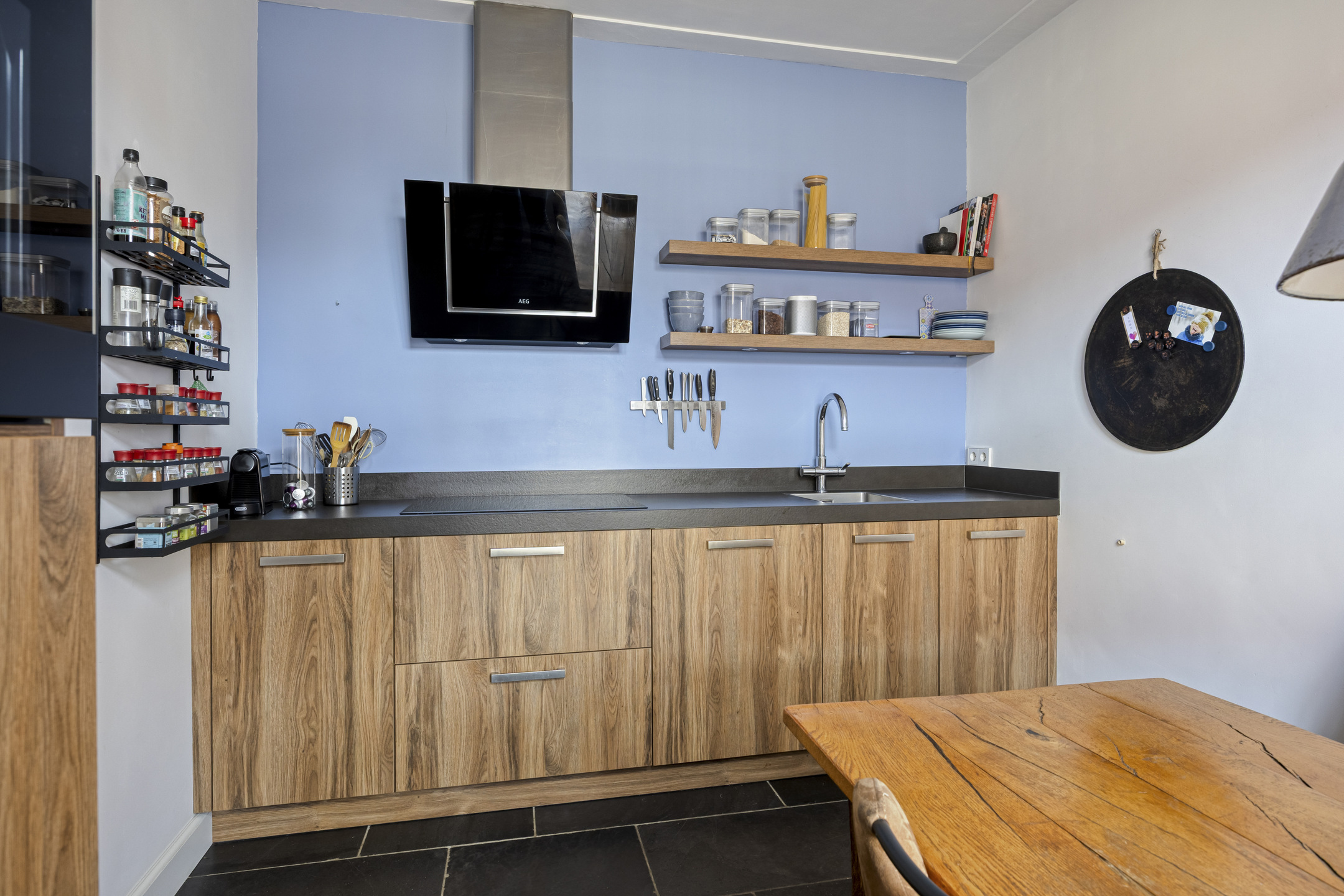 De keukenopstelling is voorzien van een inductiekookplaat met afzuigkap, koel-/ vriescombinatie, combimagnetron en een heet-waterkraan.