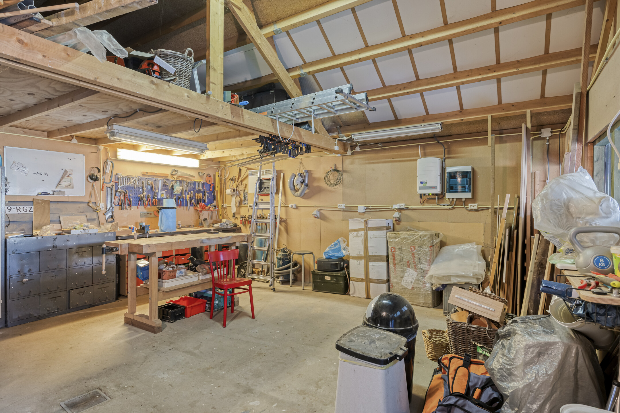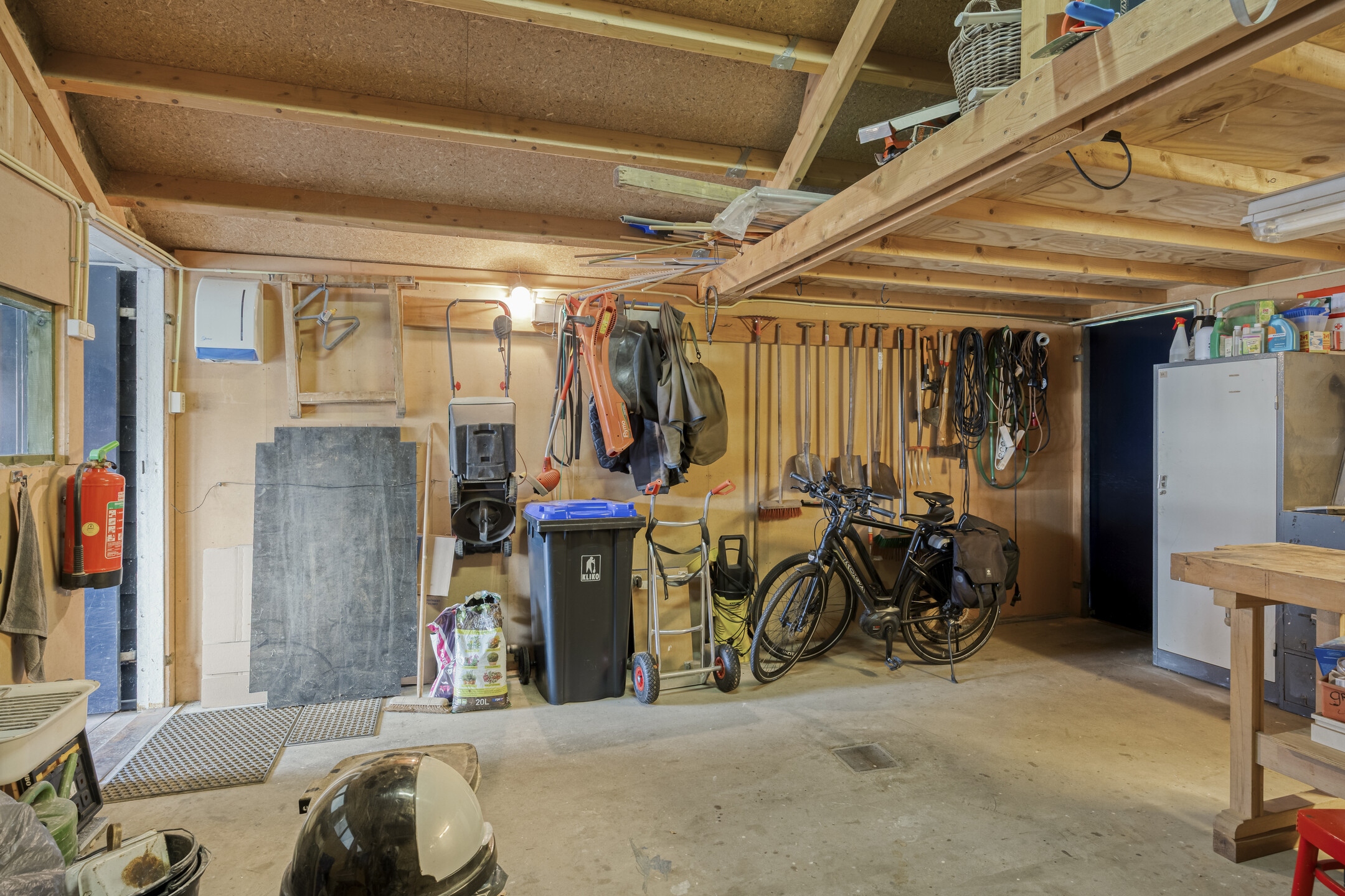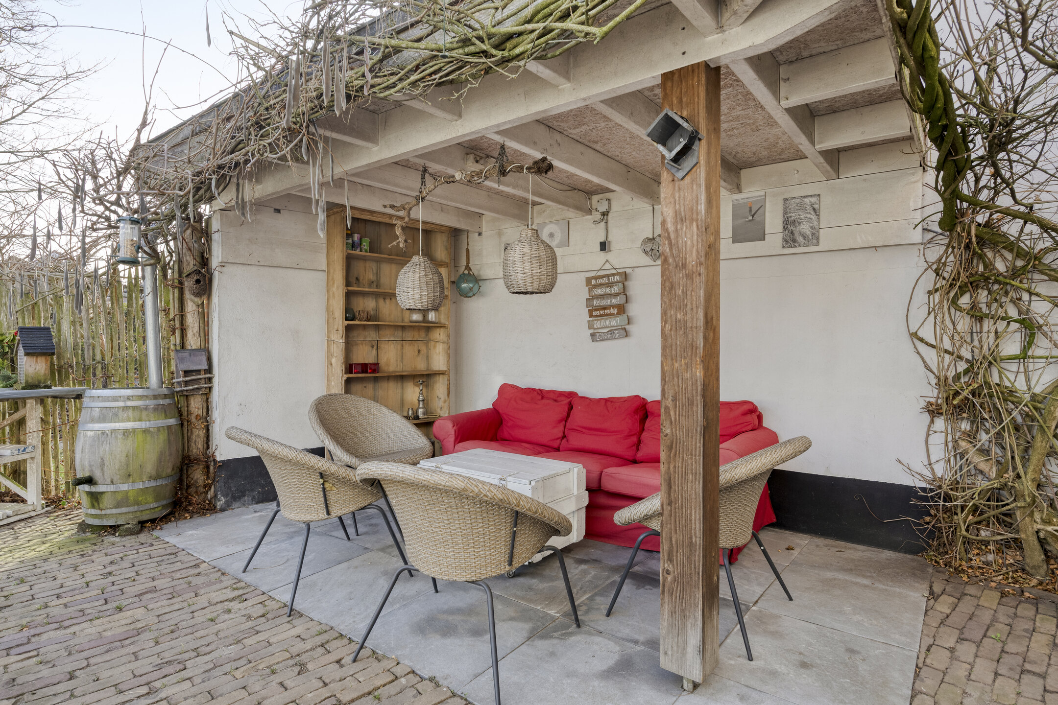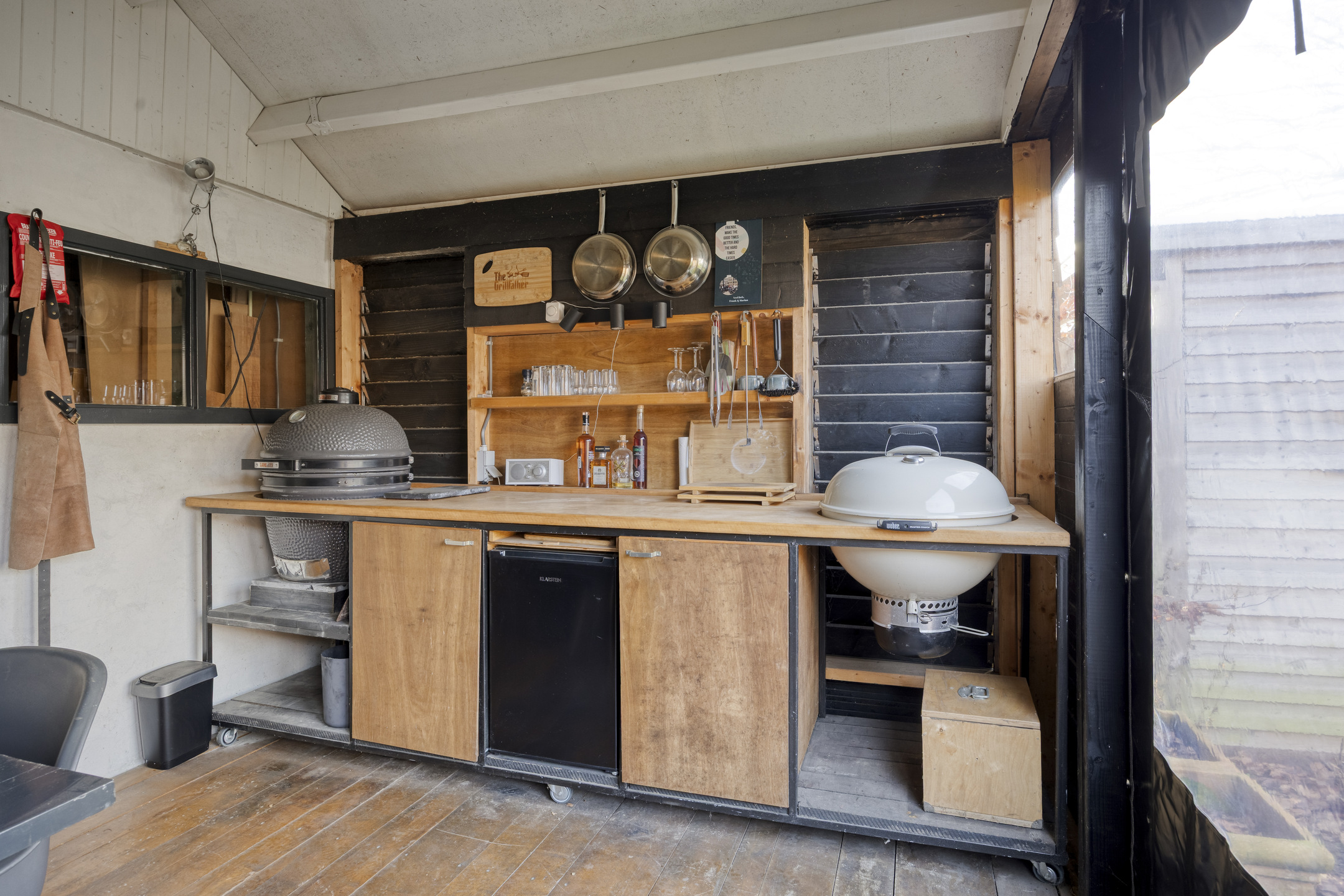 De diepe, zonnige tuin op het zuiden heeft een tweetal fraaie overkappingen. Hier kan je bijvoorbeeld heerlijk barbecueën in de zomer. Achterin de tuin is een grote hobbyschuur aanwezig met achterom.