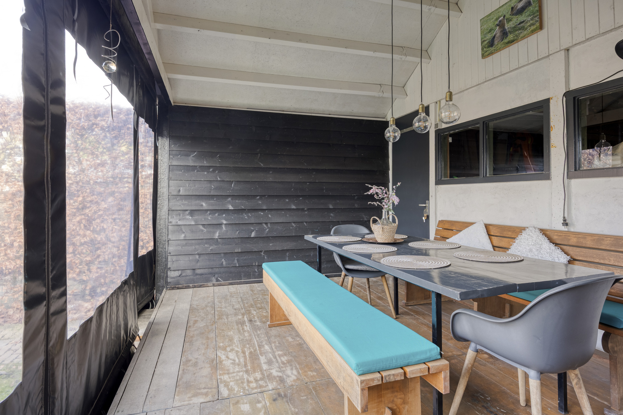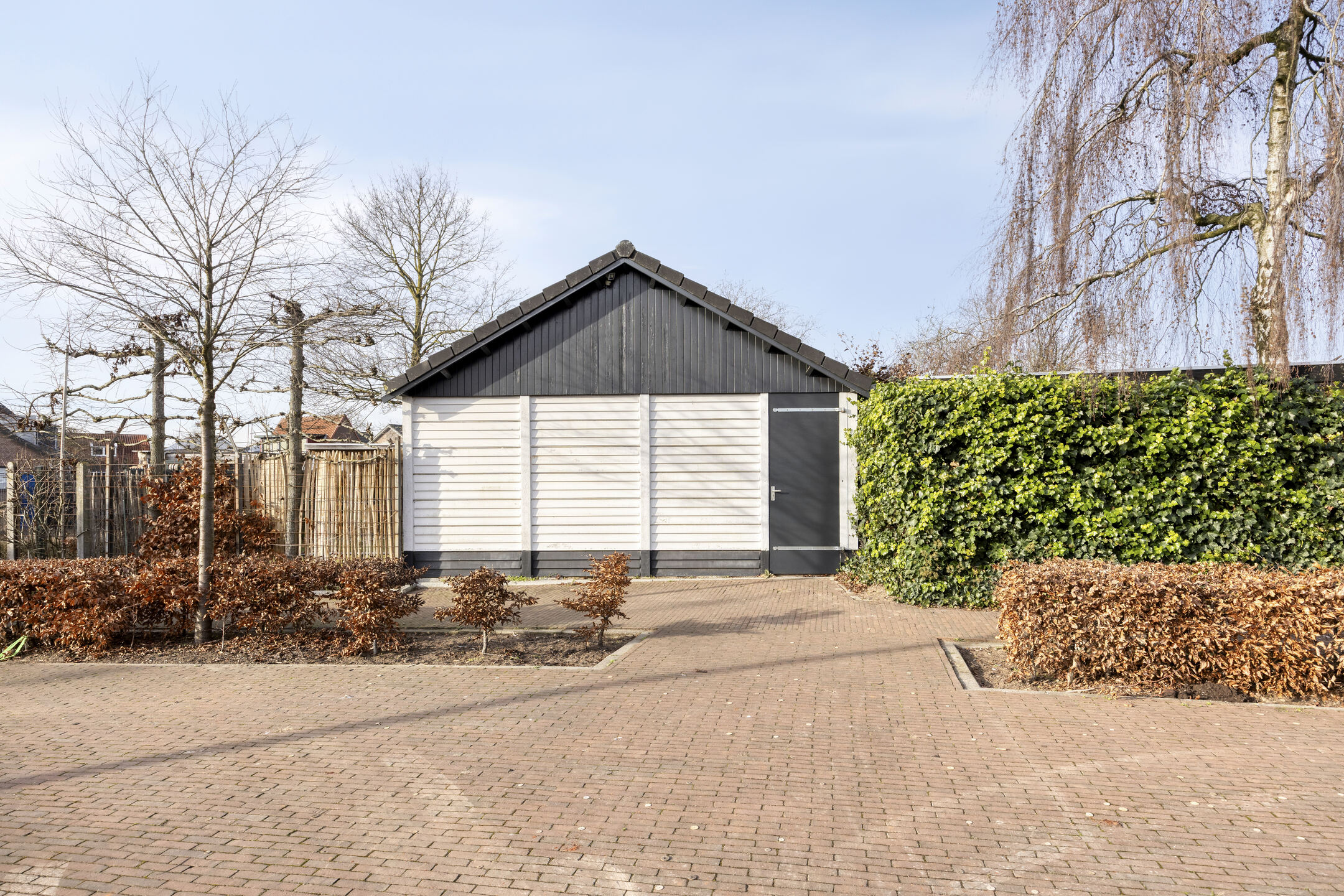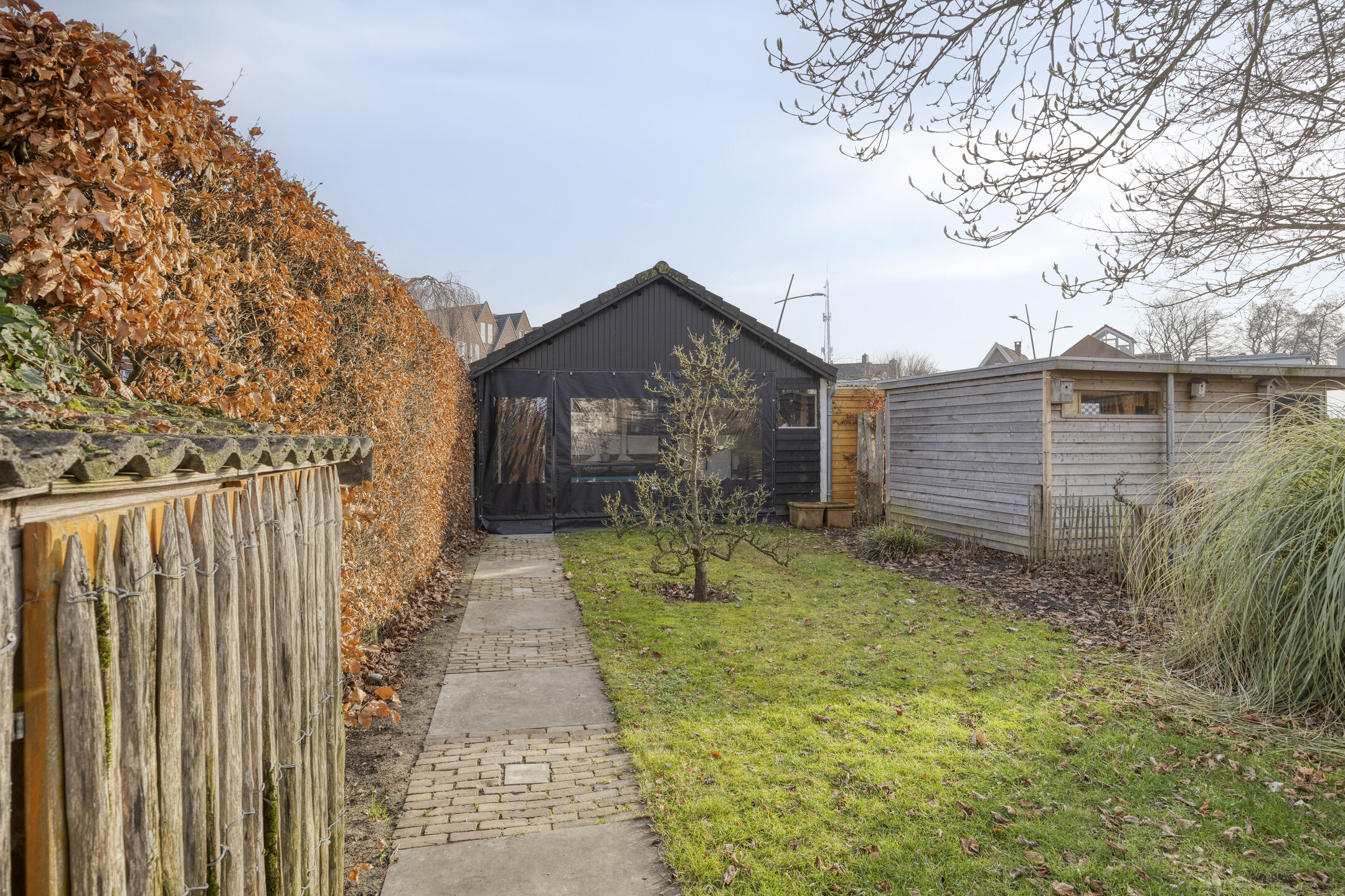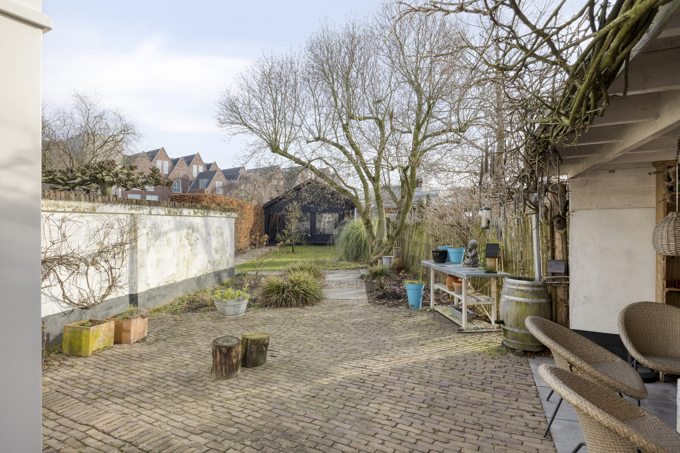 De diepe, zonnige tuin op het zuiden heeft een tweetal fraaie overkappingen. Hier kan je bijvoorbeeld heerlijk barbecueën in de zomer. Achterin de tuin is een grote hobbyschuur aanwezig met achterom.