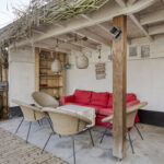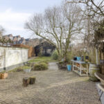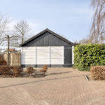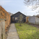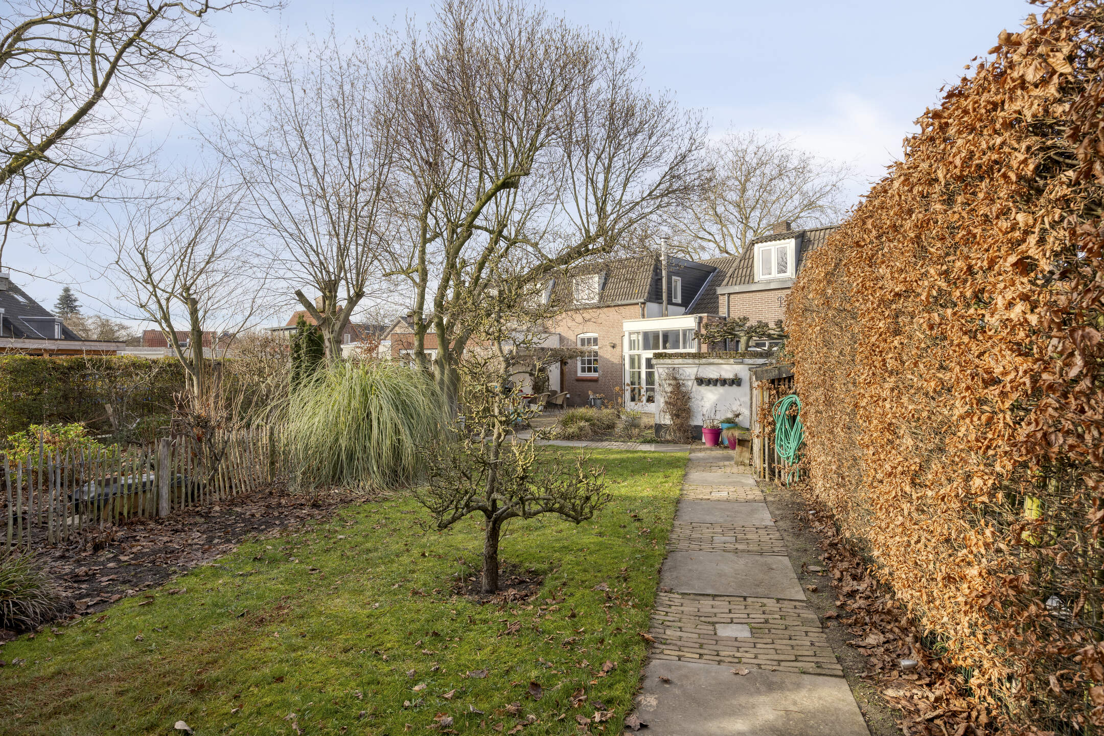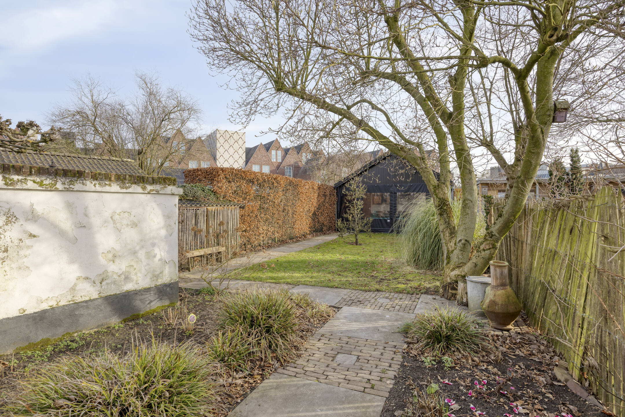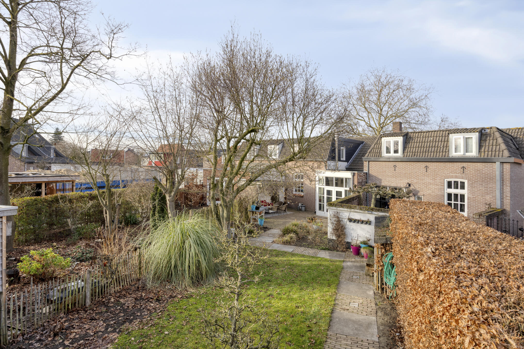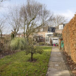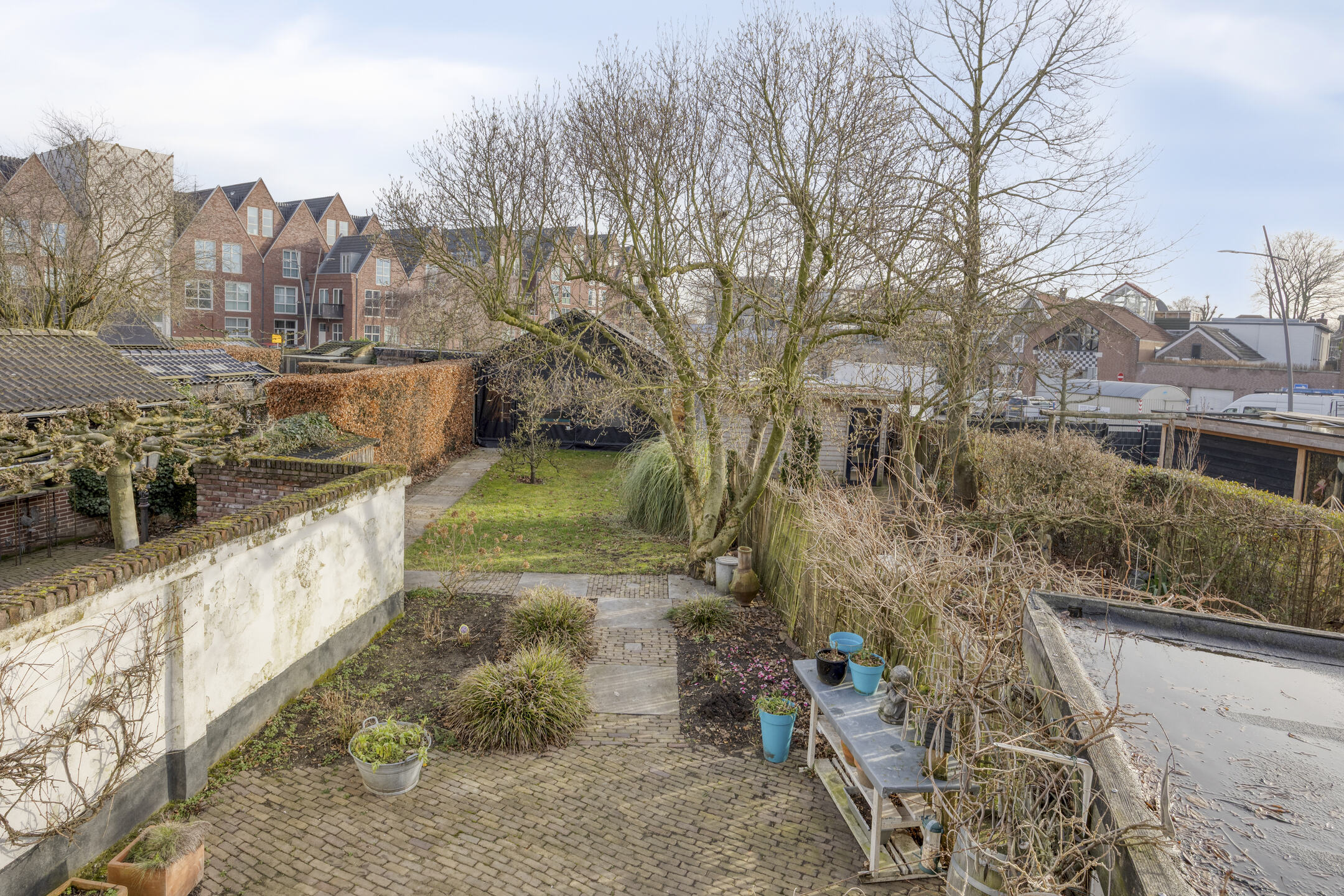 De diepe, zonnige tuin op het zuiden heeft een tweetal fraaie overkappingen. Hier kan je bijvoorbeeld heerlijk barbecueën in de zomer. Achterin de tuin is een grote hobbyschuur aanwezig met achterom.