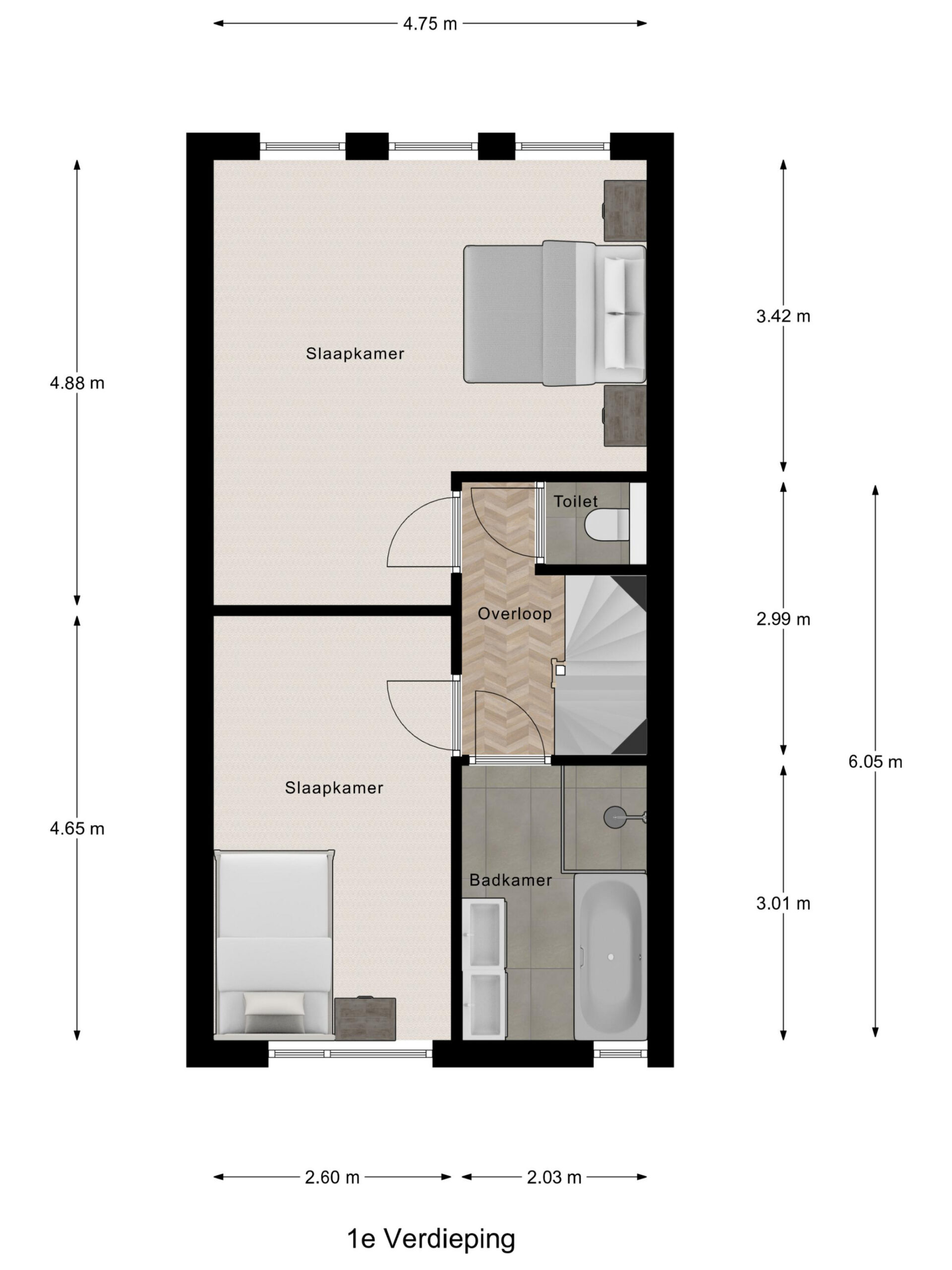 1e verdieping: overloop, 2 slaapkamers (3e slaapkamer mogelijk) waarvan de ouderslaapkamer is voorzien van een airco , een separate toiletruimte en badkamer voorzien van een douchecabine, ligbad en dubbele wastafel.