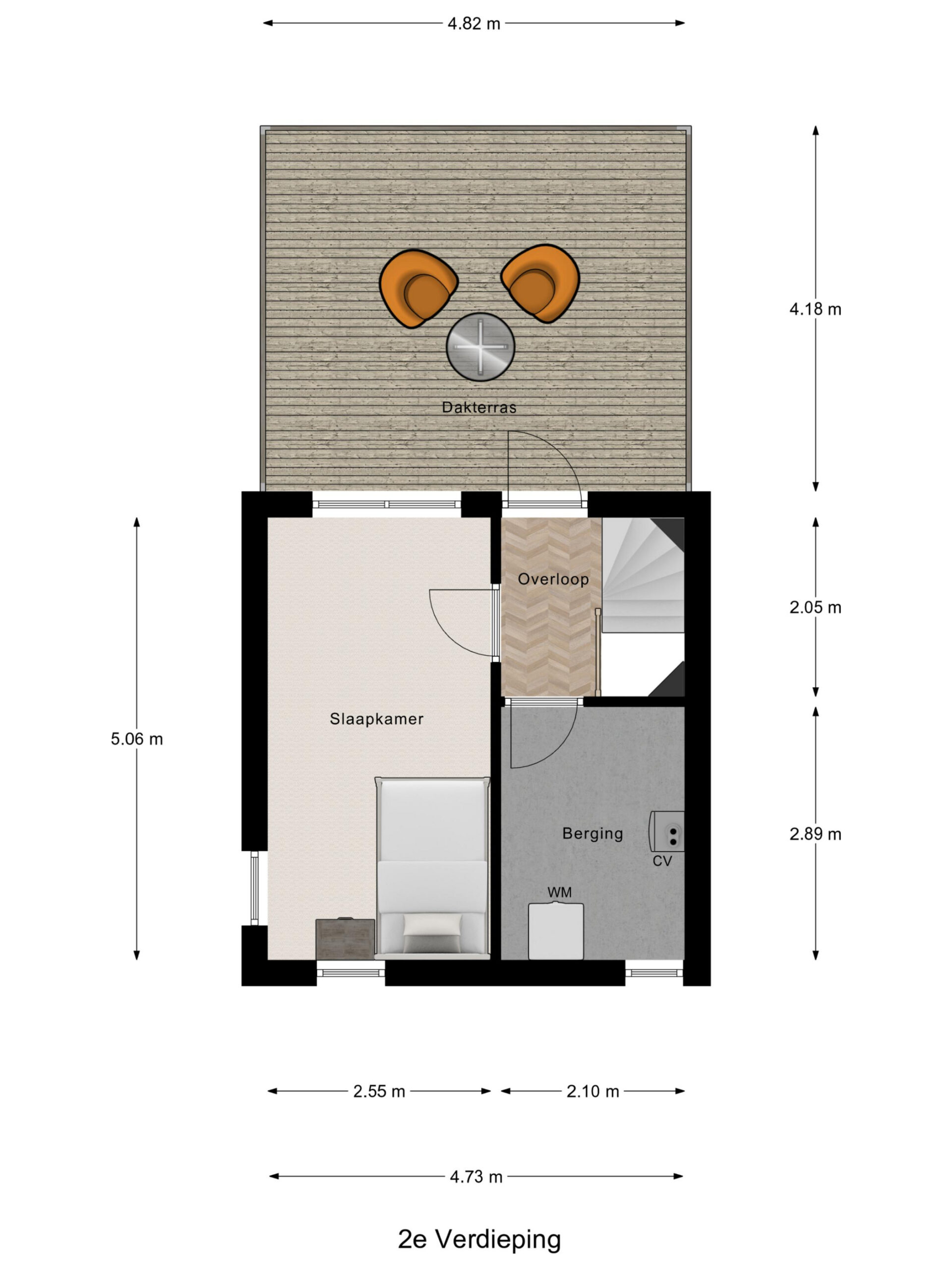 2e verdieping: voorzolder met aparte cv-/ wasruimte met de opstelling van de cv-ketel en warmtepomp boiler ten behoeve van het warme water, ventilatie-unit en de wasapparatuur, 3e slaapkamer en een riant dakterras van 20 m² met een mooi uitzicht aan de achterzijde.