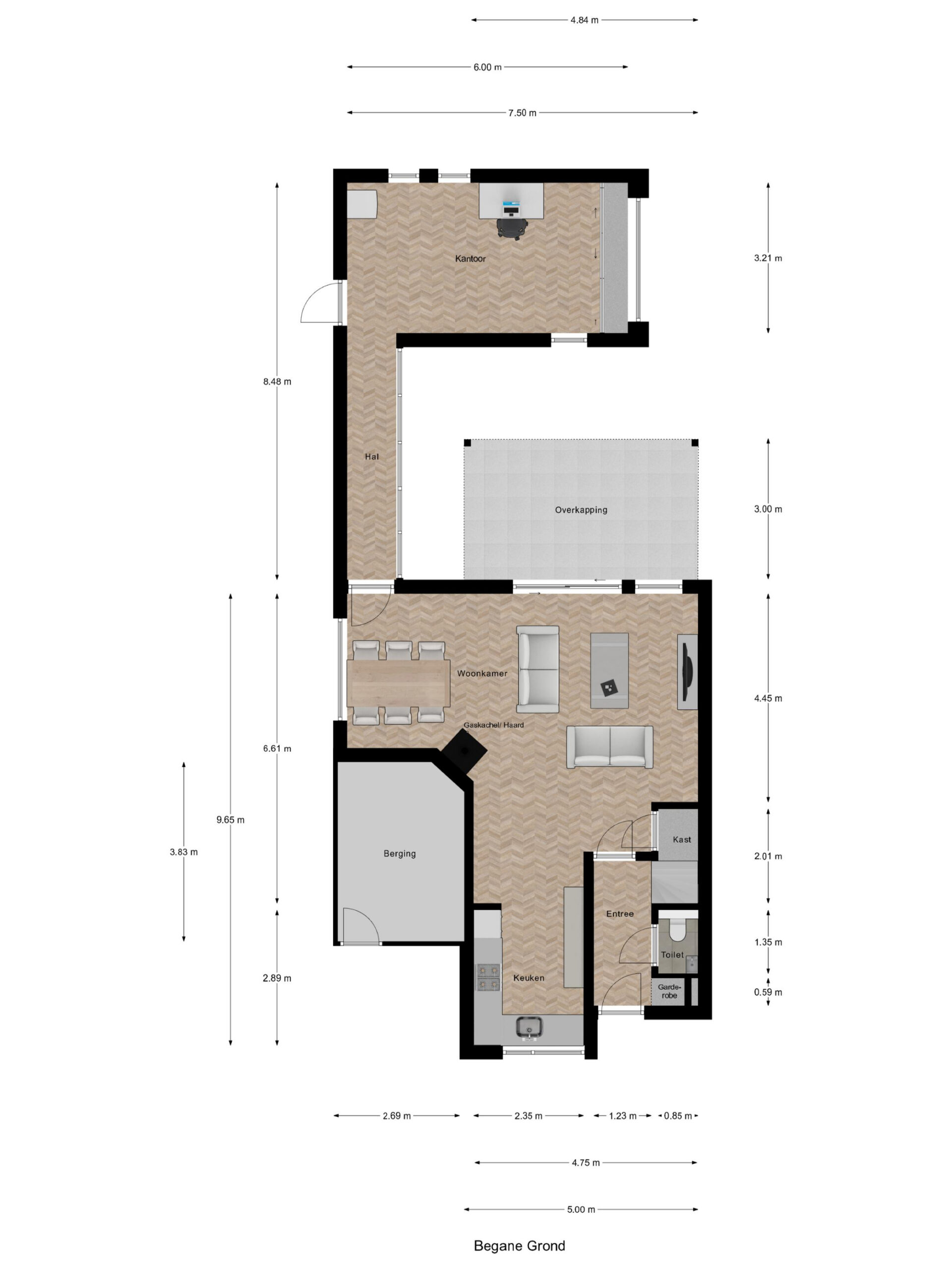 Begane grond: hal met meterkast en toilet. Een ruim bemeten L-vormige woonkamer…
