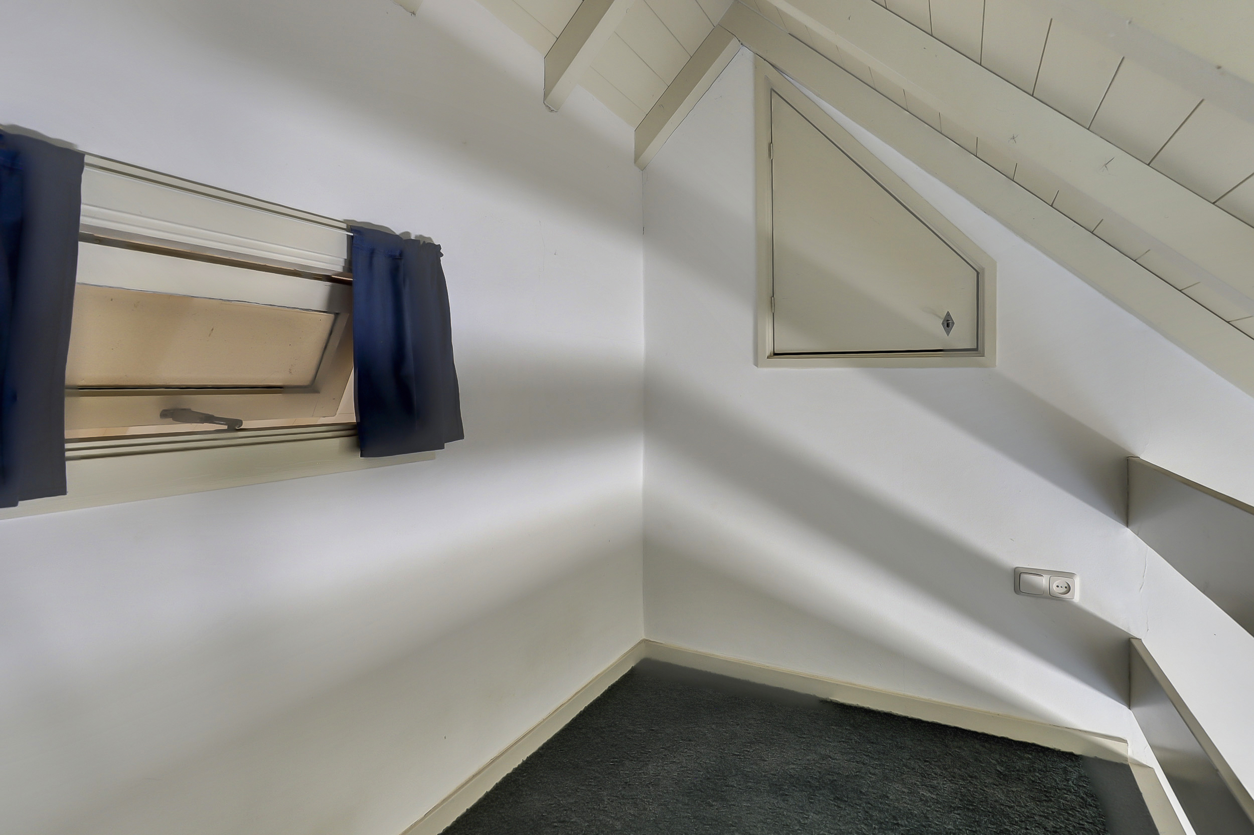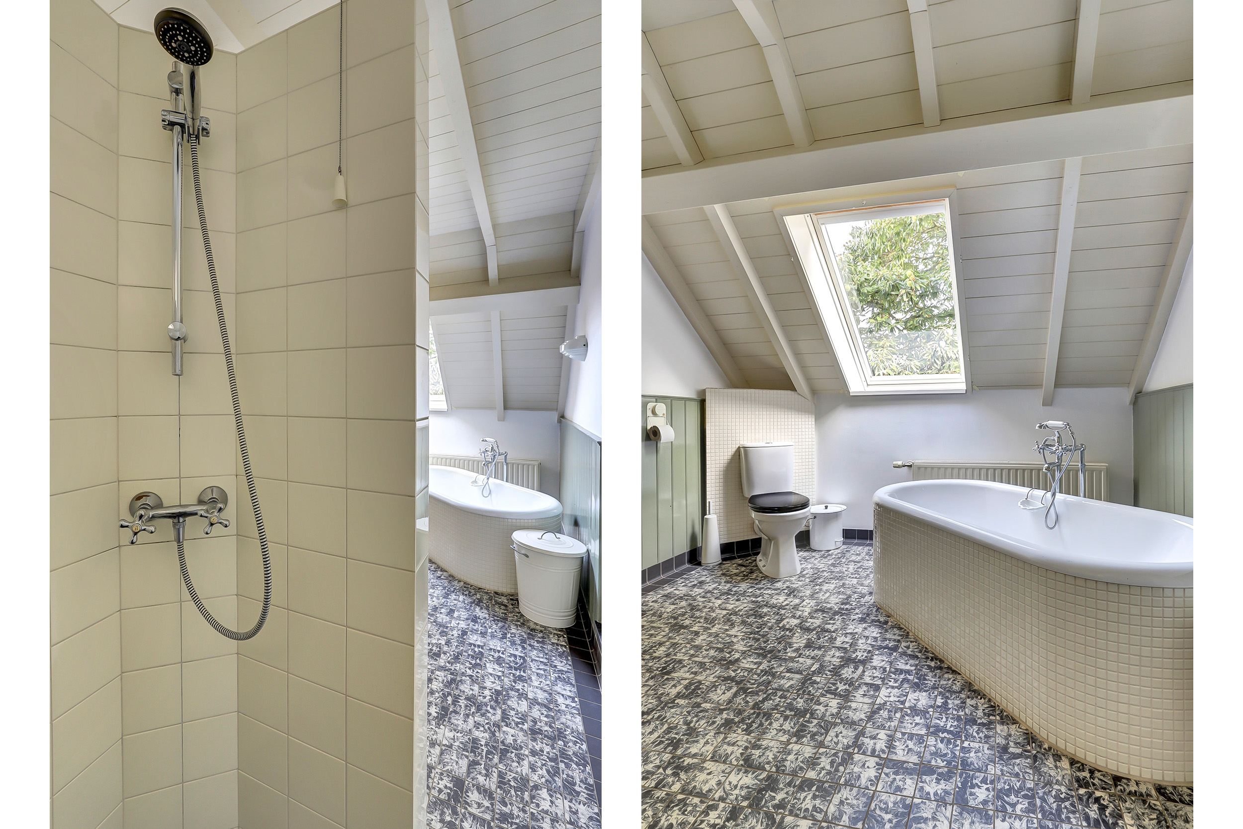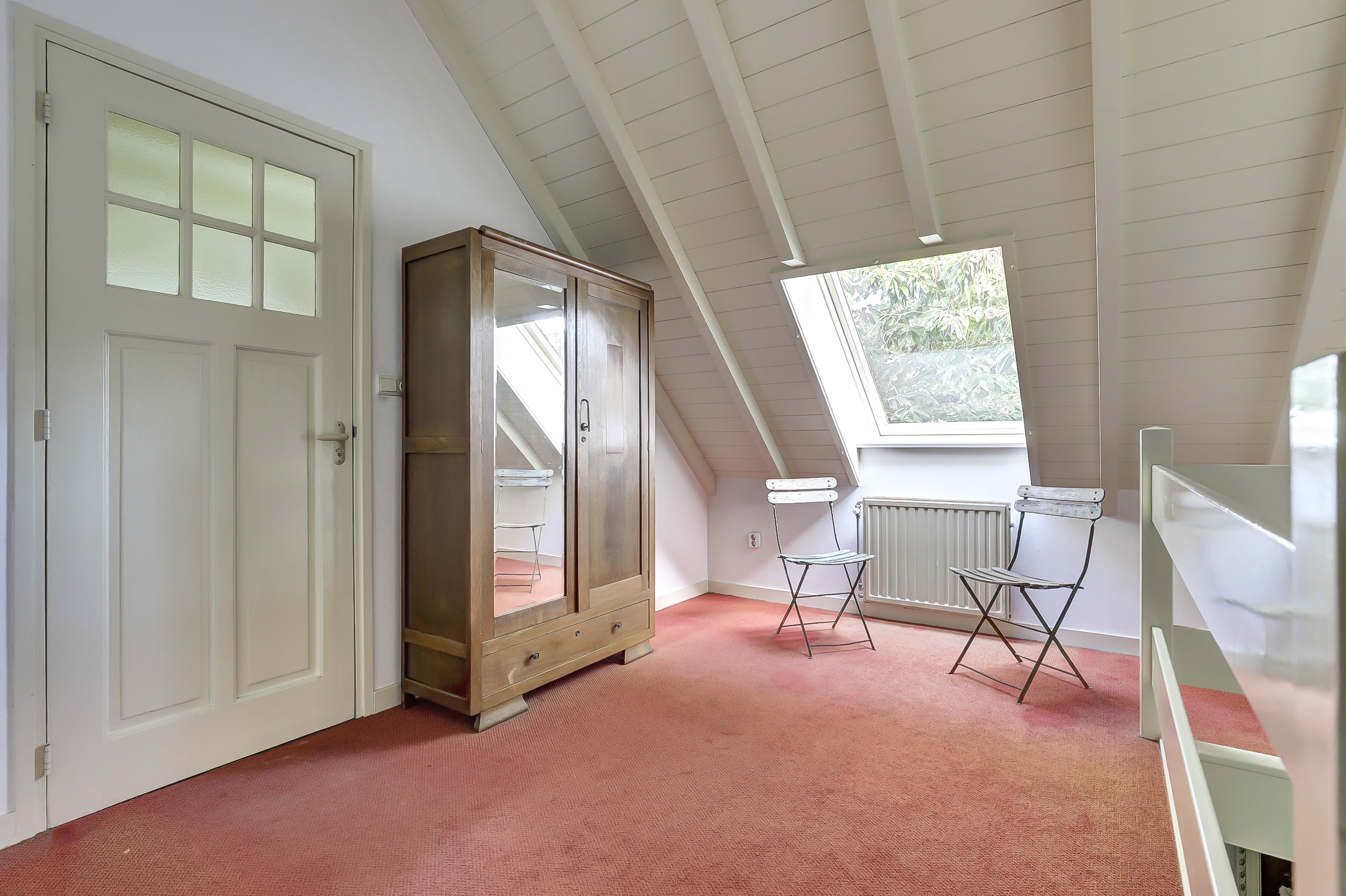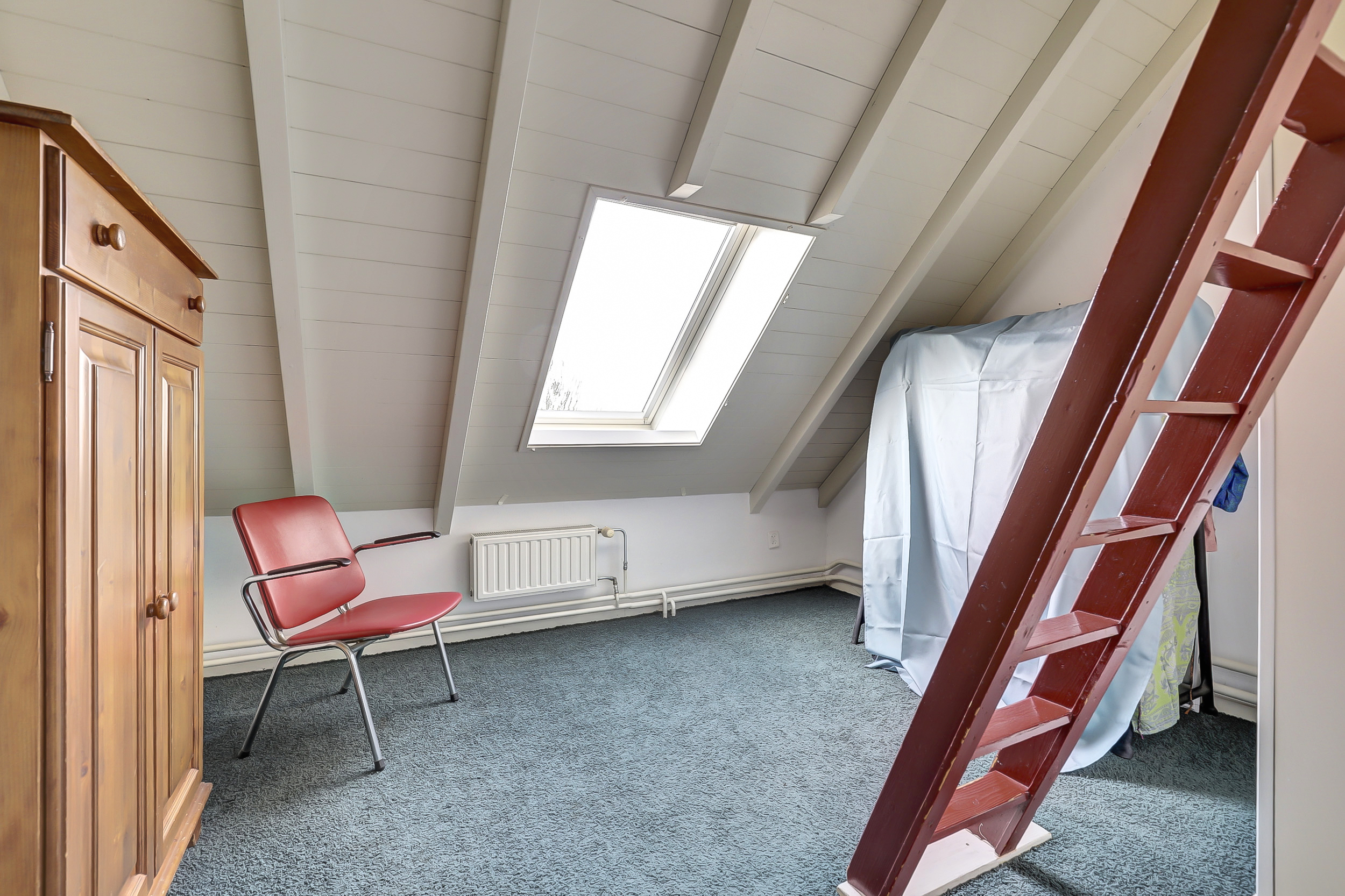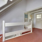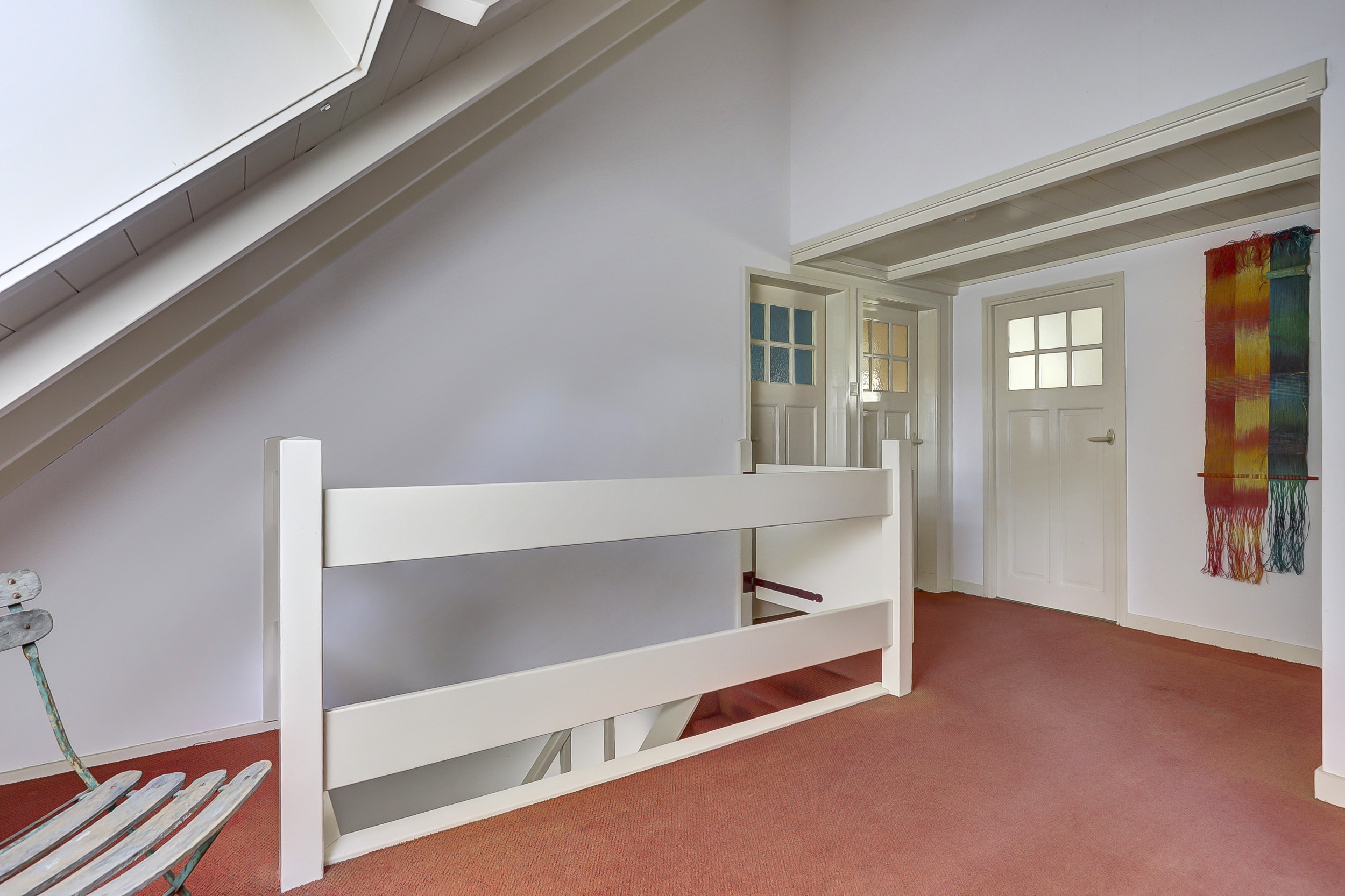 1e verdieping: overloop met cv-kast, 2 ruim bemeten slaapkamers aan de voorzijde en een 3e slaapkamer met een slaapvide. De ruime badkamer is voorzien van ligbad, toilet, douche en dubbele wastafel. Een overloop met royale master-bedroom voorzien van 2 dakramen en bergkast en met toegang tot de bergzolder en toegang tot de hobbykamer/ berging aan de achterzijde.